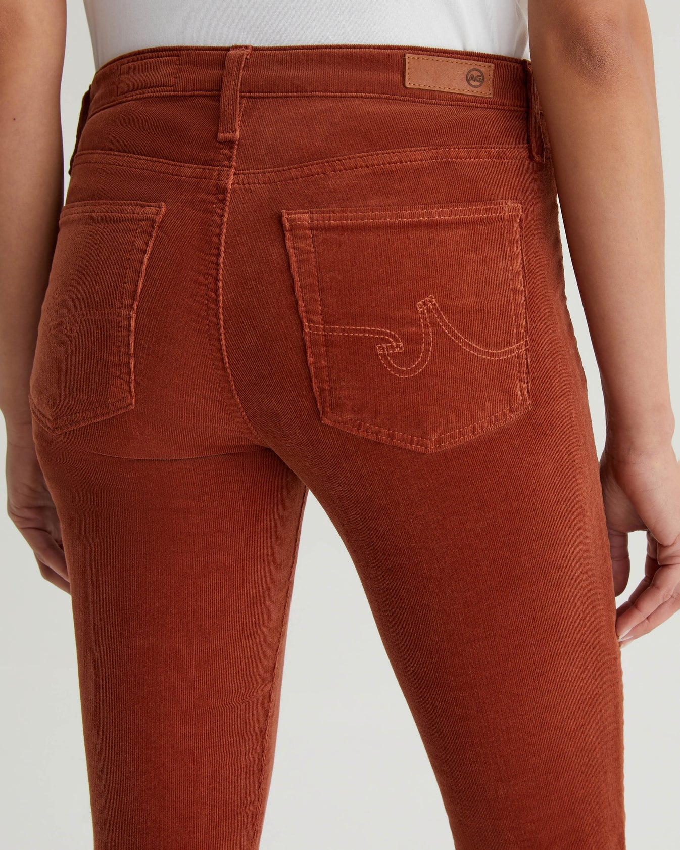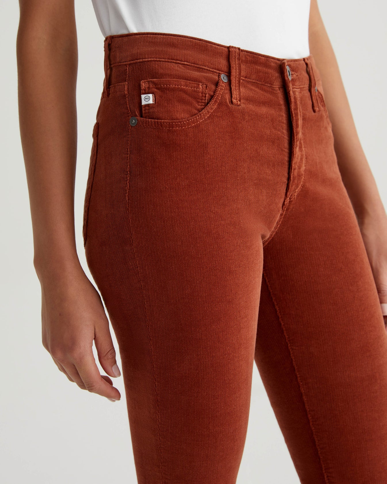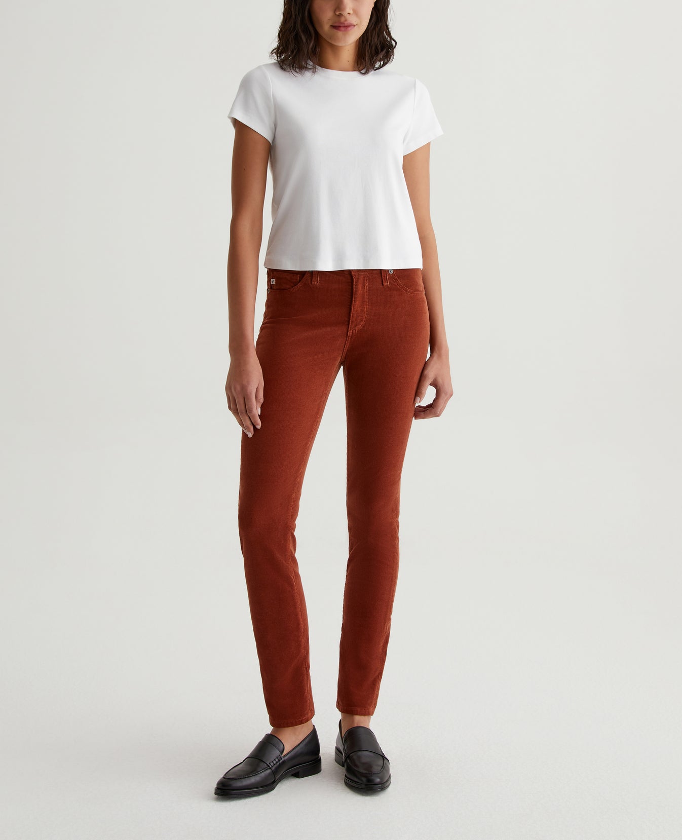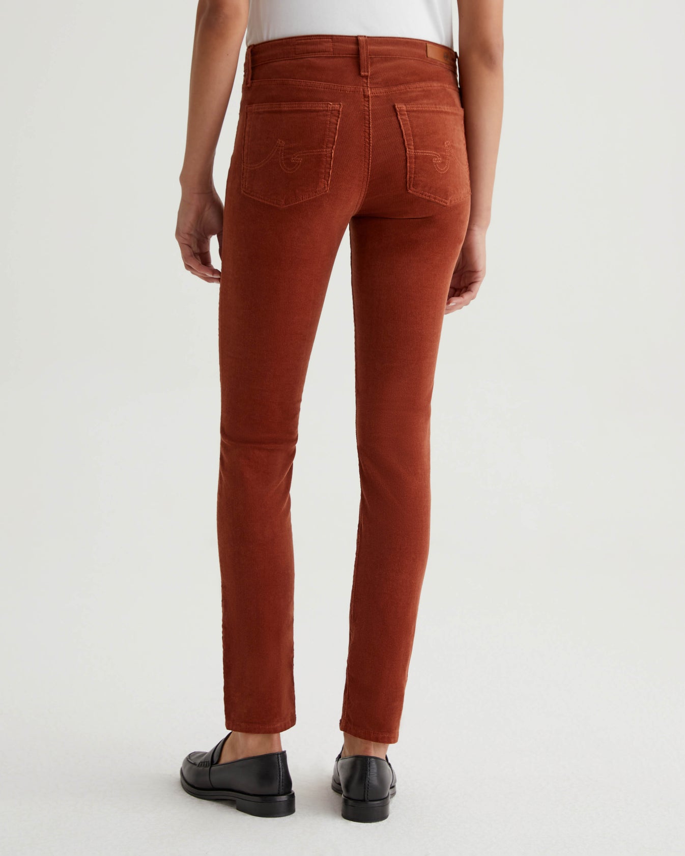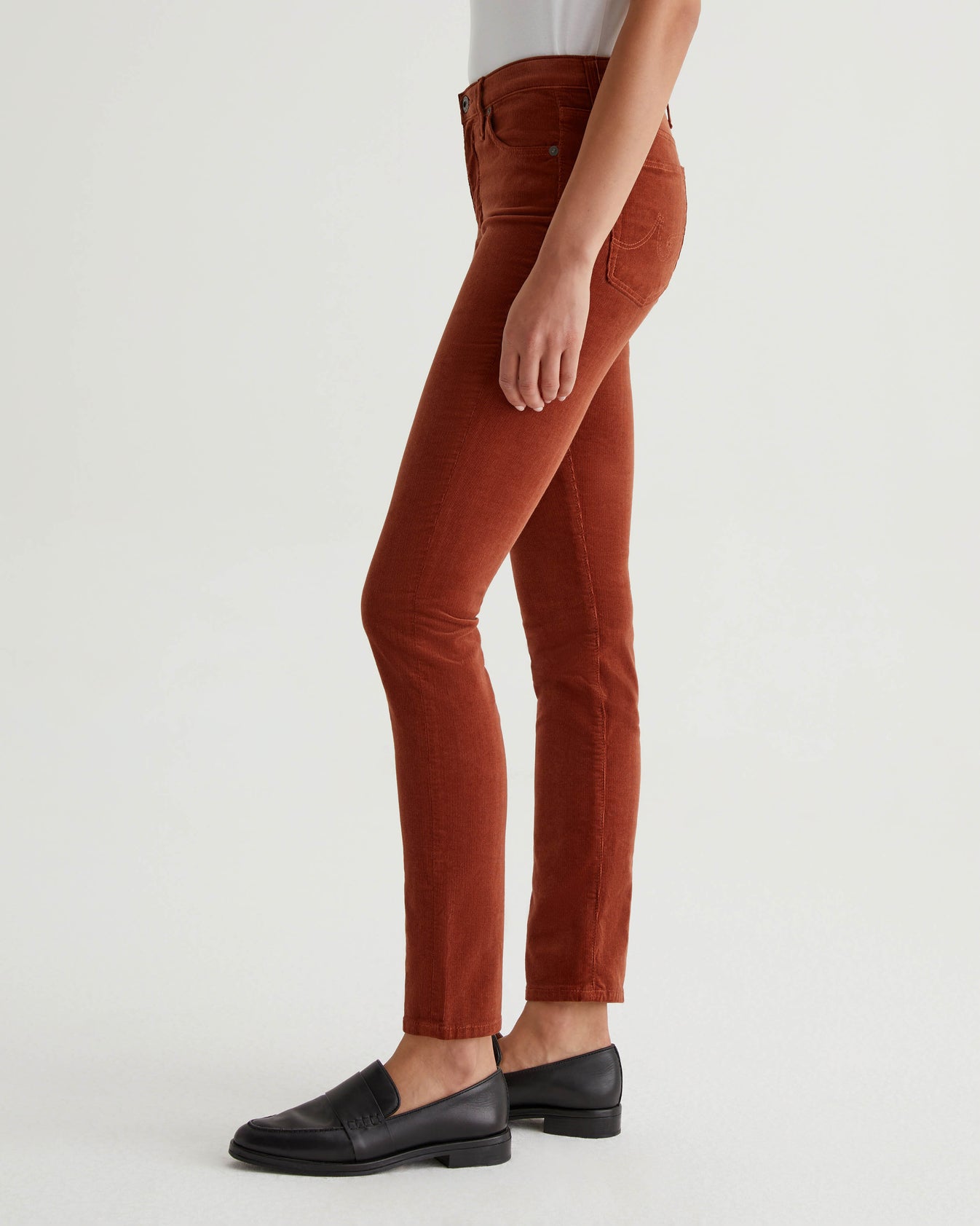 Prima is a mid-rise cigarette pant for women, featured here in 8 oz. Envy Stretch Corduroy with a rich cinnamon brown shade. It's cut with a fitted silhouette through the hips and slight tapering at the legs.