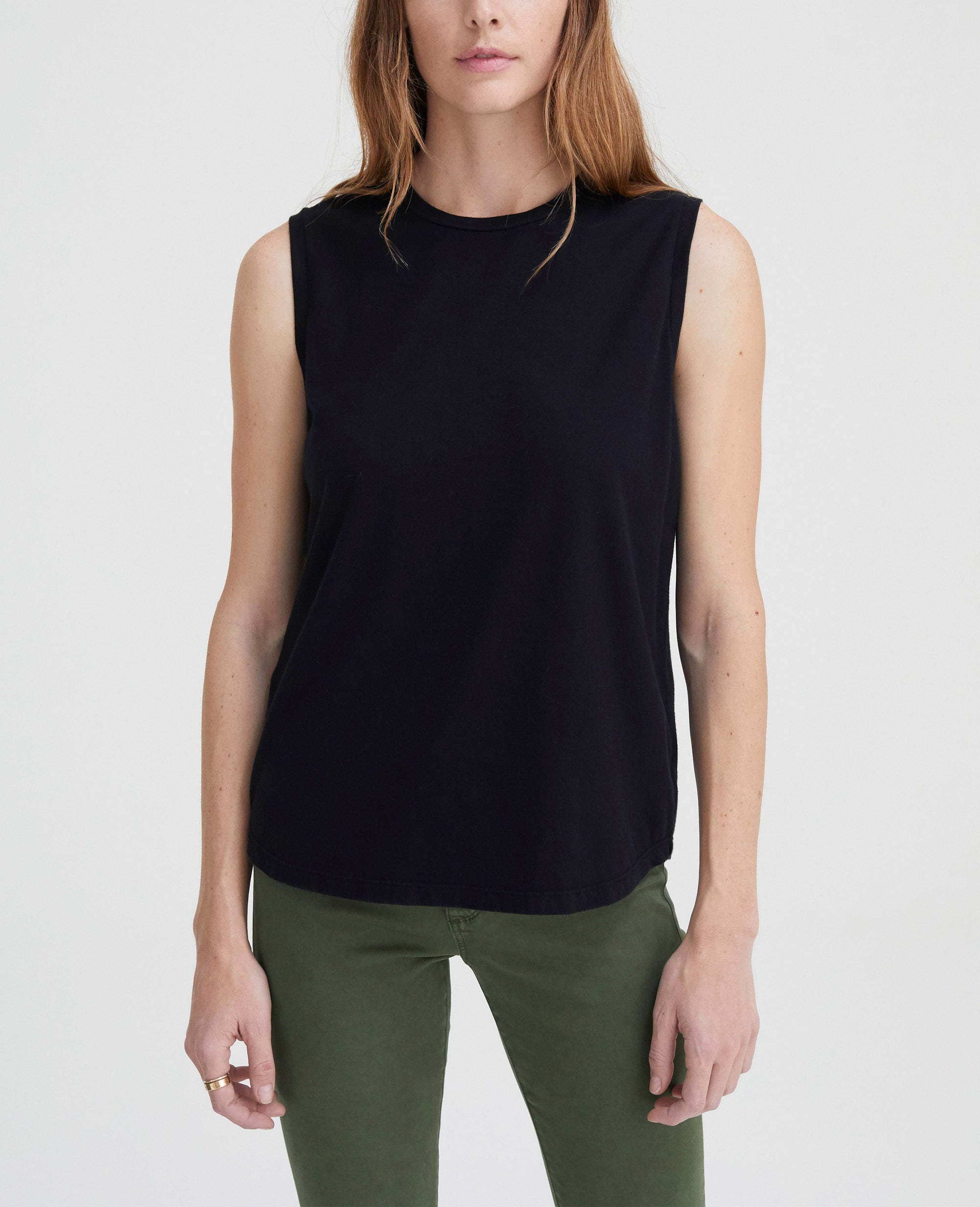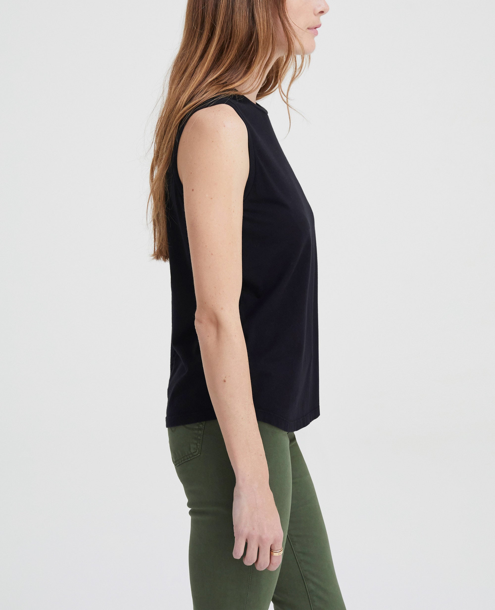 Ryker Muscle Tank for women features a true black hue, classic crew neck line, and double-tuck seam detailing at the back. This women’s tank top is designed in a lightweight, luxury jersey fabric made with pima cotton exclusively spun for extra color last, well-worn vintage feel, and an easy, slightly oversized fit.
