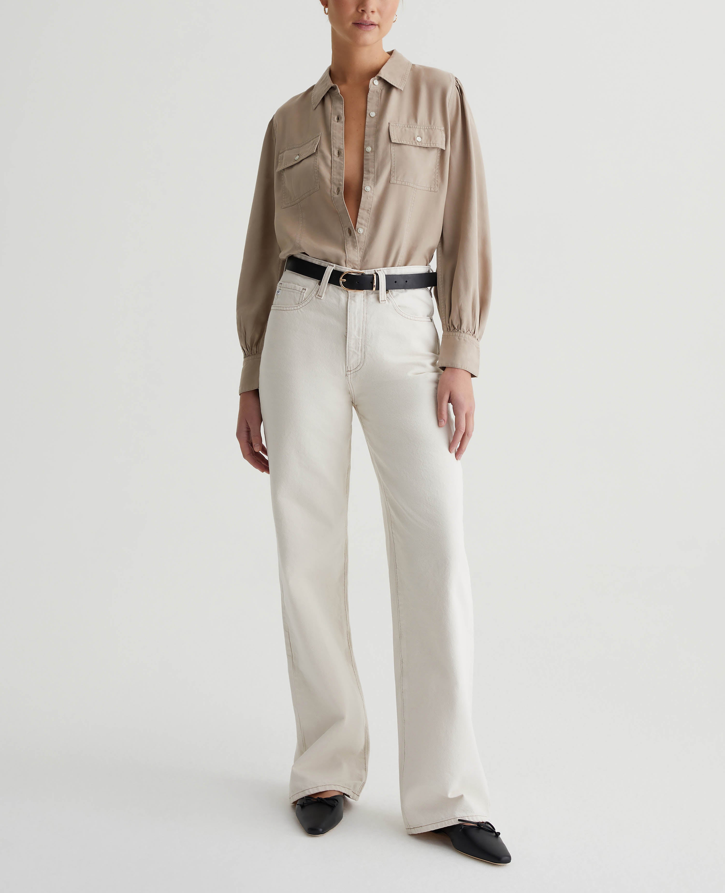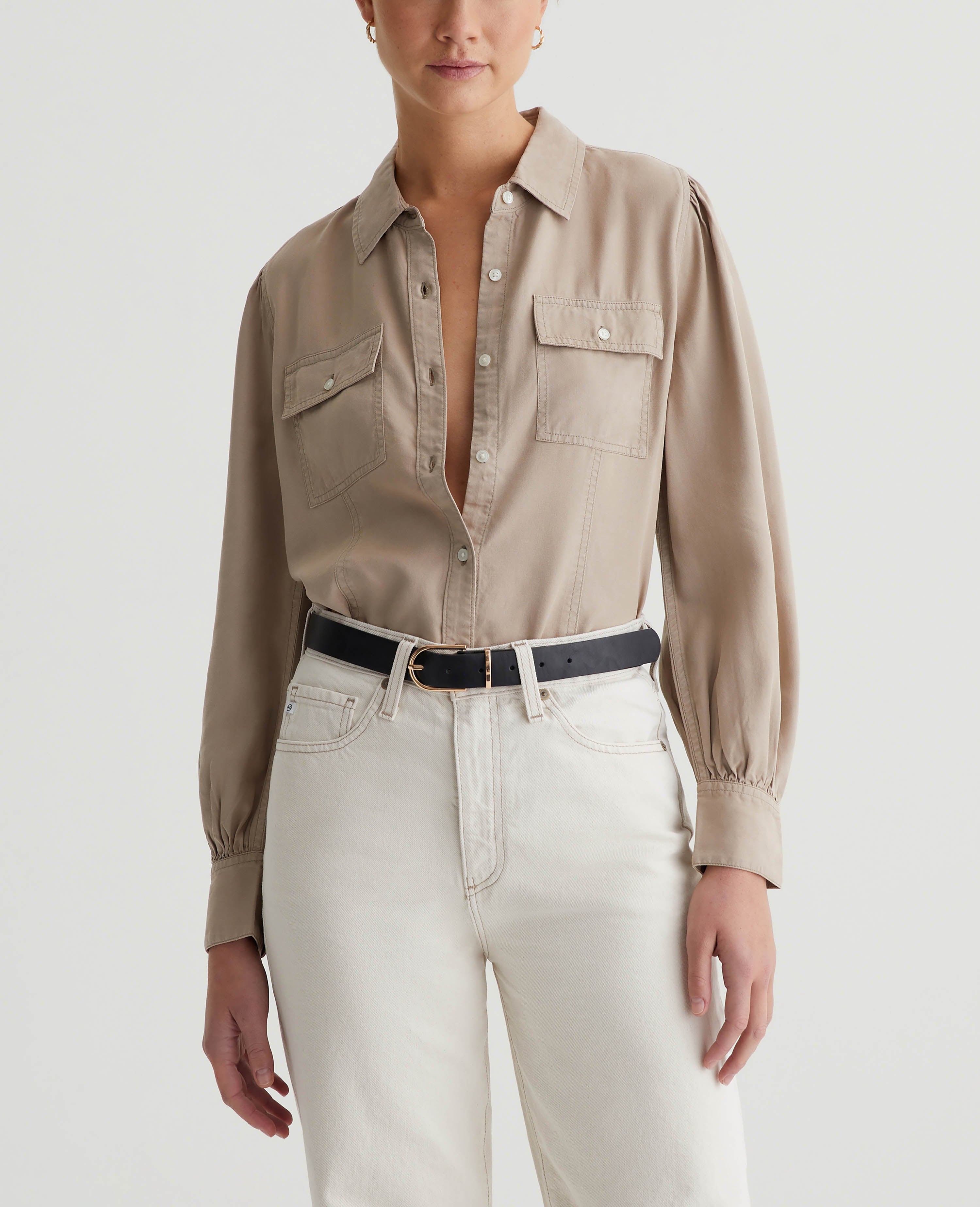 A feminine take on classic utilitarian style, the Sable Shirt comes in Luxe Tencel fabric that's soft and lightweight with an easy drape. Done in subtly faded beige, the style has gently puffed sleeves, flap pockets, and white buttons down the front.