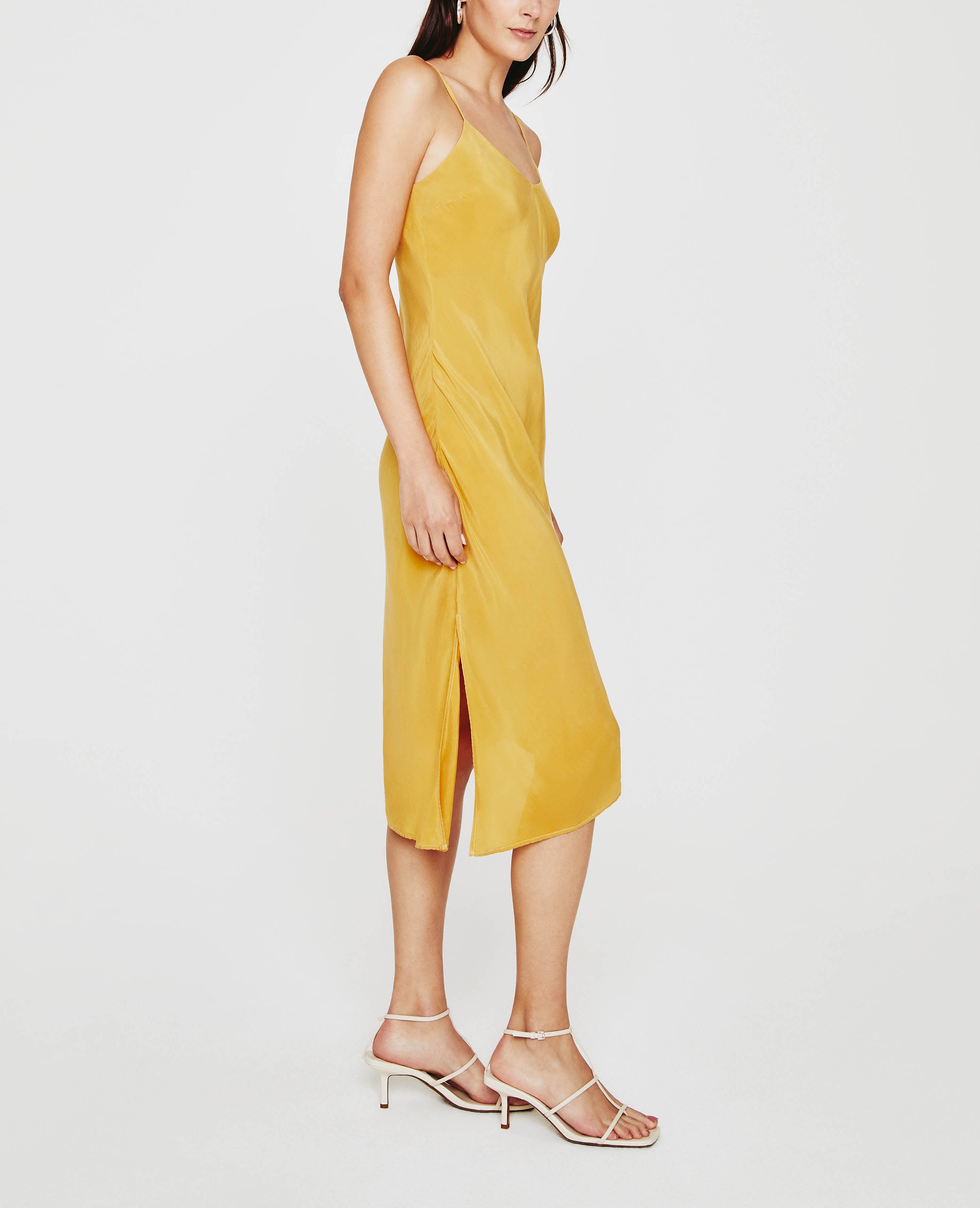 The Scarlet Dress for women is a slinky slip dress that's cut on the bias for a flowy, body-skimming fit. Done in a golden yellow color, it's made from 100% Cupro Silk, a sustainable plant-based silk with a brushed satin hand feel and an elevated sheen. This cami dress is lightweight and luxuriously minimalist, designed with adjustable spaghetti straps, a shin-length asymmetrical hem, and a leg-baring side slit.
