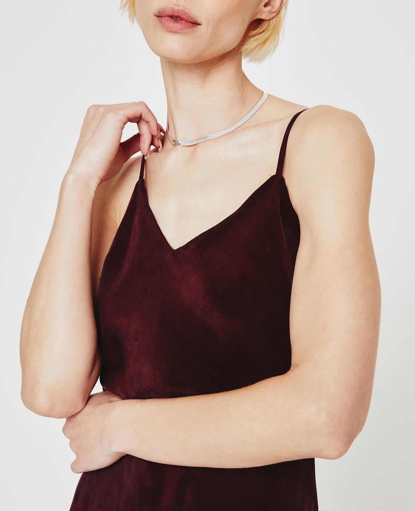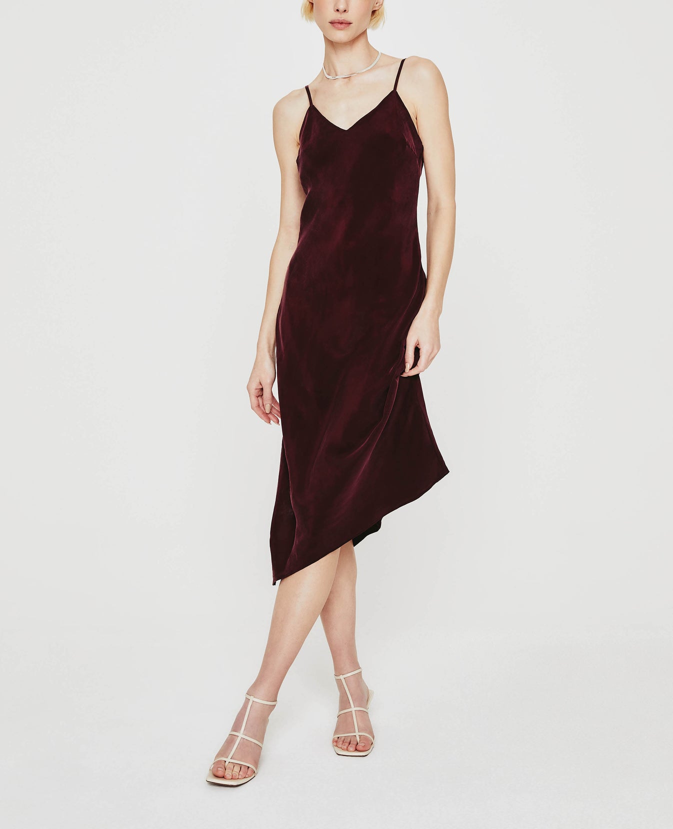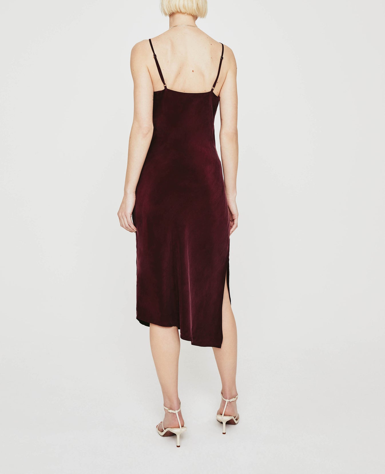 The Scarlet Dress for women is a slinky slip dress that's cut on the bias for a flowy, body-skimming fit. Done in a deep bordeaux red, it's made from 100% Cupro Silk, a sustainable plant-based silk with a brushed satin hand feel and an elevated sheen. This cami dress is lightweight and luxuriously minimalist, designed with adjustable spaghetti straps, a shin-length asymmetrical hem, and a leg-baring side slit.