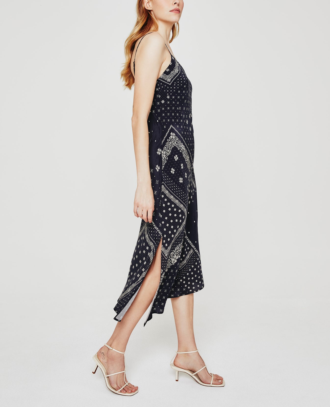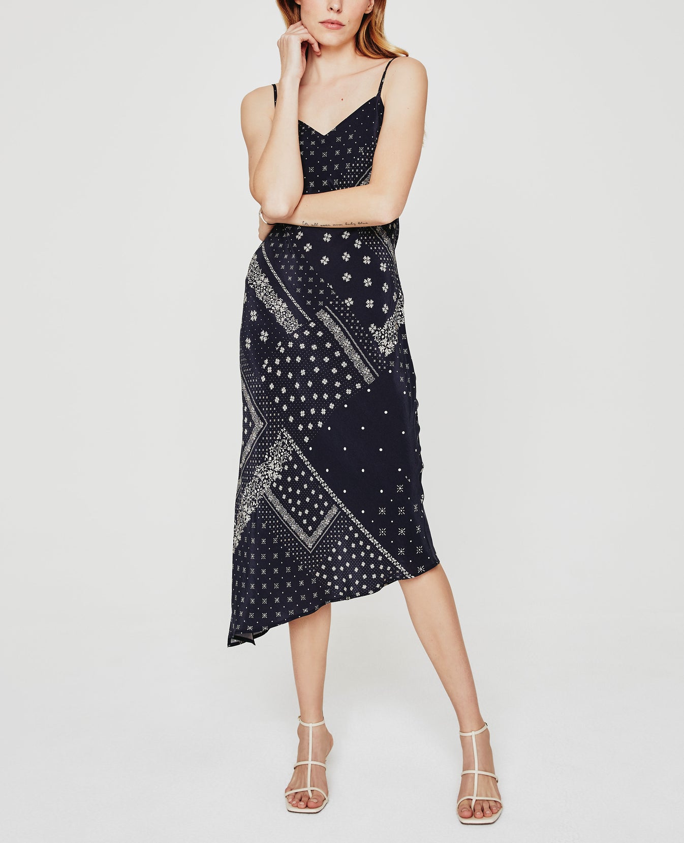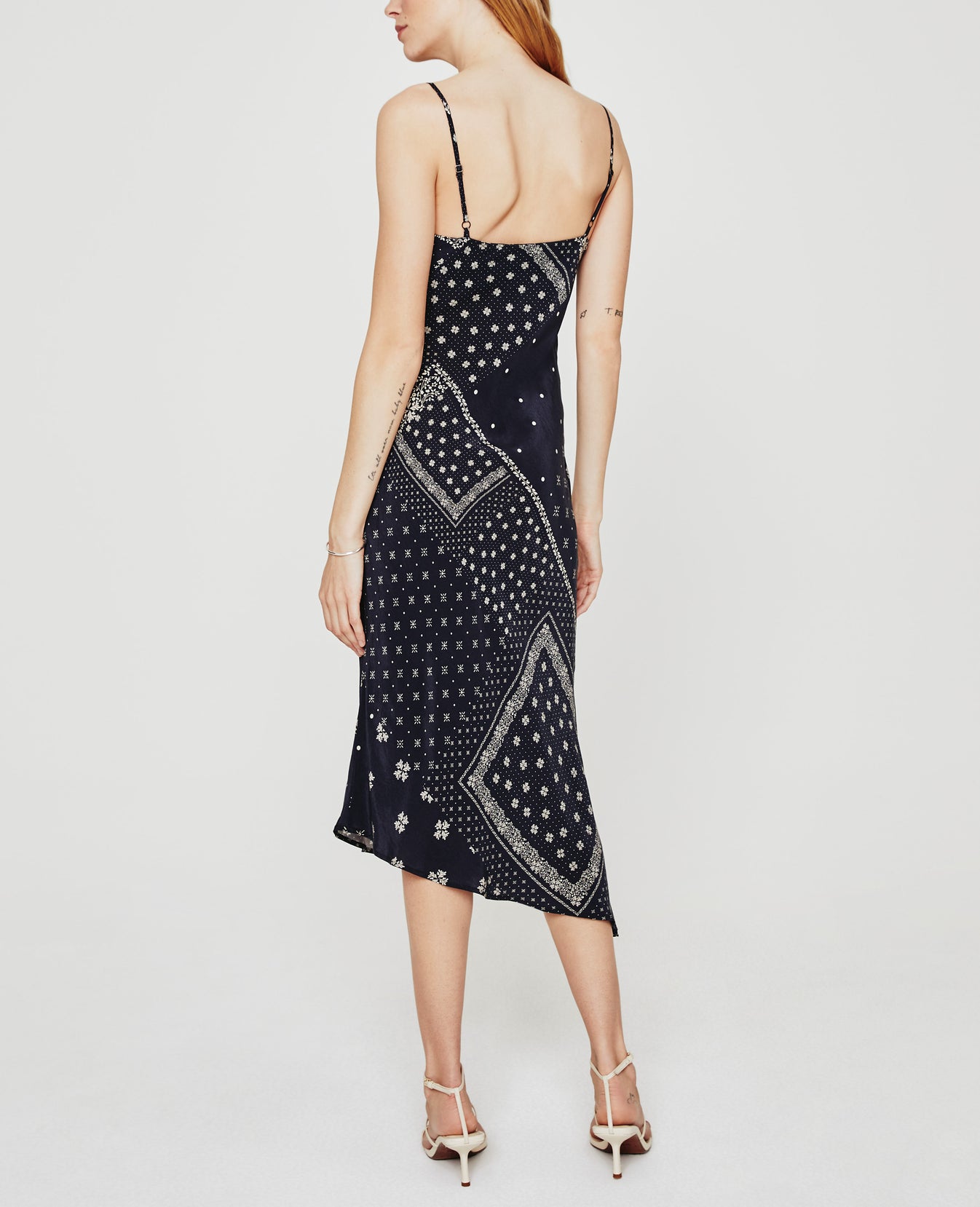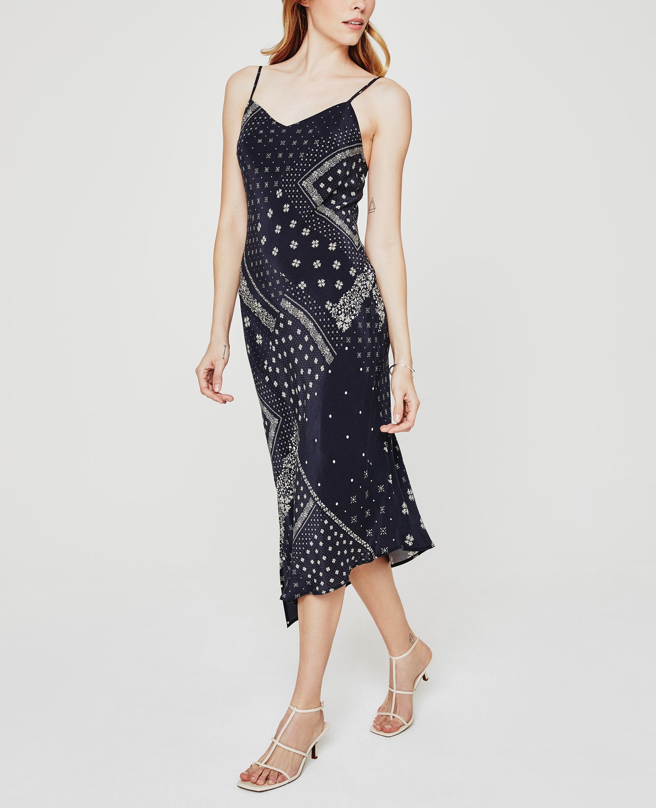 The Scarlet Dress is a slinky slip dress that's cut on the bias for a breezy, curve-skimming fit. Done in a navy bandana print, it's crafted from 100% Cupro Silk, a sustainable silk alternative with a brushed satin hand feel and elevated sheen. This cami dress is luxuriously minimalist, designed with adjustable spaghetti straps, a shin-length asymmetrical hem, and an alluring side slit.