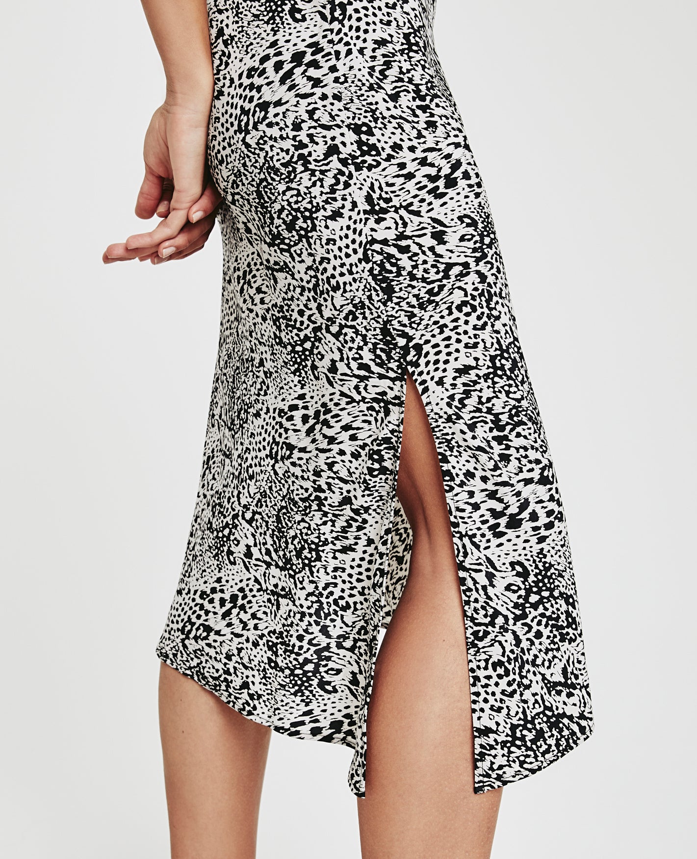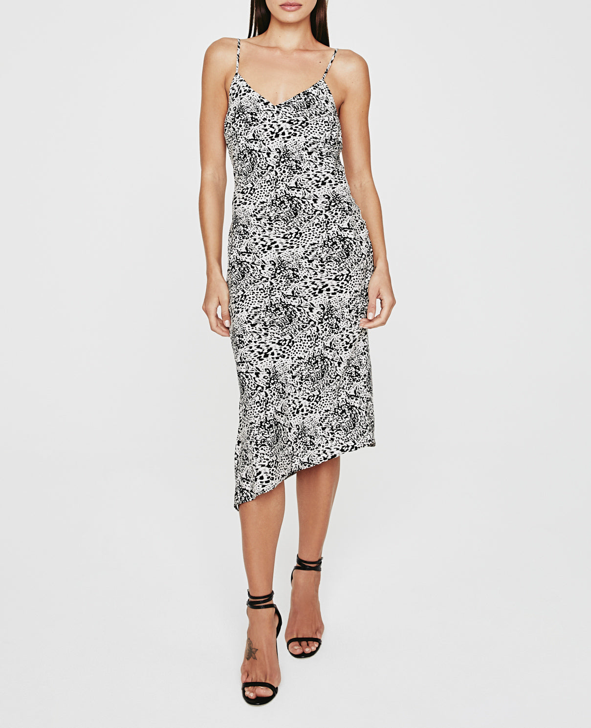 The Scarlet Dress for women in a luxurious, sophisticated spotted print that blends creamy white and black hues. The dress is designed in 100% Fine Luxe Cupro, an elevated cupro fabric with a brushed satin hand feel made from 100% Cupro. The new fabrication creates added dimension with free-flowing draping and elevated sheen.