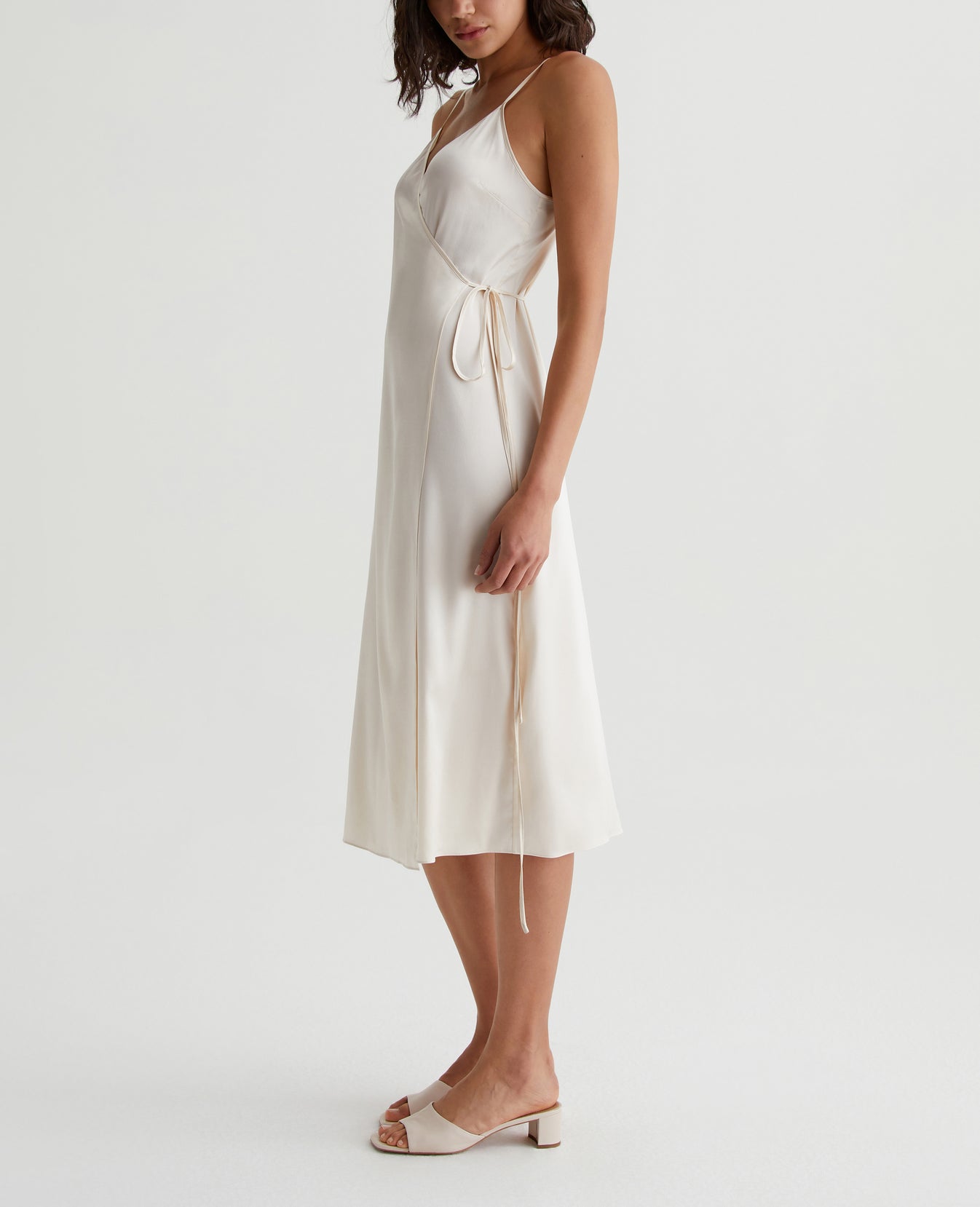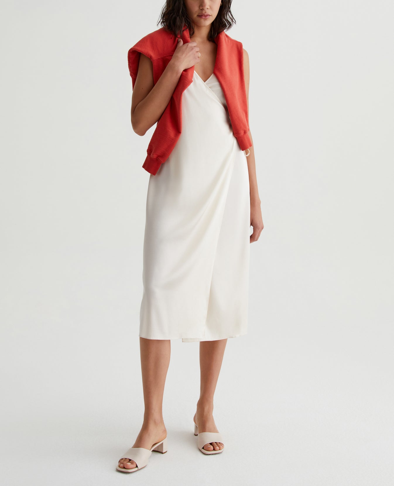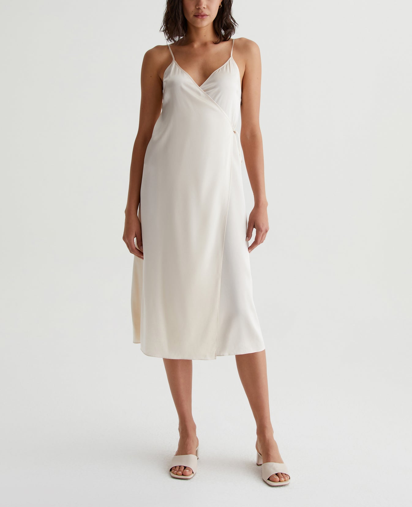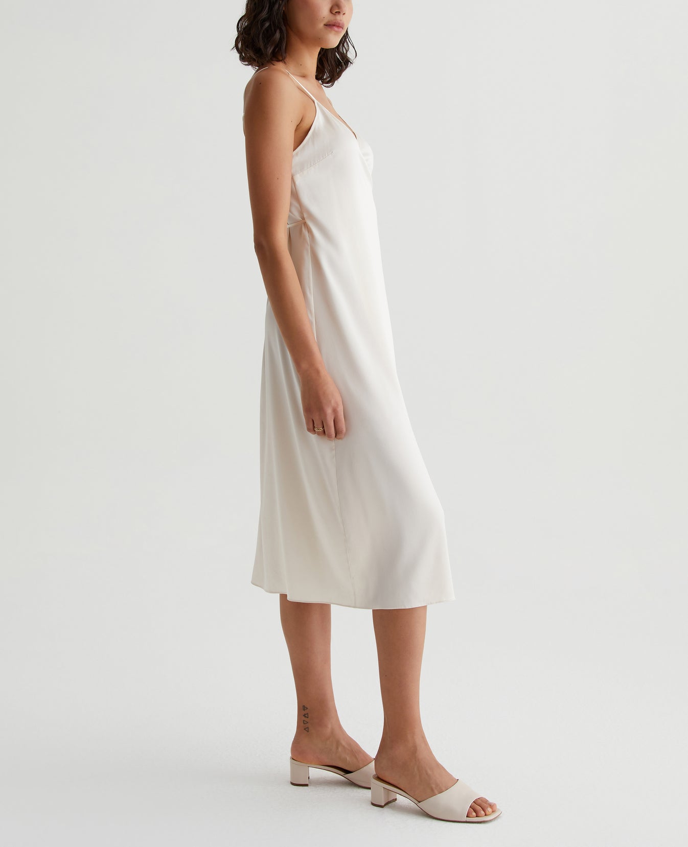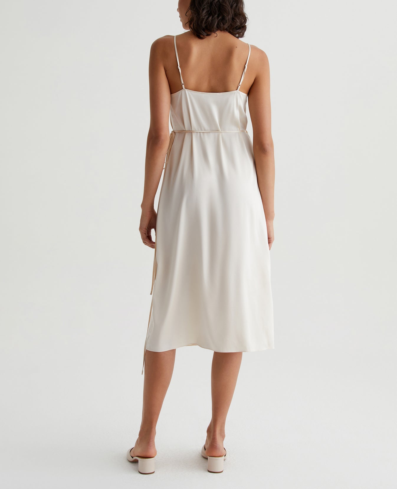 The Seah Dress is made from luxe stretch silk in clean, fresh white. Simple and effortless, this minimalist style falls just below the knee and features adjustable spaghetti straps and a dainty tie at the waist.