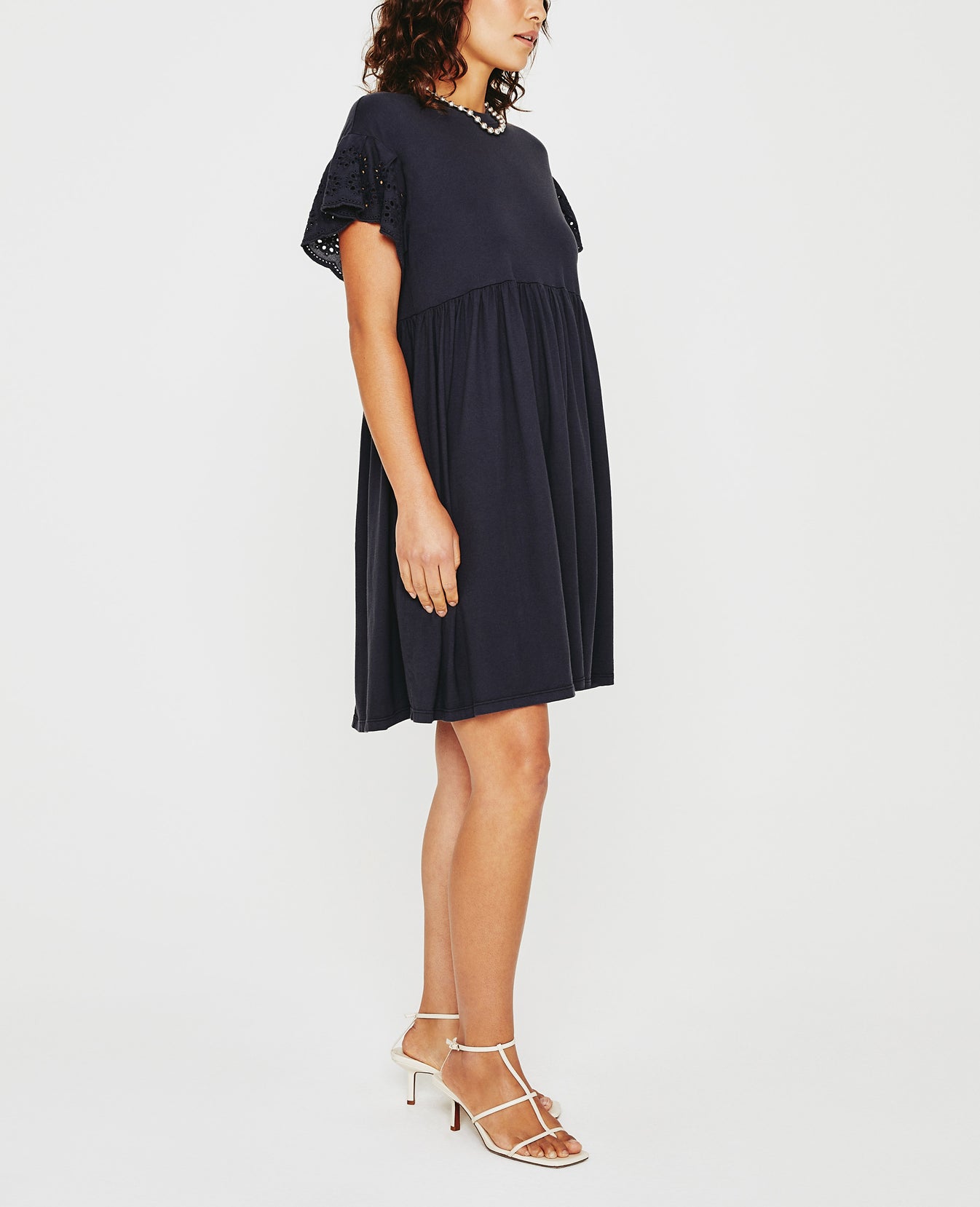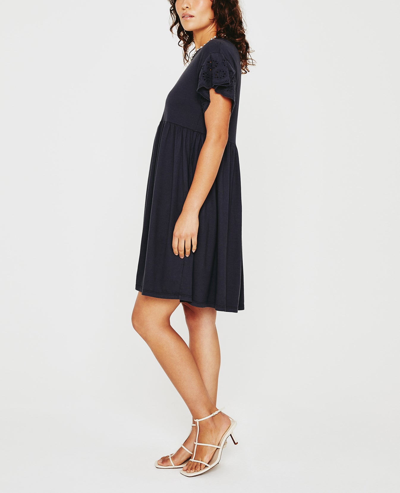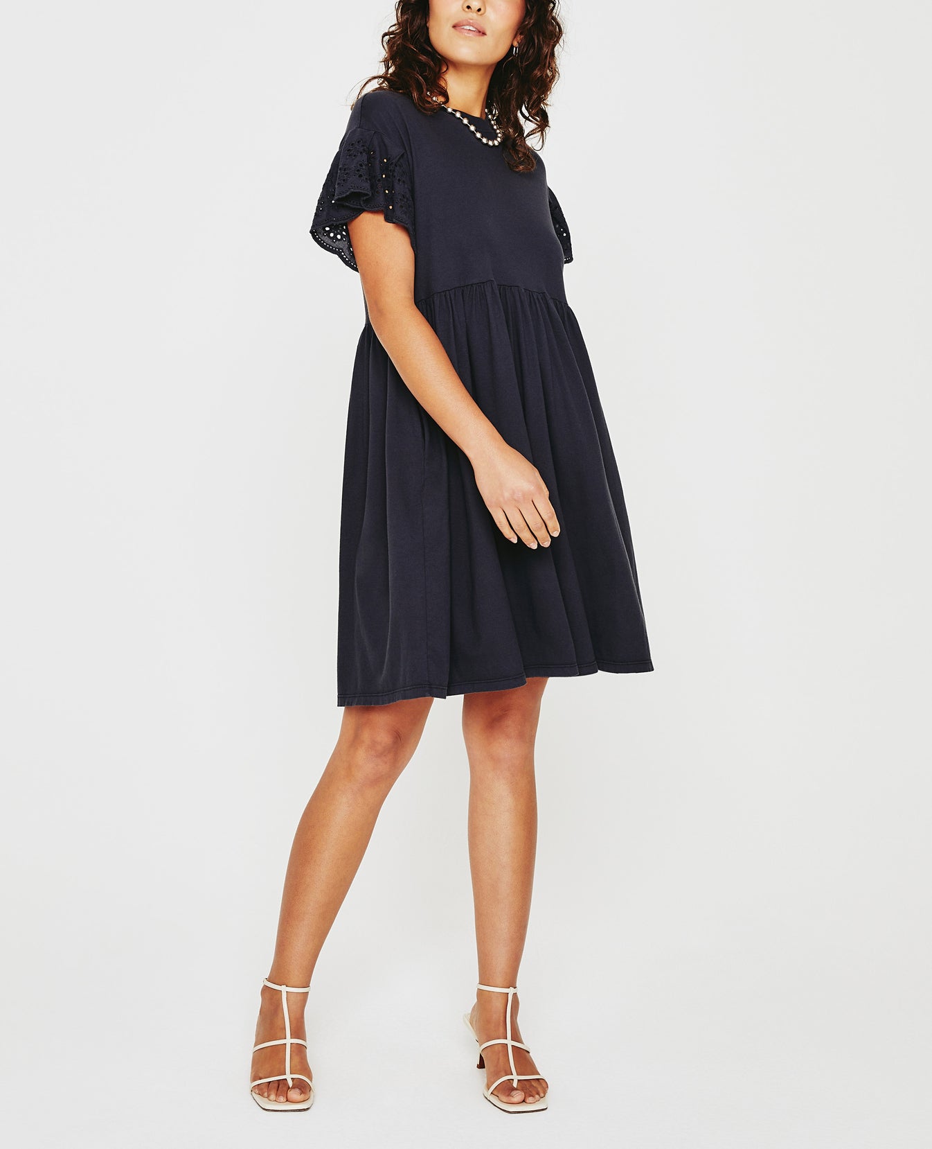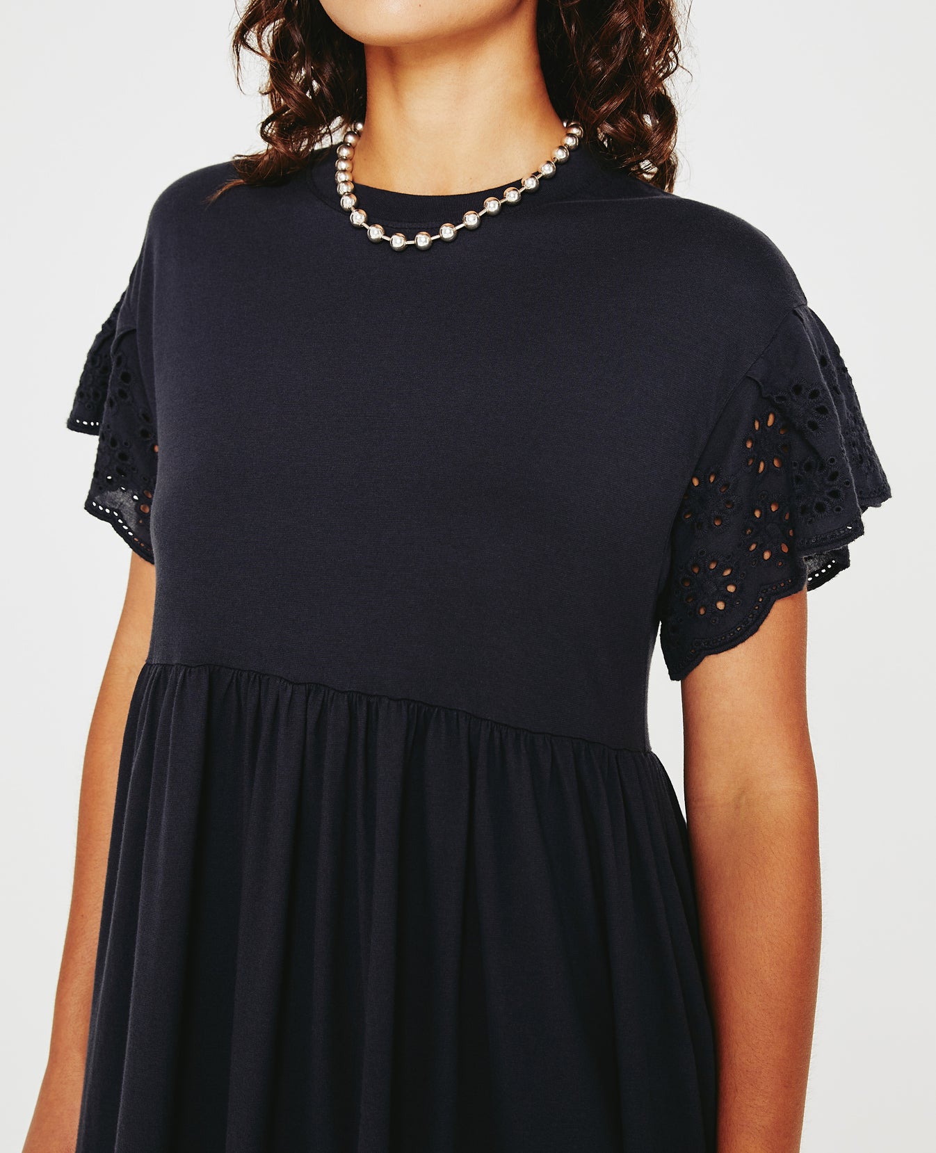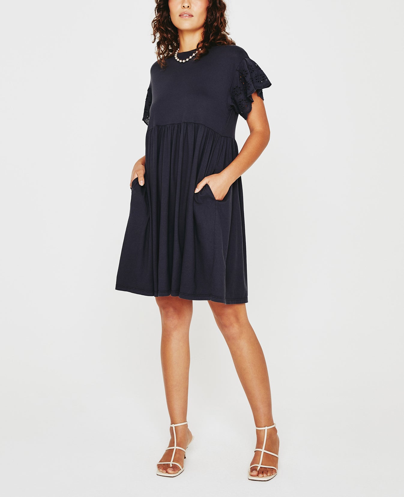 The Sena Dress is a swingy knit style that's as comfortable as your favorite tee, but way sweeter thanks to its ruffled eyelet sleeves. Made from black cotton-blend jersey, it's got a crew neckline and an easy silhouette with hidden hip pockets.