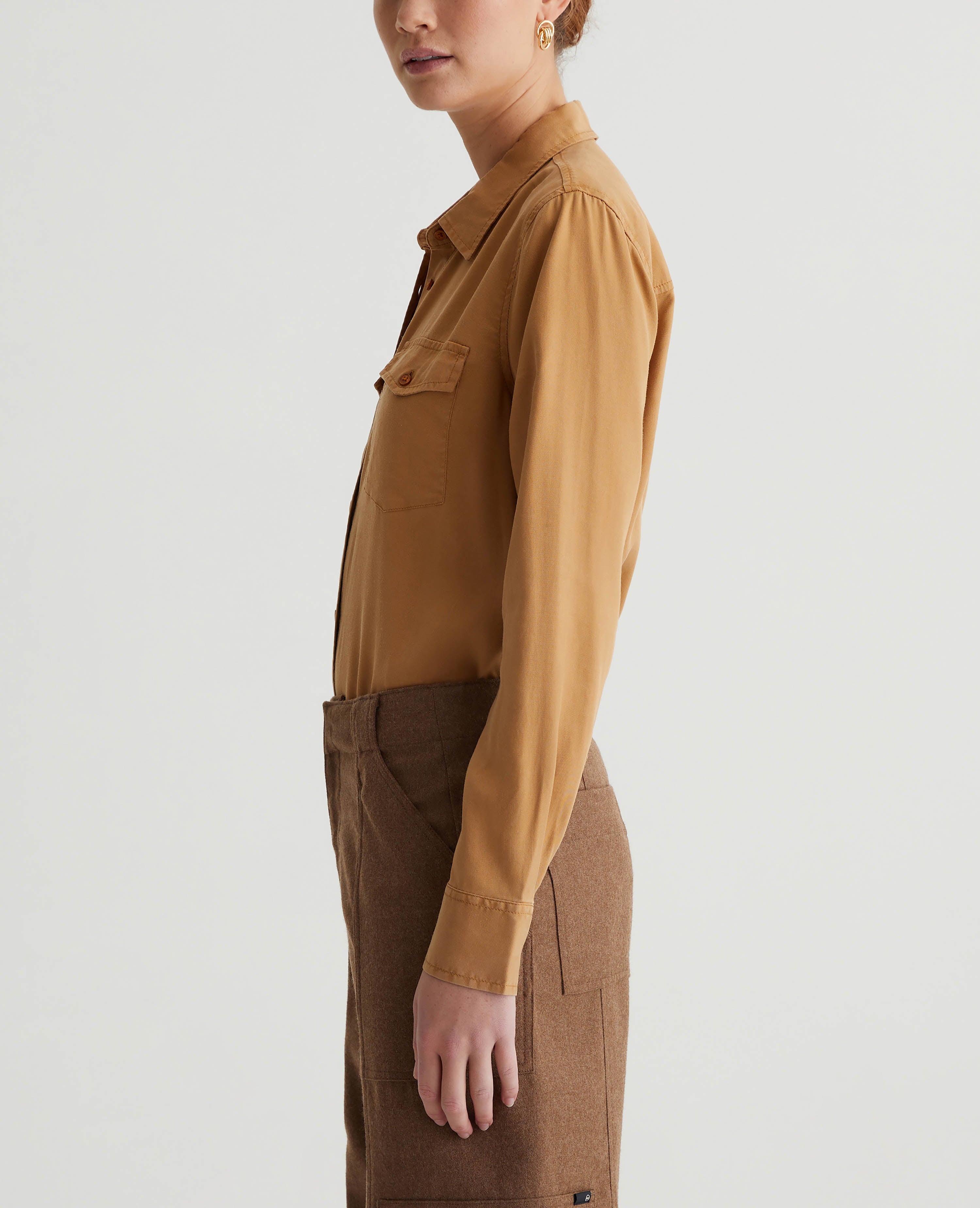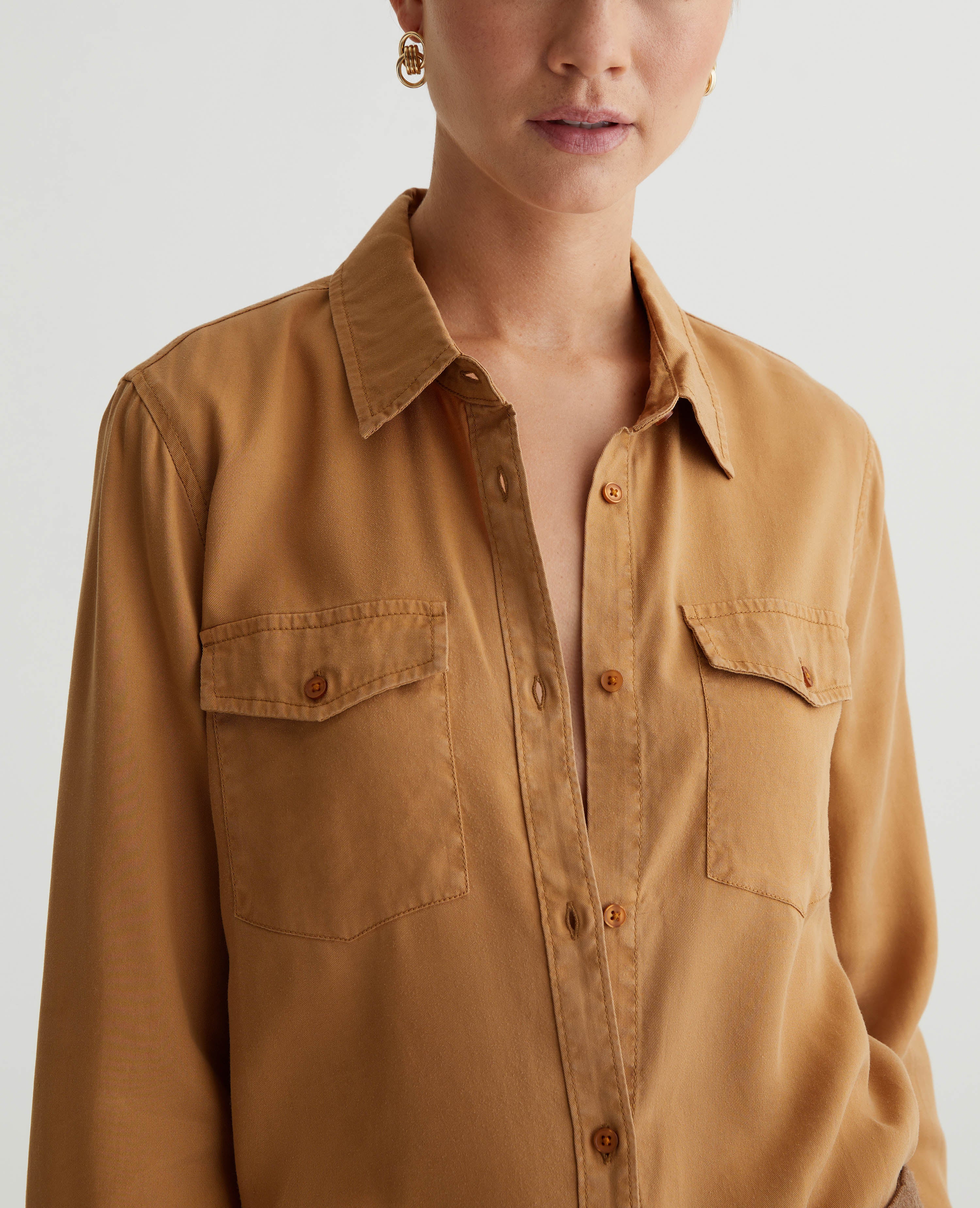 The Shiela Utility Shirt updates our classic button-up with two flap pockets at the front. The long-sleeve style is relaxed and lightweight, cut from breezy Luxe Tencel in a striking marigold color and finished with contrasting white buttons.