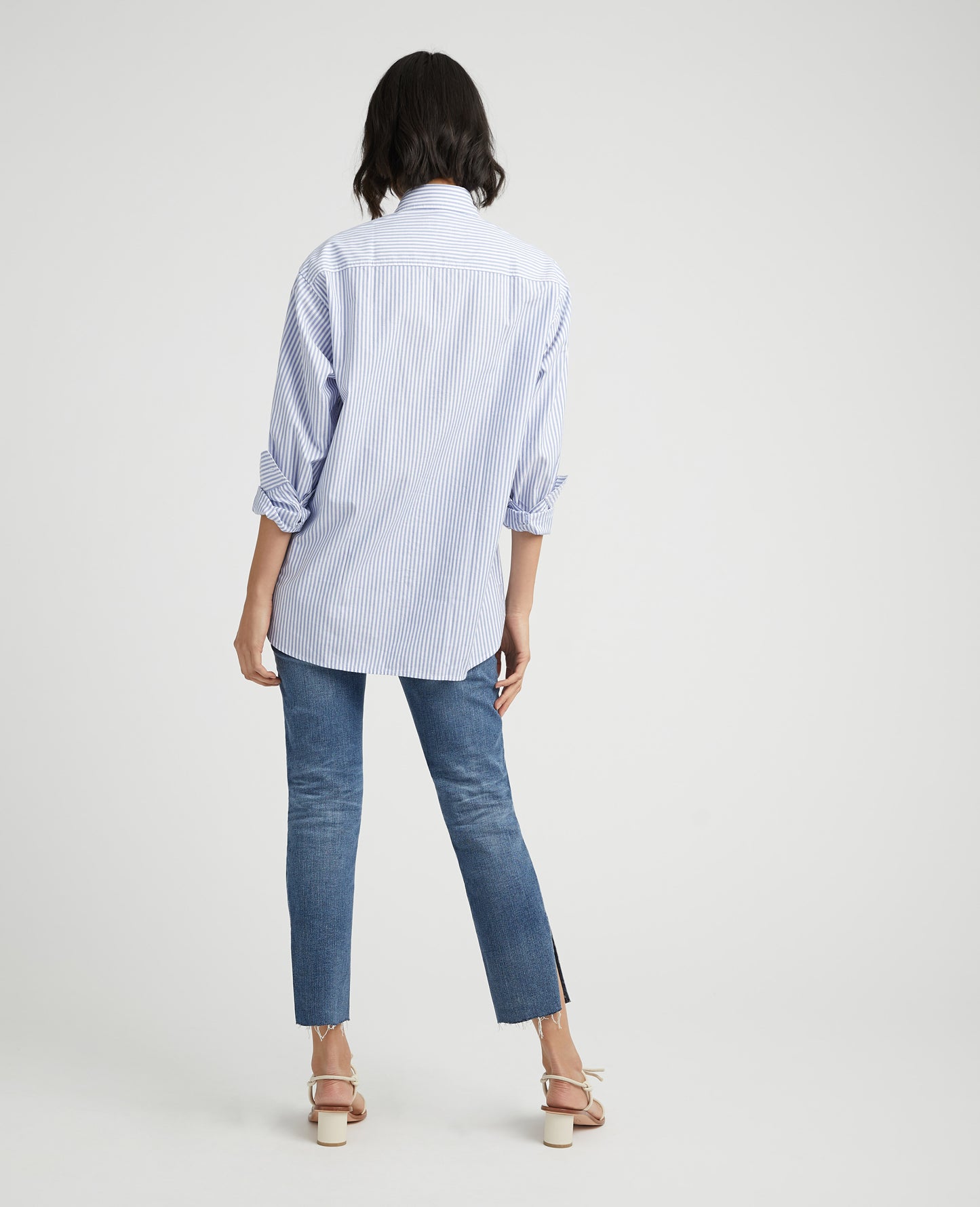 The Shiro Shirt is a menswear-inspired button-up shirt for women featuring a classic stripe pattern for smart styling and layering. The Shirt offers a pointed collar, full button closure, relaxed fit, oversized front pockets, buttoned cuffs, and a dolphin hem. This women’s button down shirt is designed in a crisp 100% cotton fabric for a clean and structured look with a slightly billowed silhouette.
