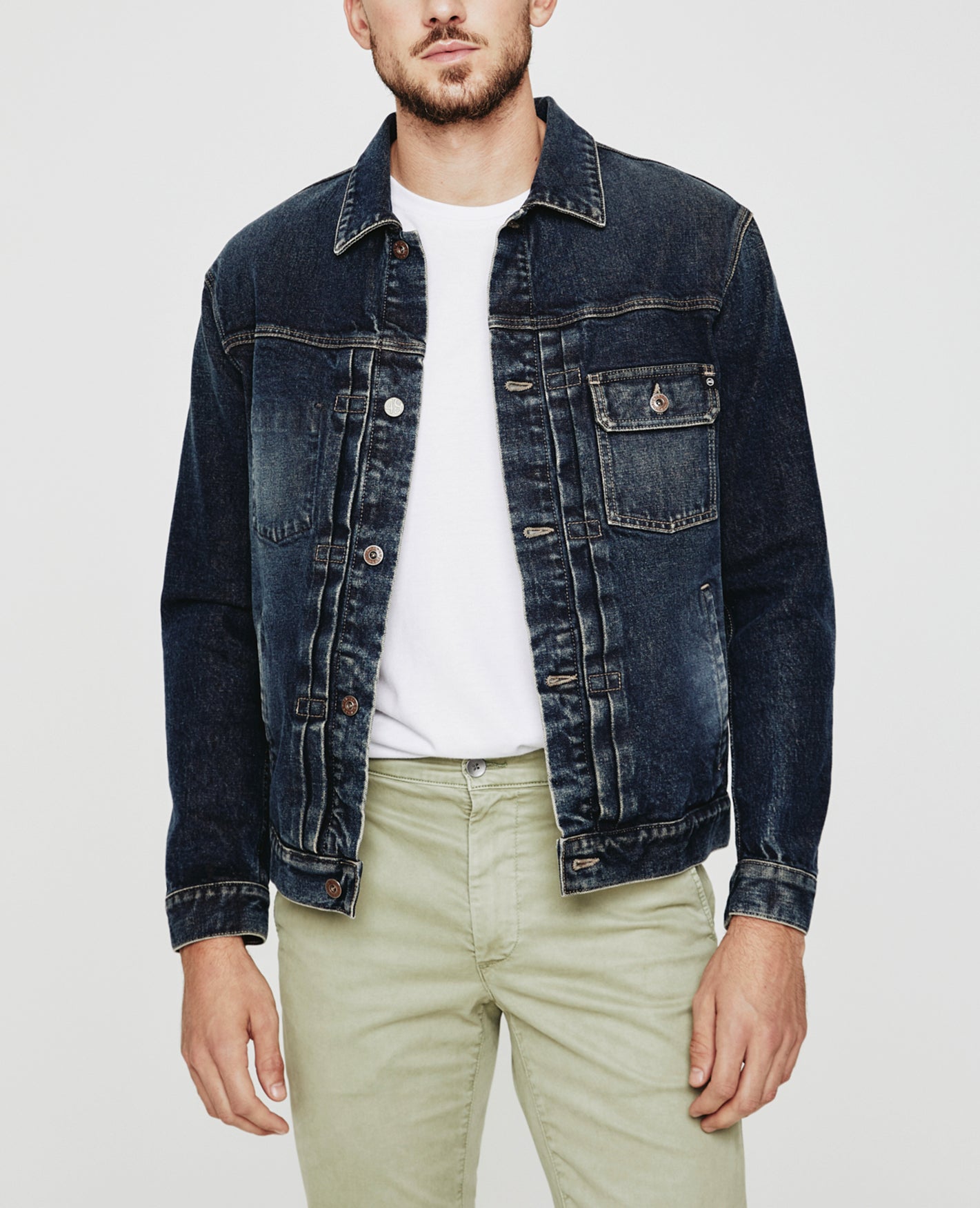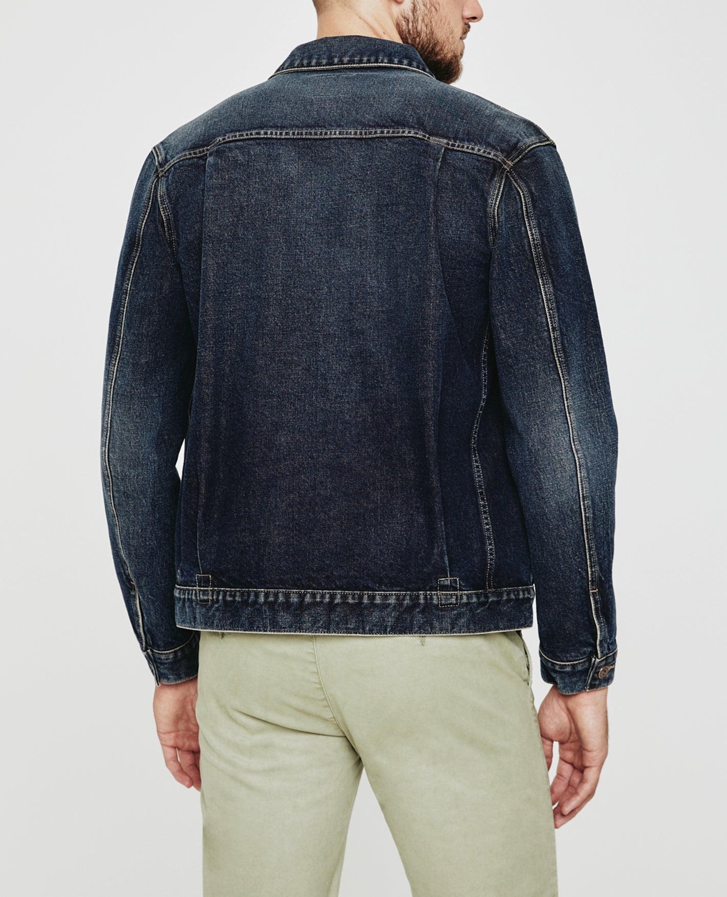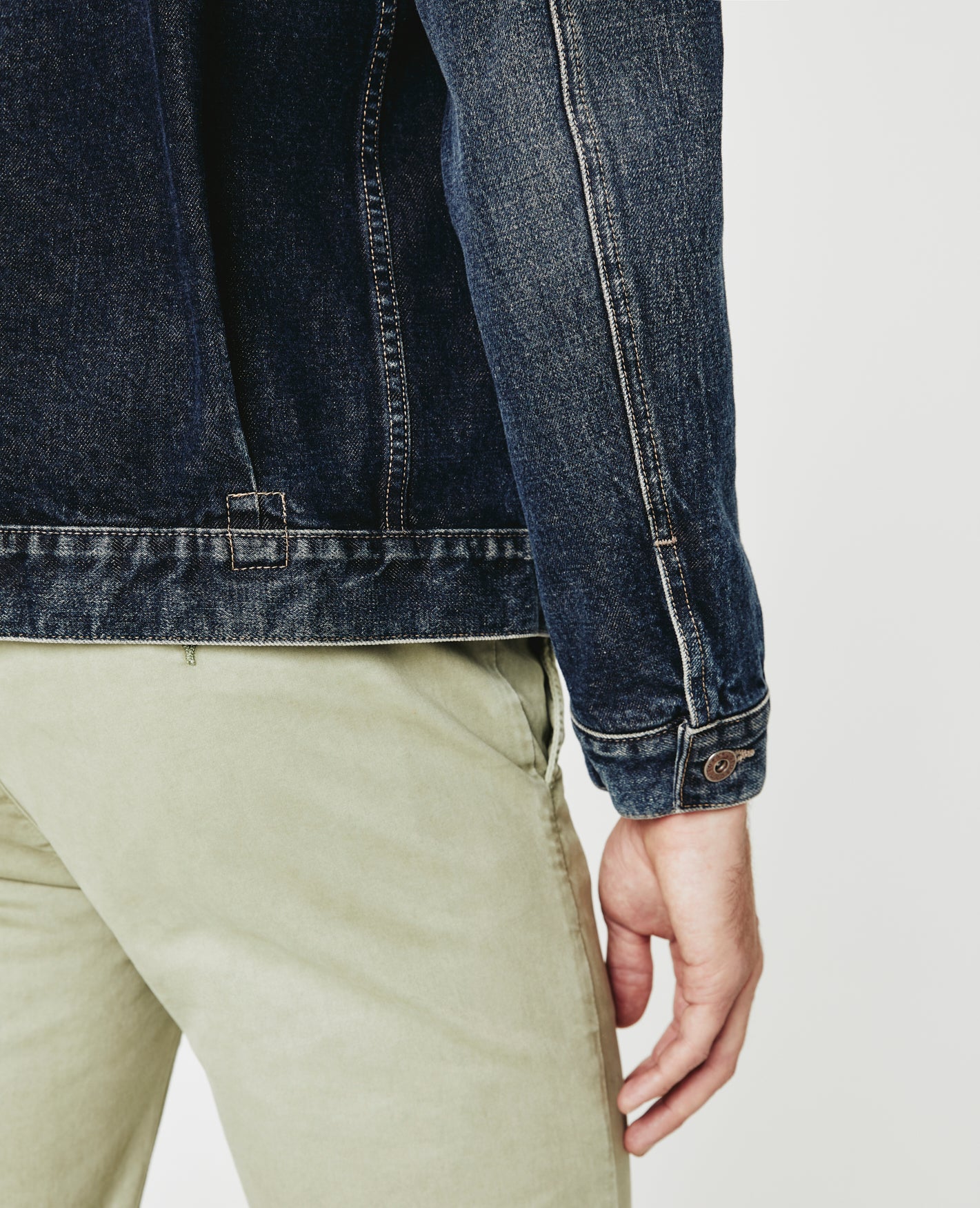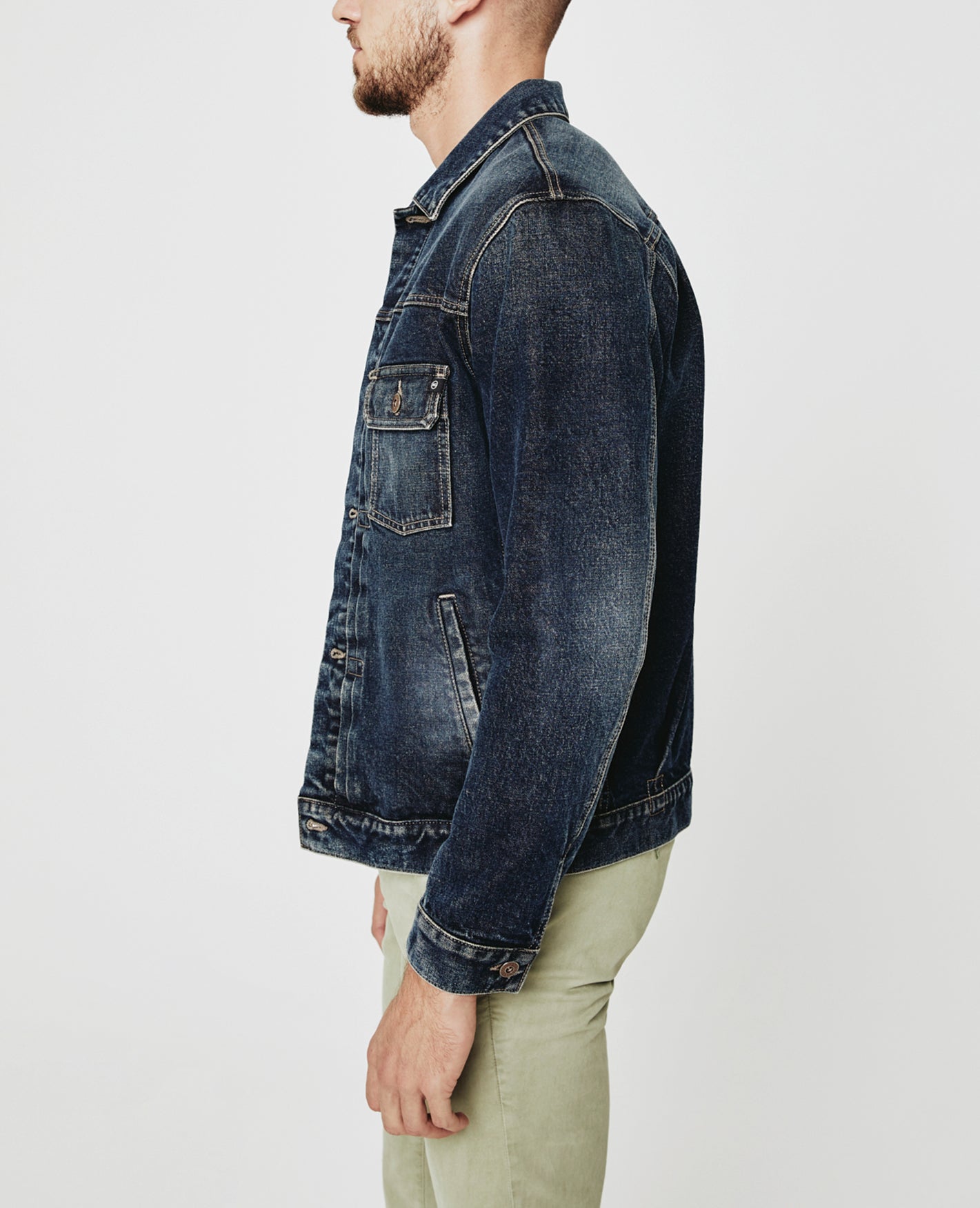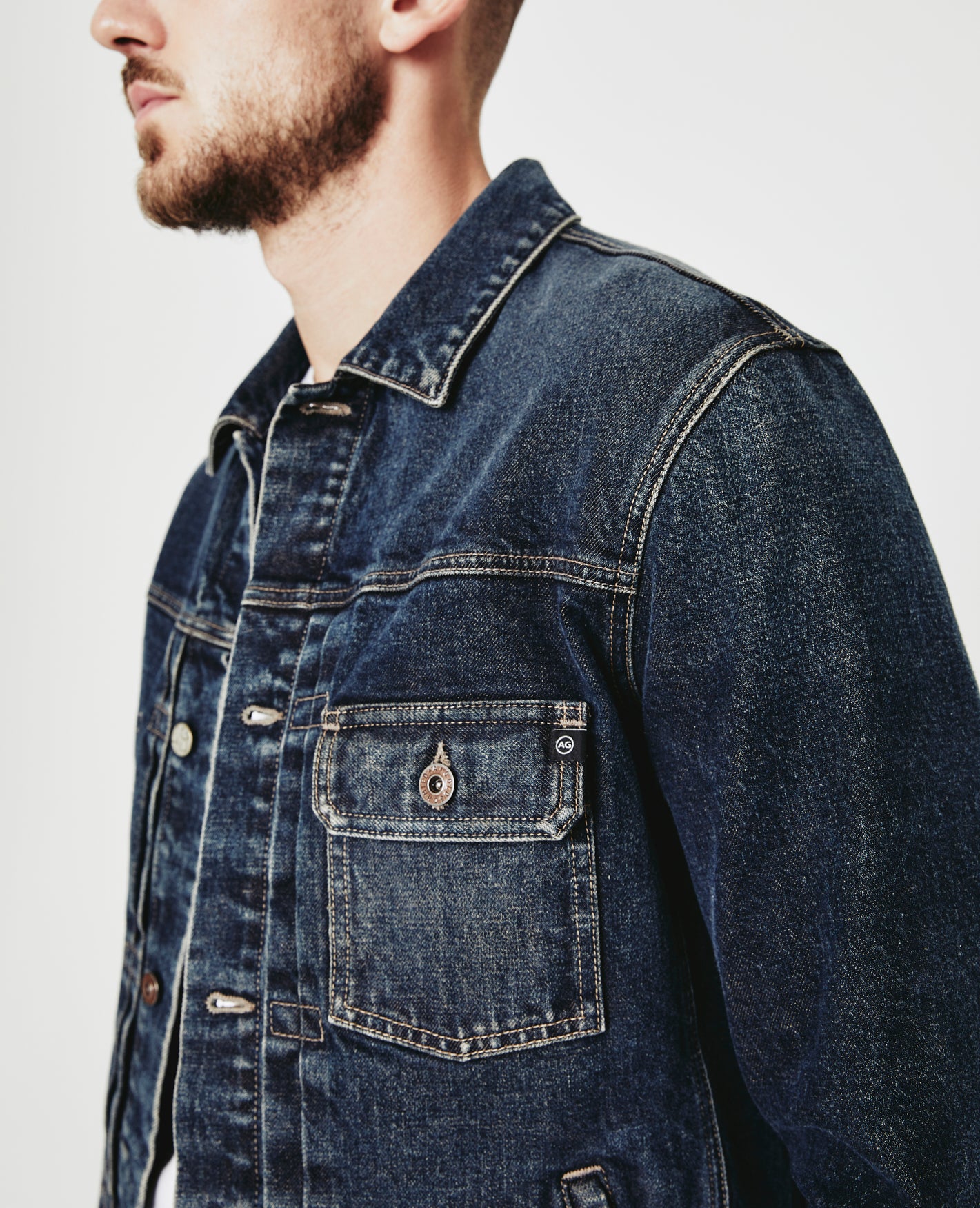 The Sid Jacket for men in a dark wash. The jacket is designed in 11 oz. 360° Denim and features a modern update to the classic trucker silhouette.