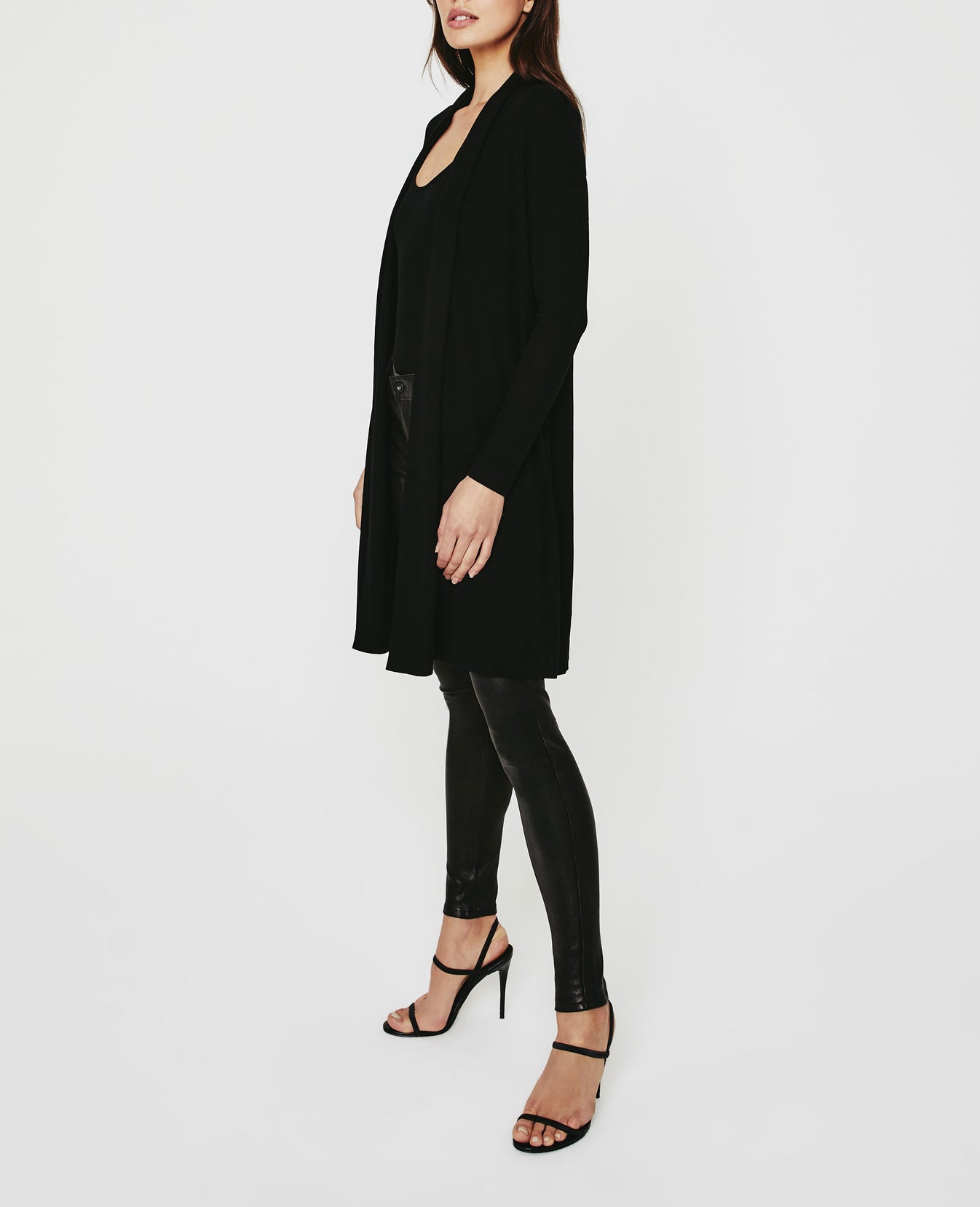 The Sophie Extended Shawl Cardigan presents a more elevated front. This sophisticated ribbed knit offers an elegant drape and hits right above the knee. Our in-house looms deliver the precision knitting needed to accomplish the characteristic 2x1 weave that lends to the fabric’s superior comfort and draping qualities. Designed in a premium black spandex and 2x1 Lyocell Rib fabrication.
