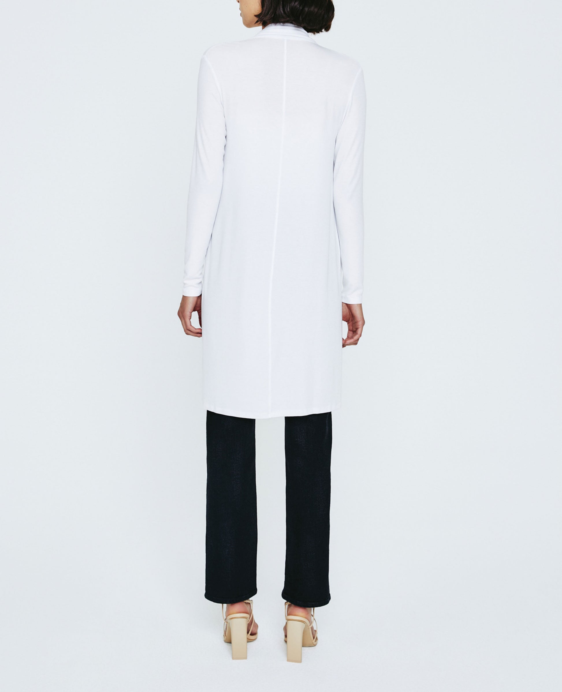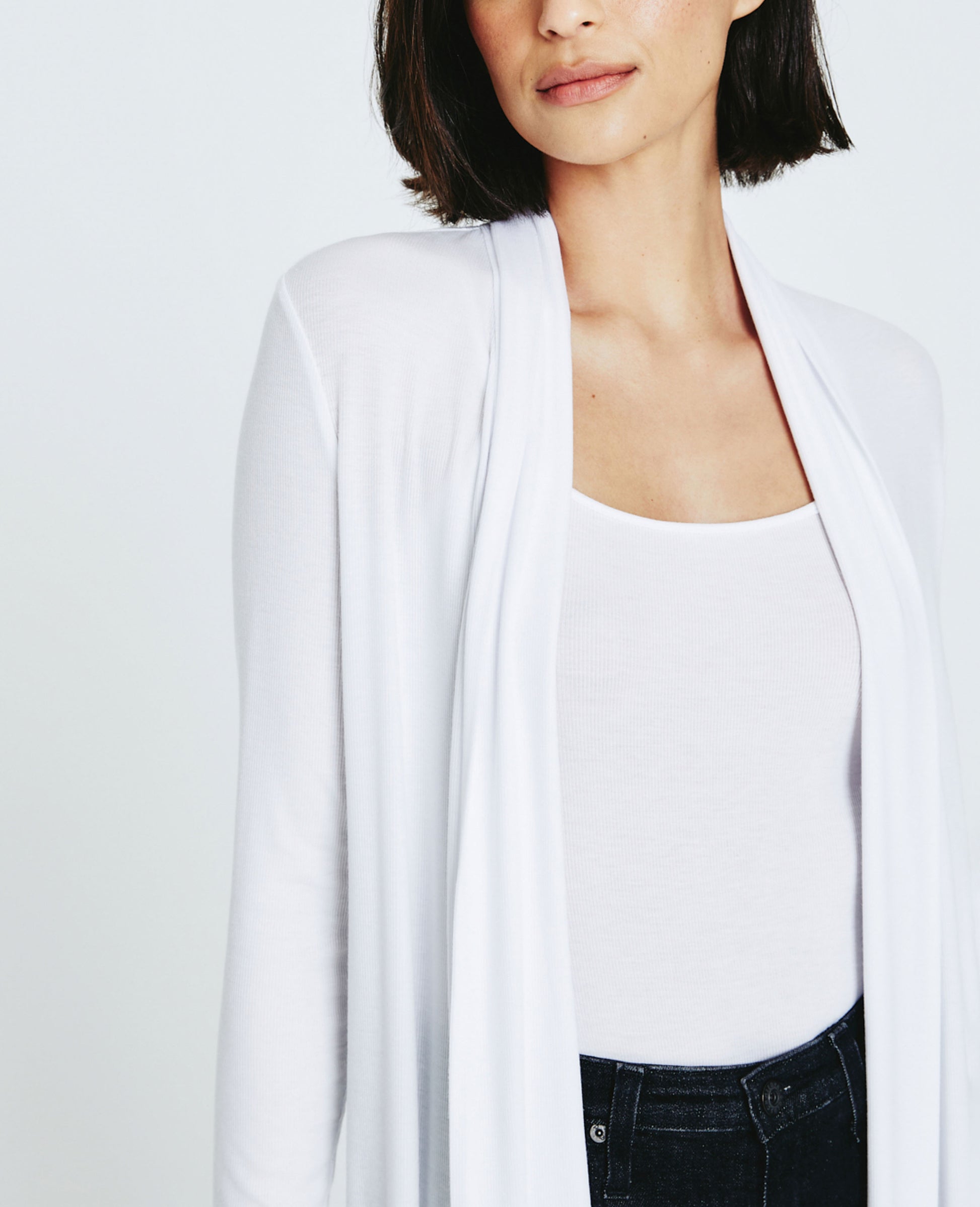 The Sophie Extended Shawl Cardigan presents a more elevated front. This sophisticated ribbed knit offers an elegant drape and hits right above the knee. Our in-house looms deliver the precision knitting needed to accomplish the characteristic 2 X 1 weave that lends to the fabric’s superior comfort and draping qualities. Designed in a premium white spandex and 2 X 1 Lyocell Rib fabrication. Made with Eucalyptus, our lyocell is plant-based, biodegradable, and uses 20% less resources to develop.