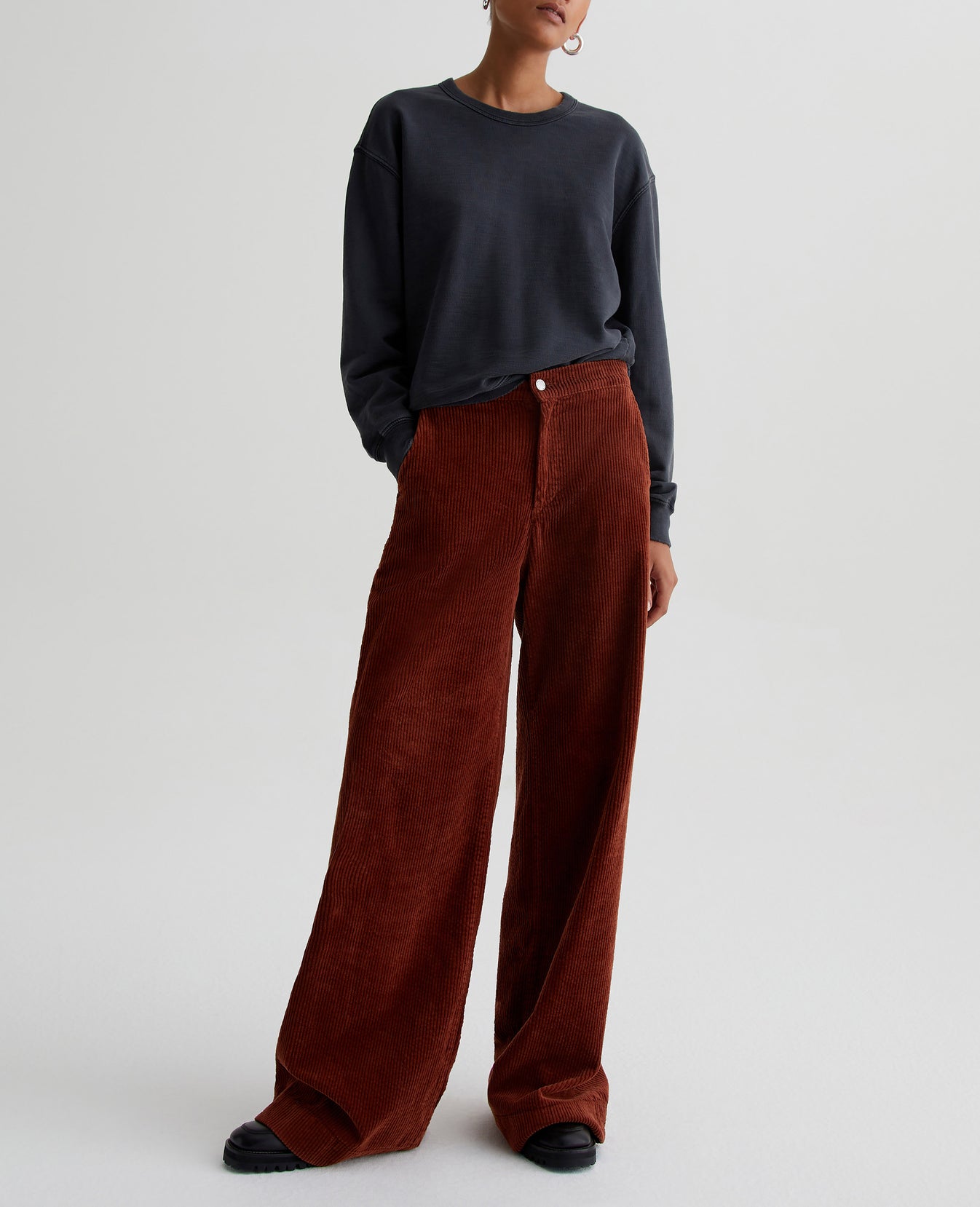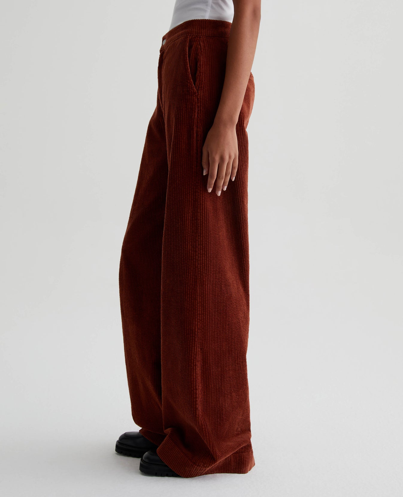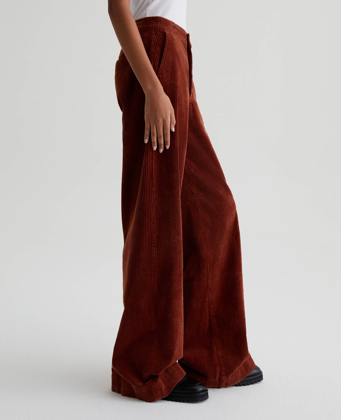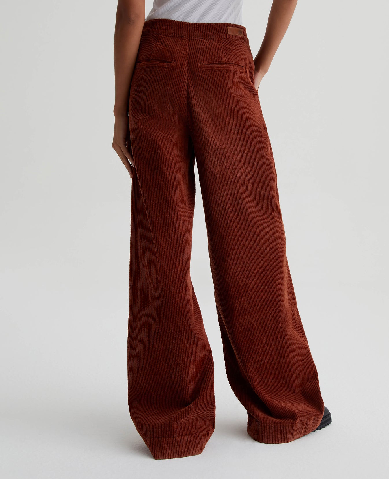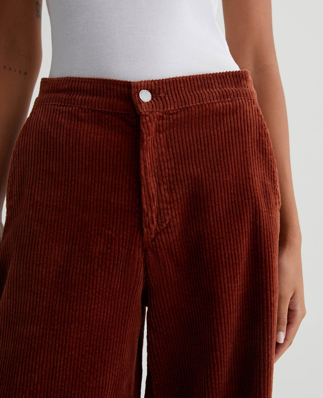 The Tailored Deven wide-leg pants update our fan-favorite high-rise silhouette in buttery soft wide-wale stretch corduroy. Done in a rich cinnamon brown shade, the pair features a clean waistband without belt loops and a dramatic 34" inseam. A zip fly, slash front pockets, and welt back pockets finish the look.