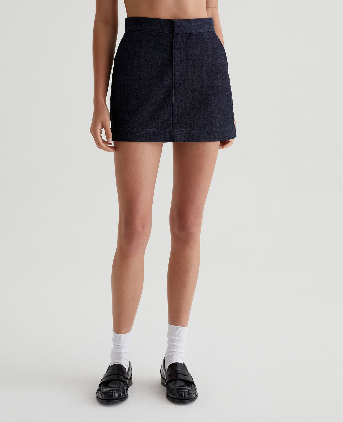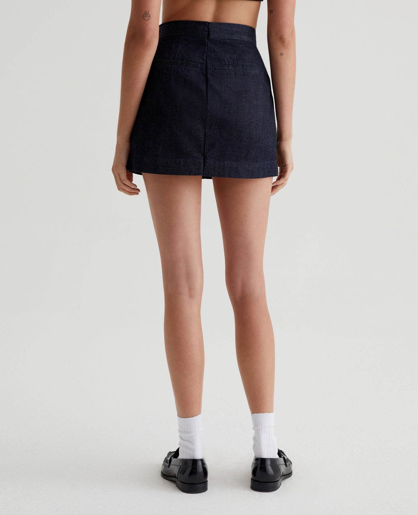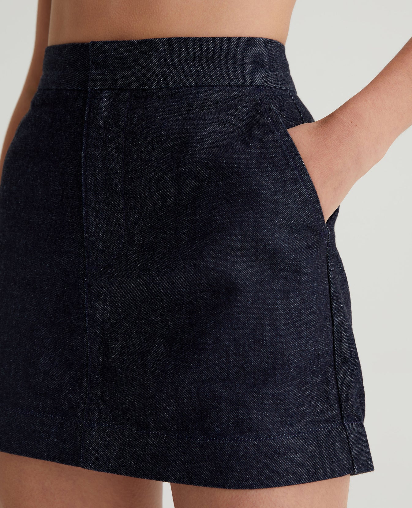 Our Tailored Remy Skirt is sleek and smart in 100% cotton 11.75 oz. Legion Denim with a dark indigo resin rinse. This low-rise mini skirt has classic tailored details: a clean front with hidden closures, slash pockets, and welt pockets at the back.