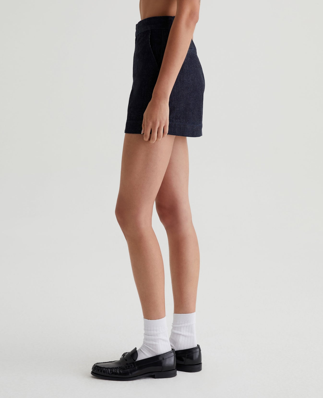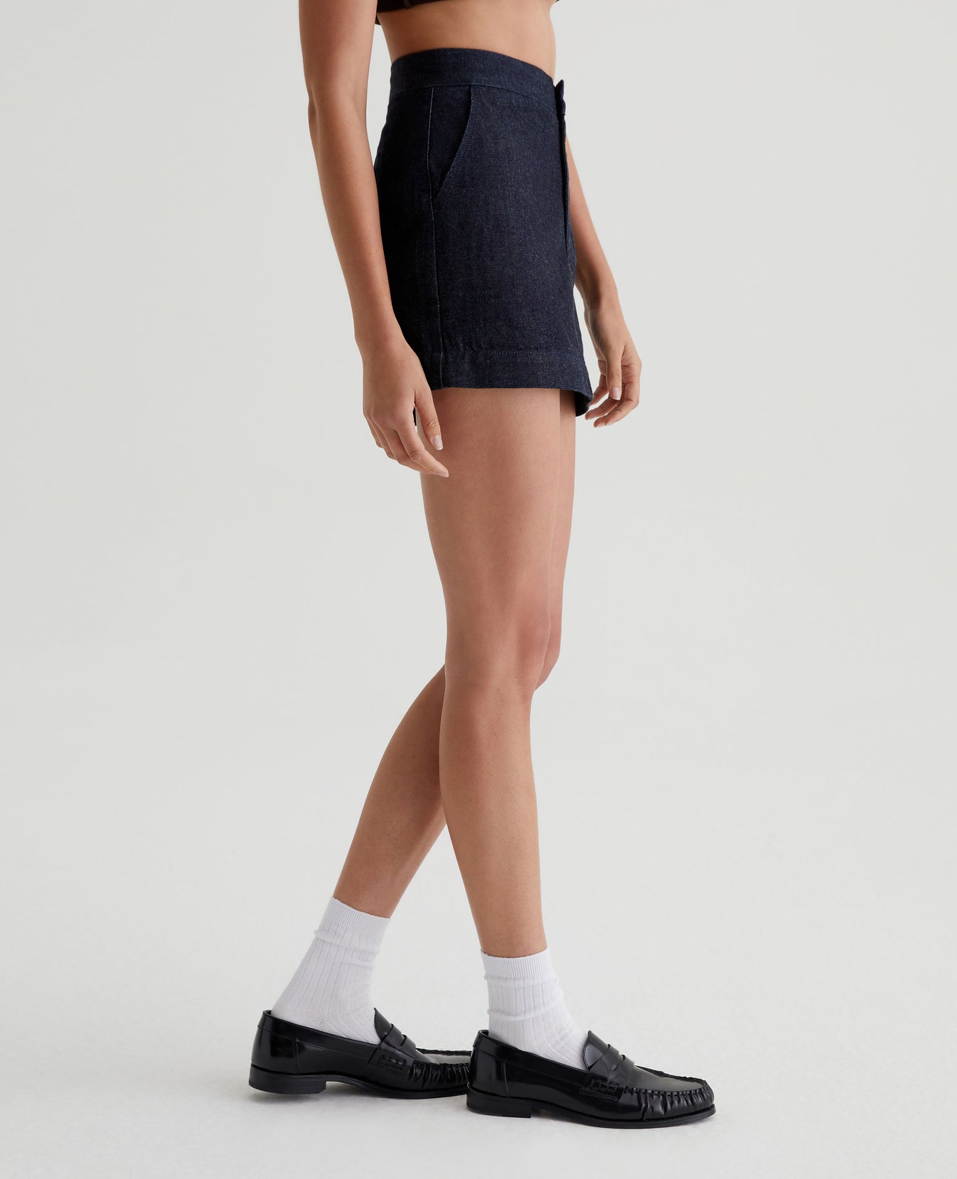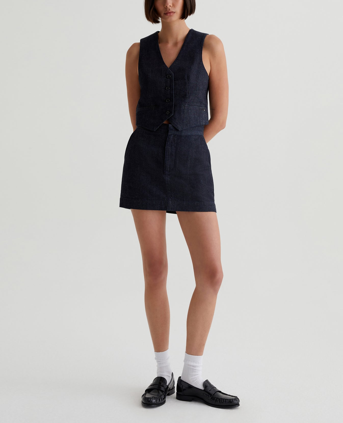 Our Tailored Remy Skirt is sleek and smart in 100% cotton 11.75 oz. Legion Denim with a dark indigo resin rinse. This low-rise mini skirt has classic tailored details: a clean front with hidden closures, slash pockets, and welt pockets at the back.