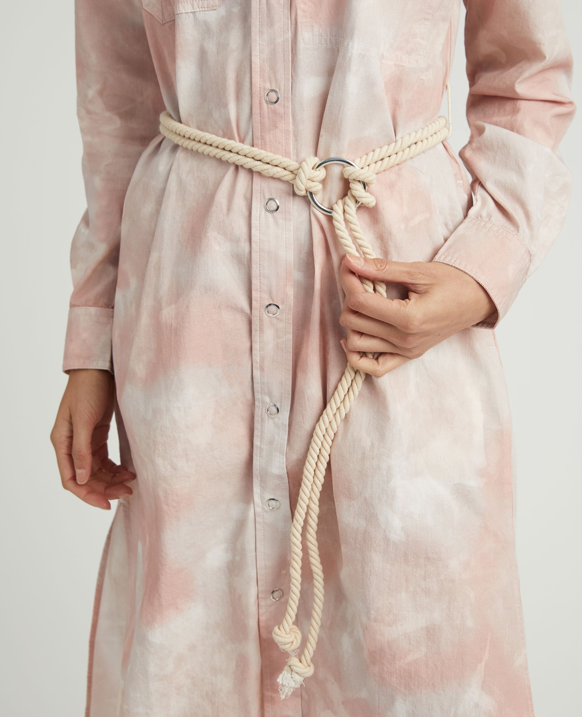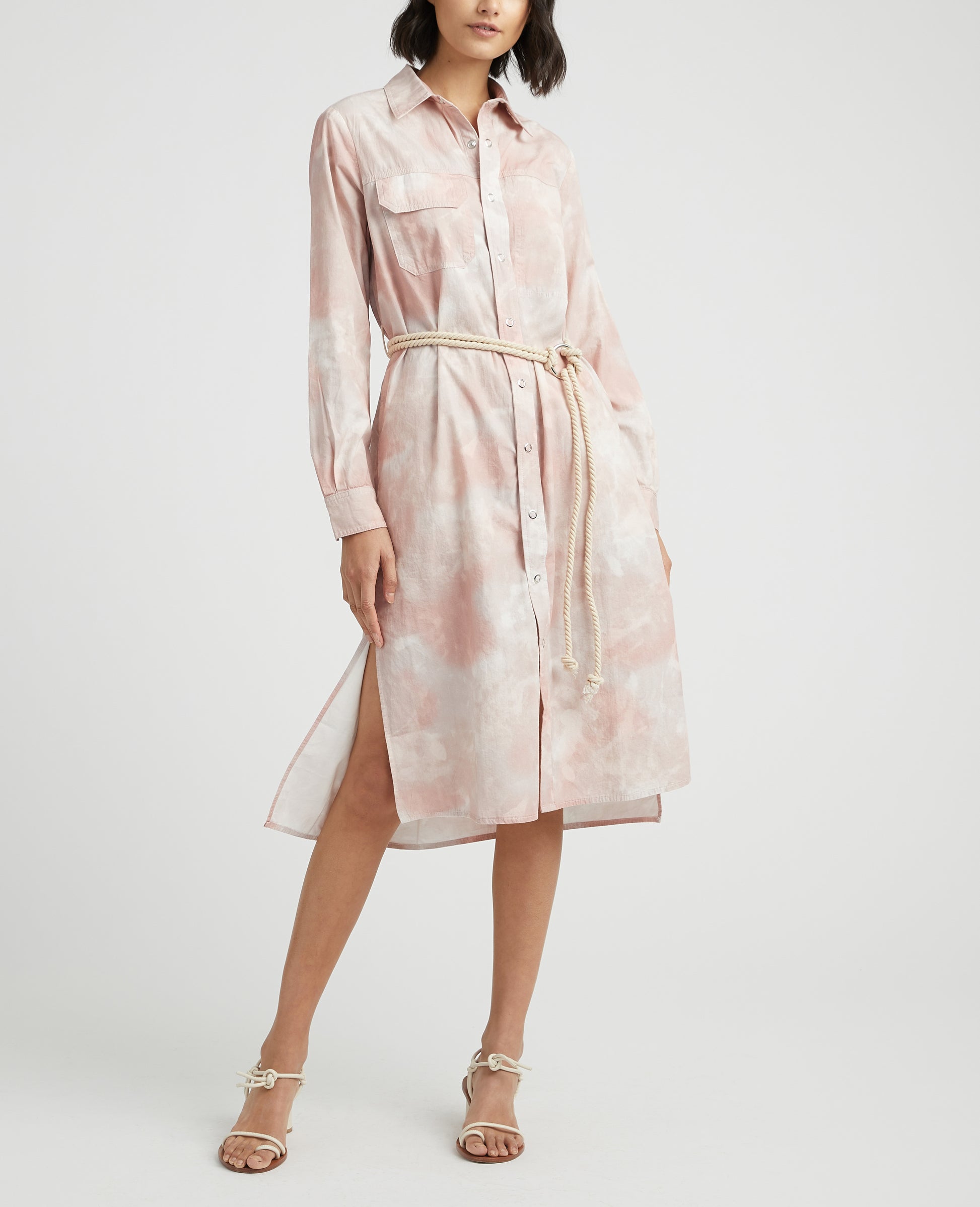 The Taylor Workwear Dress features a sun-bleached mauve tie-dye treatment that revisits the eclectic 80s. The Taylor offers classic long sleeves, full button-down closure, sophisticated collar, chest pocket, and a handmade rope belt for versatile jacket styling. This women’s poplin dress is designed in a lightweight 100% cotton fabric made from organic fibers that are uniquely knitted for premium dye and print applications.