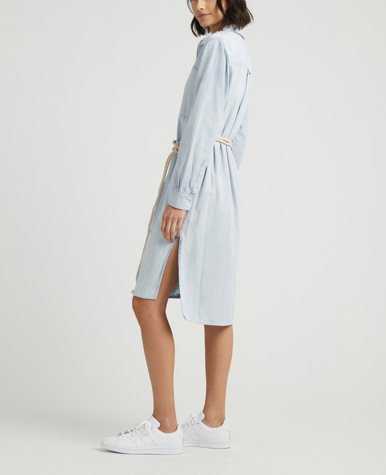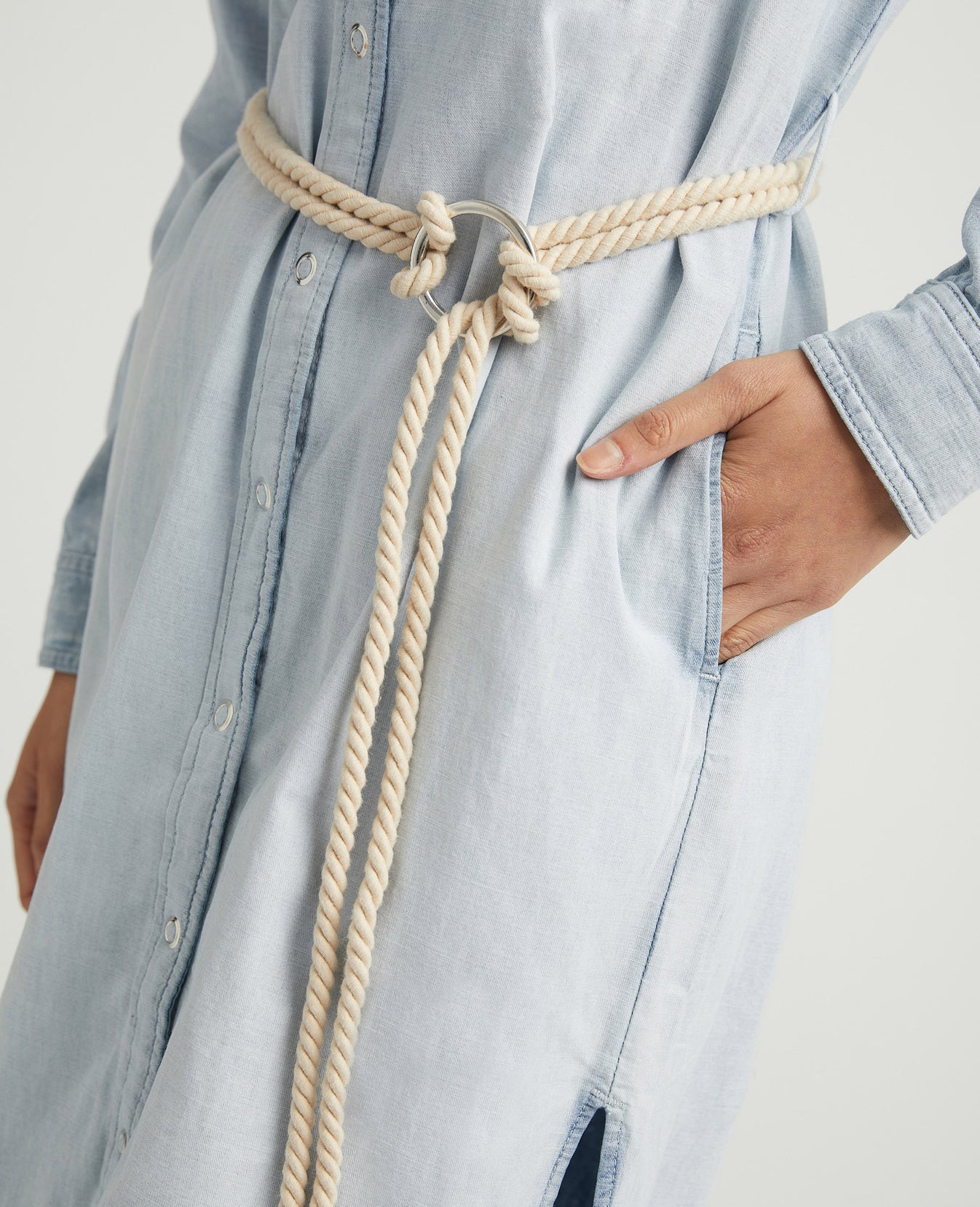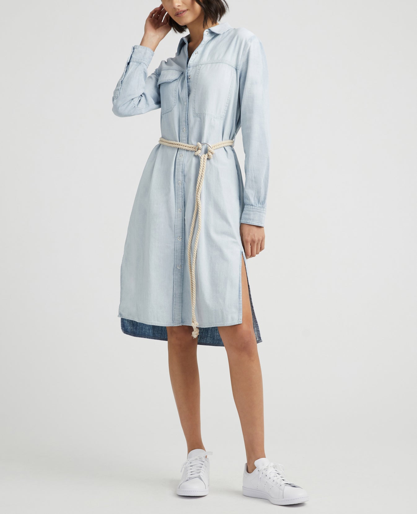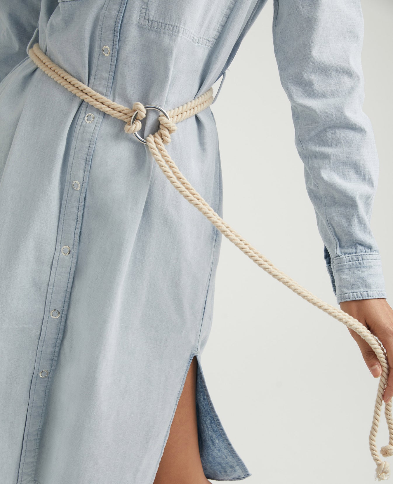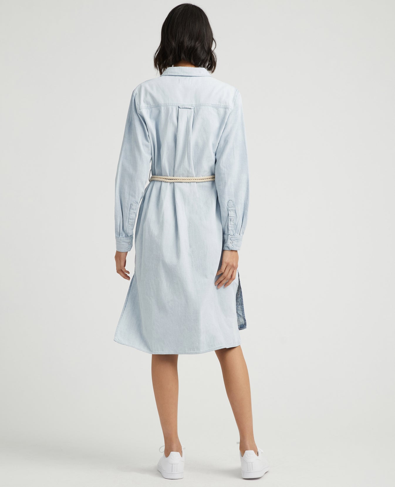 The Taylor Workwear Dress features a vintage sun-bleached light chambray wash with shadow tones on the interior and at the seams. The Taylor offers classic long sleeves, full button-down closure, sophisticated collar, chest pocket, and a handmade rope belt for versatile jacket styling. This women’s chambray dress is designed in a lightweight, 100% cotton fabric that's been rope-dyed for a distinct softness and durability.