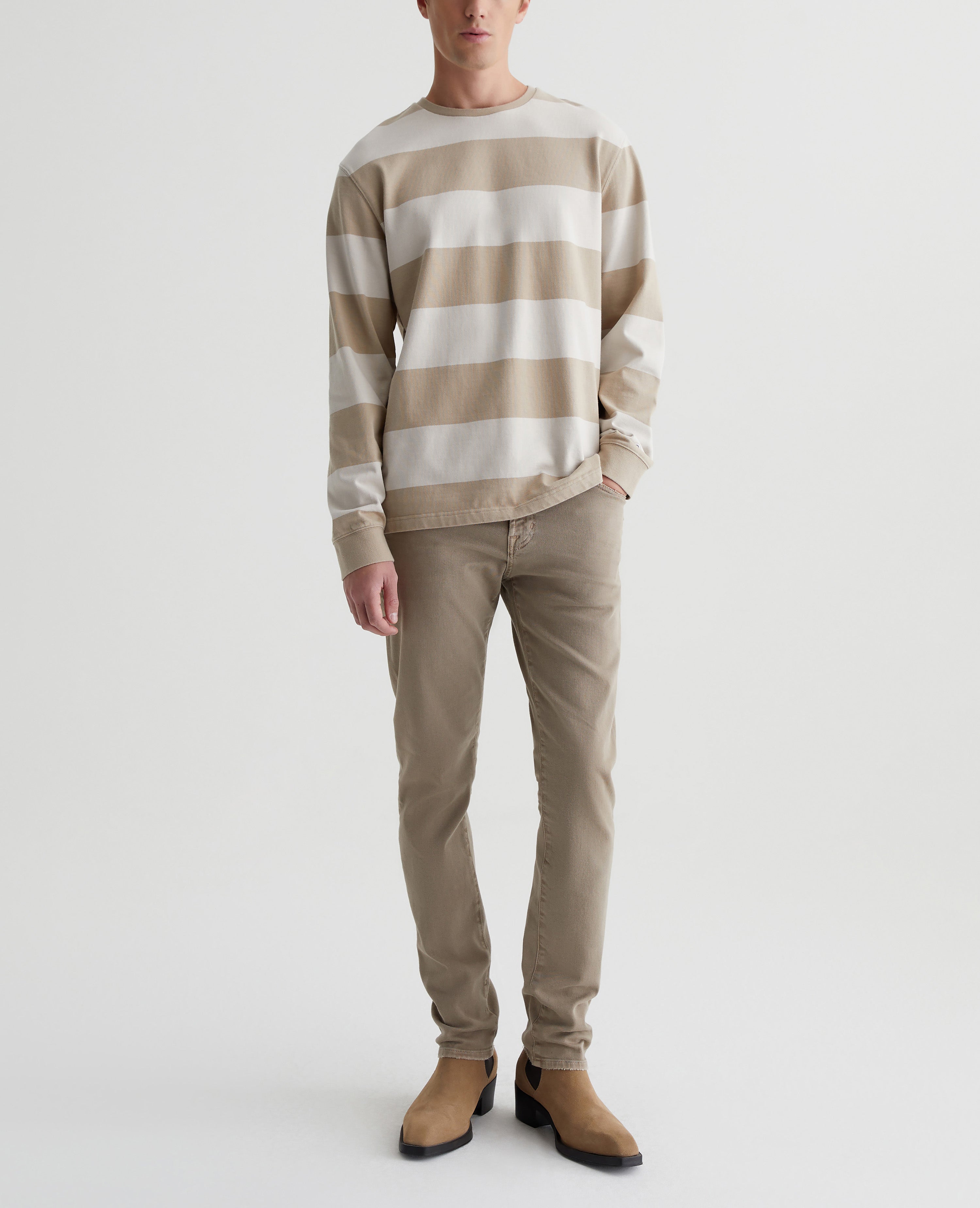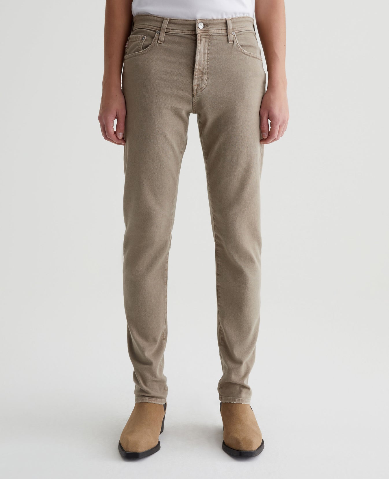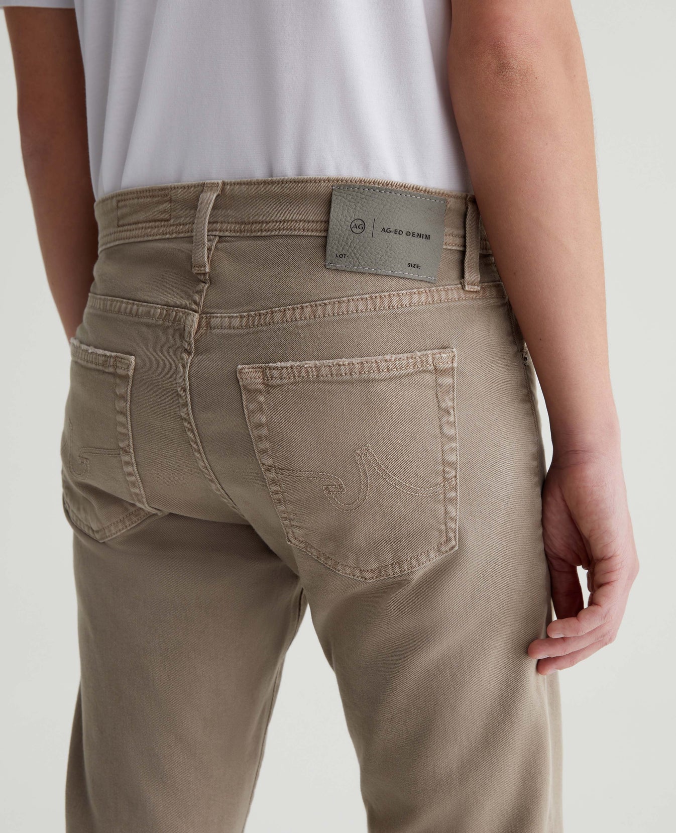 Tellis is a modern slim fit for men, updated in a sulfur-dyed beige wash that's been AG-ed™ with fading and worn pocket edges to emulate 7 years of wear. These five-pocket jeans have a fitted upper block and a tapered leg opening in 8.7 oz. Hyper Soft Bull Denim, our velvety left-hand twill fabric from the AG Cloud Soft Denim™ collection. The fabric's special construction allows the yarns to gently relax and untwist for a supple feel that gets softer with every wear. Dual-elastic performance fibers offer elevated stretch and recovery.