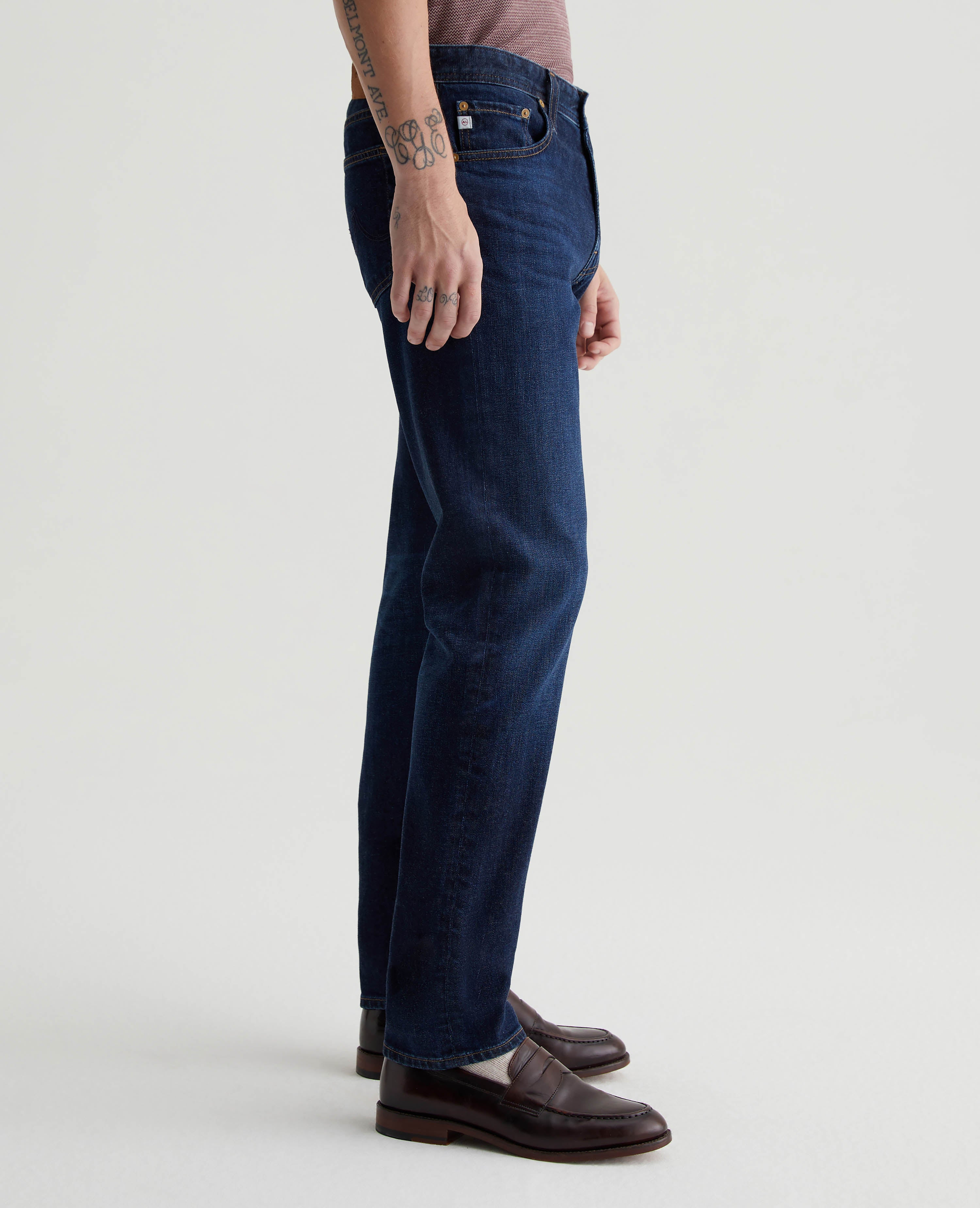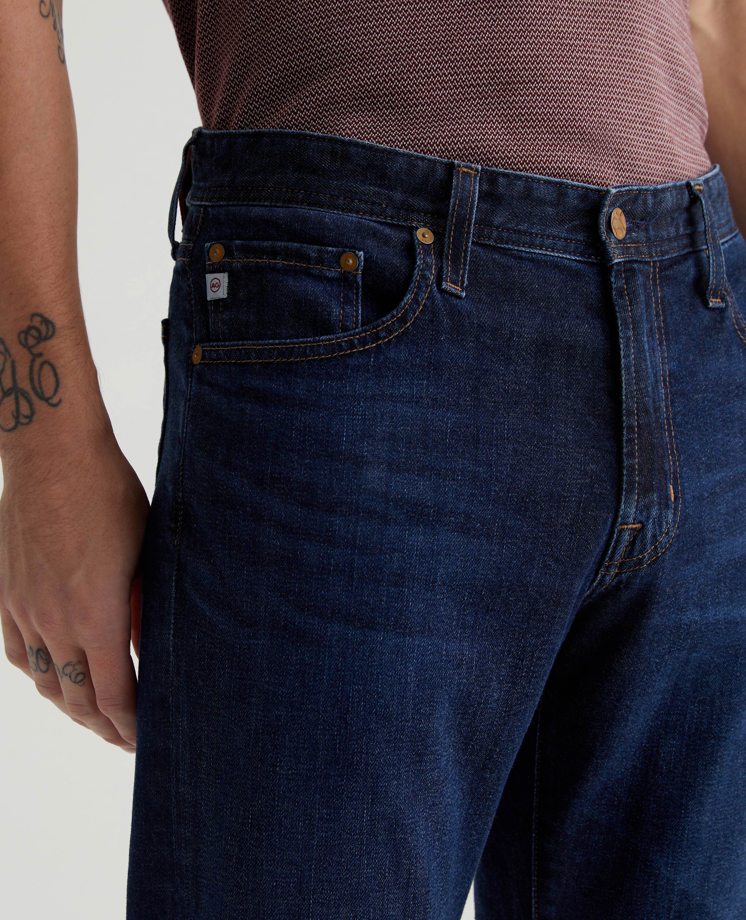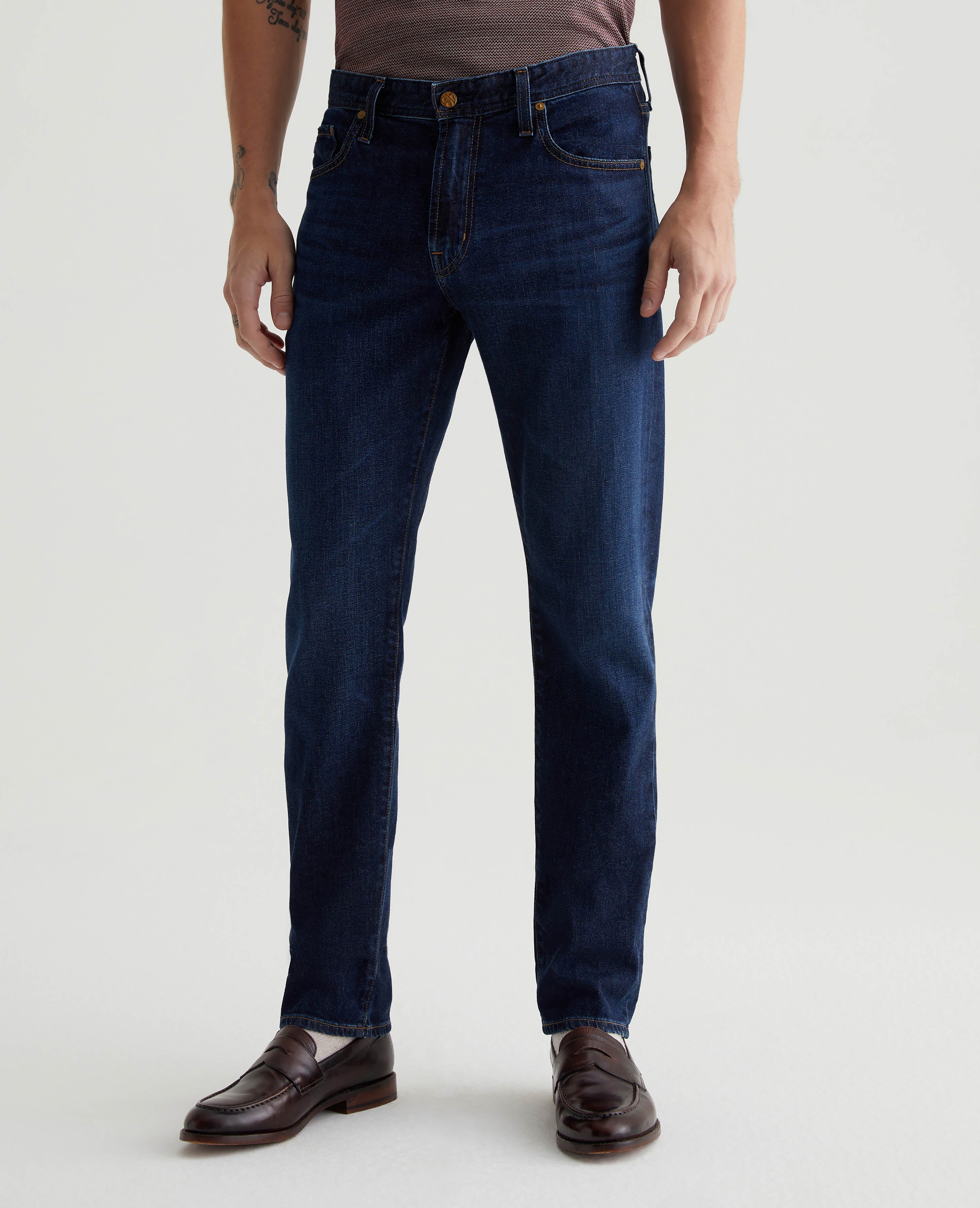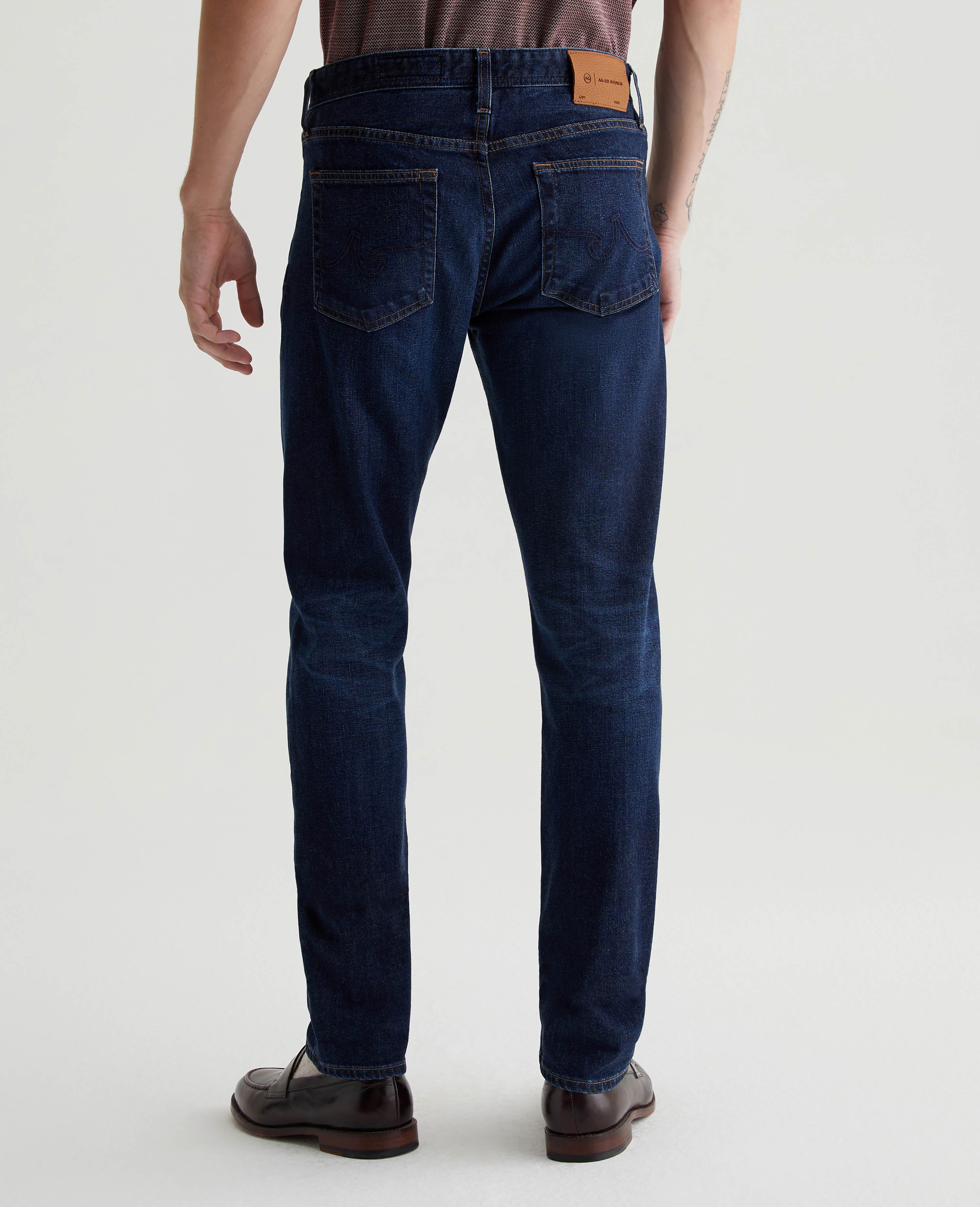 The Tellis modern slim jean for men comes in a dark blue wash with a 5-year AG-ed™ vintage fade. Whiskering and crease marks create a naturally worn-in appearance. Featuring a fitted upper block and tapered leg opening, this five-pocket men's jeans are crafted from 10 oz. Daytripper Stretch Denim for premium comfort. Contrast stitching completes the look.