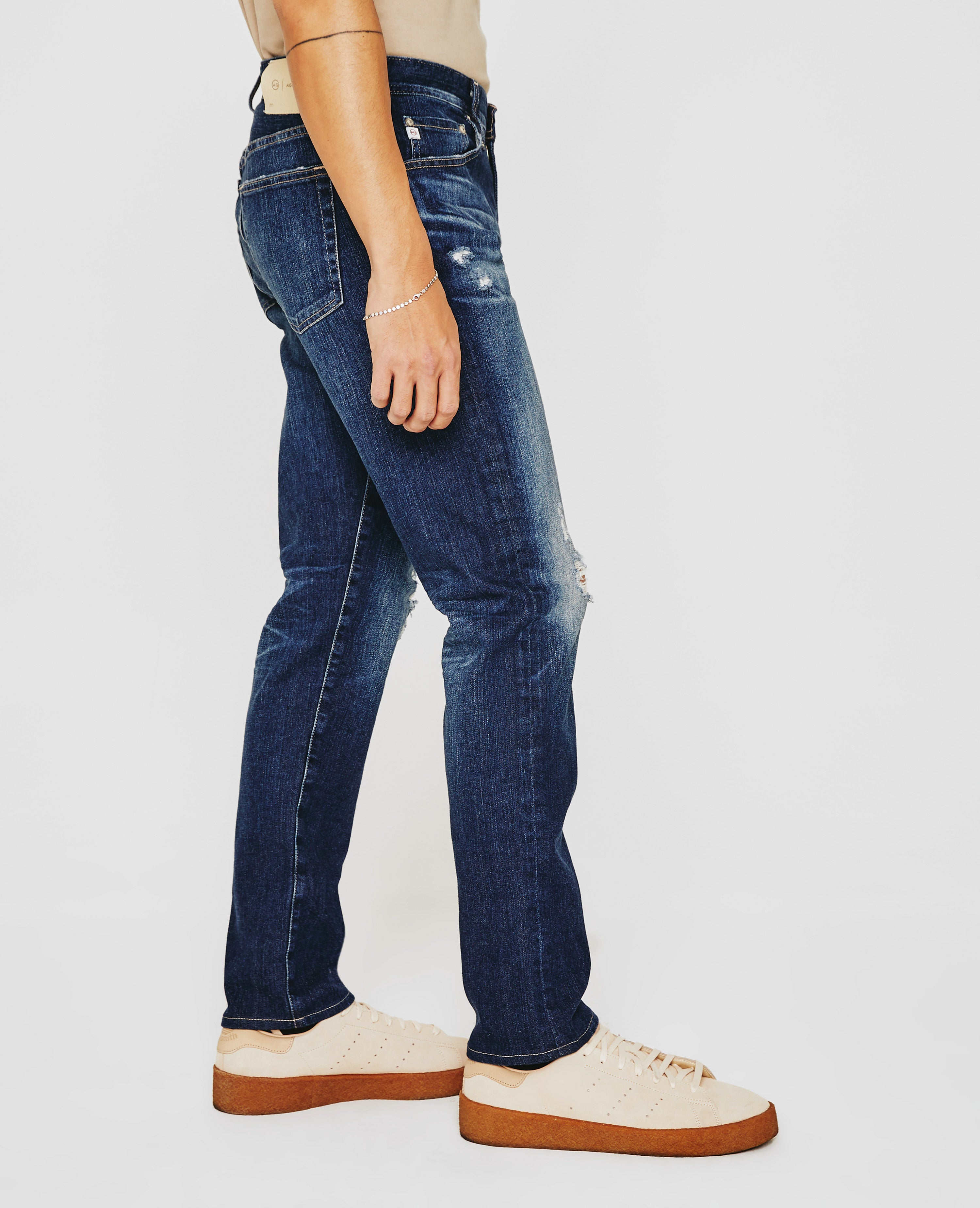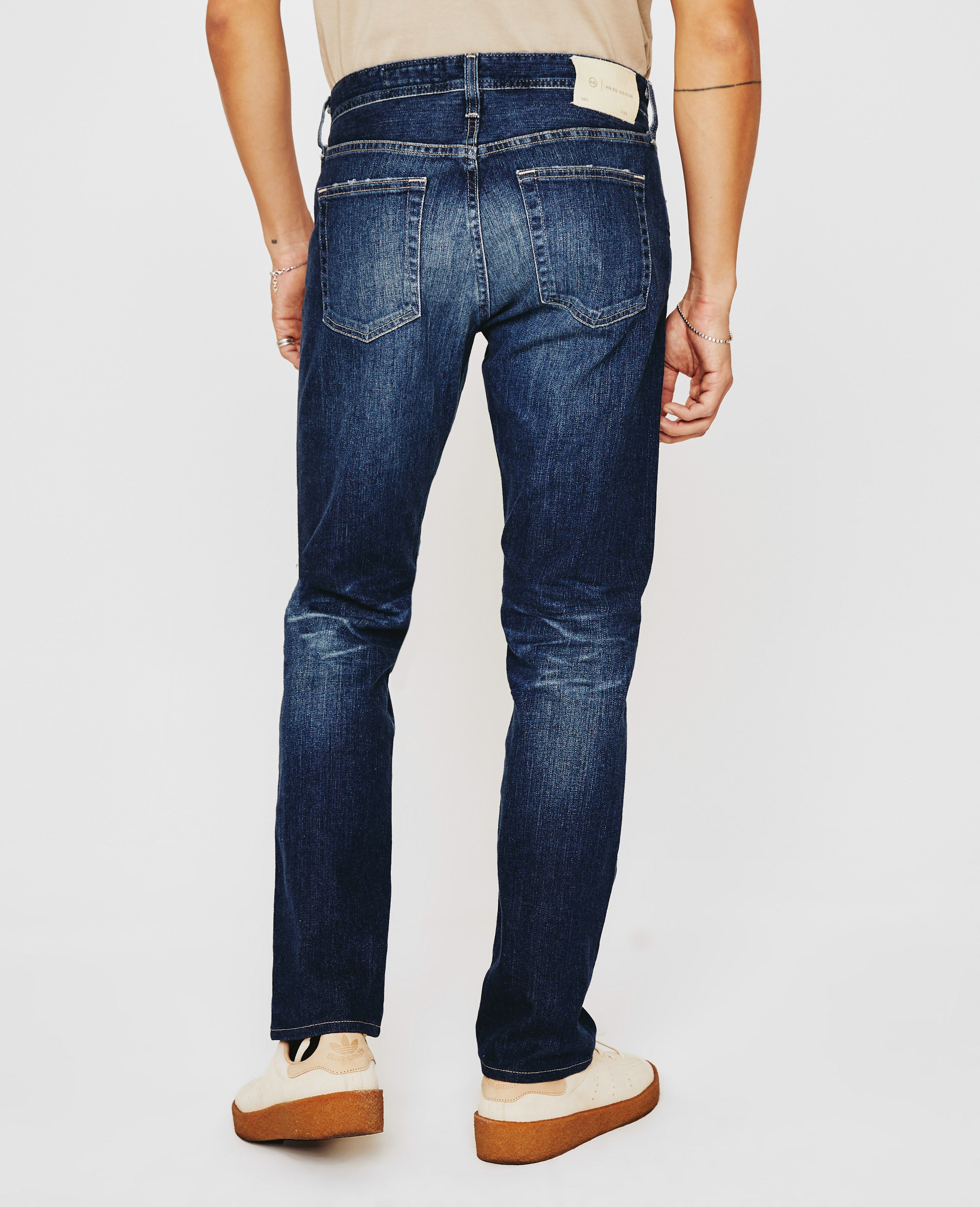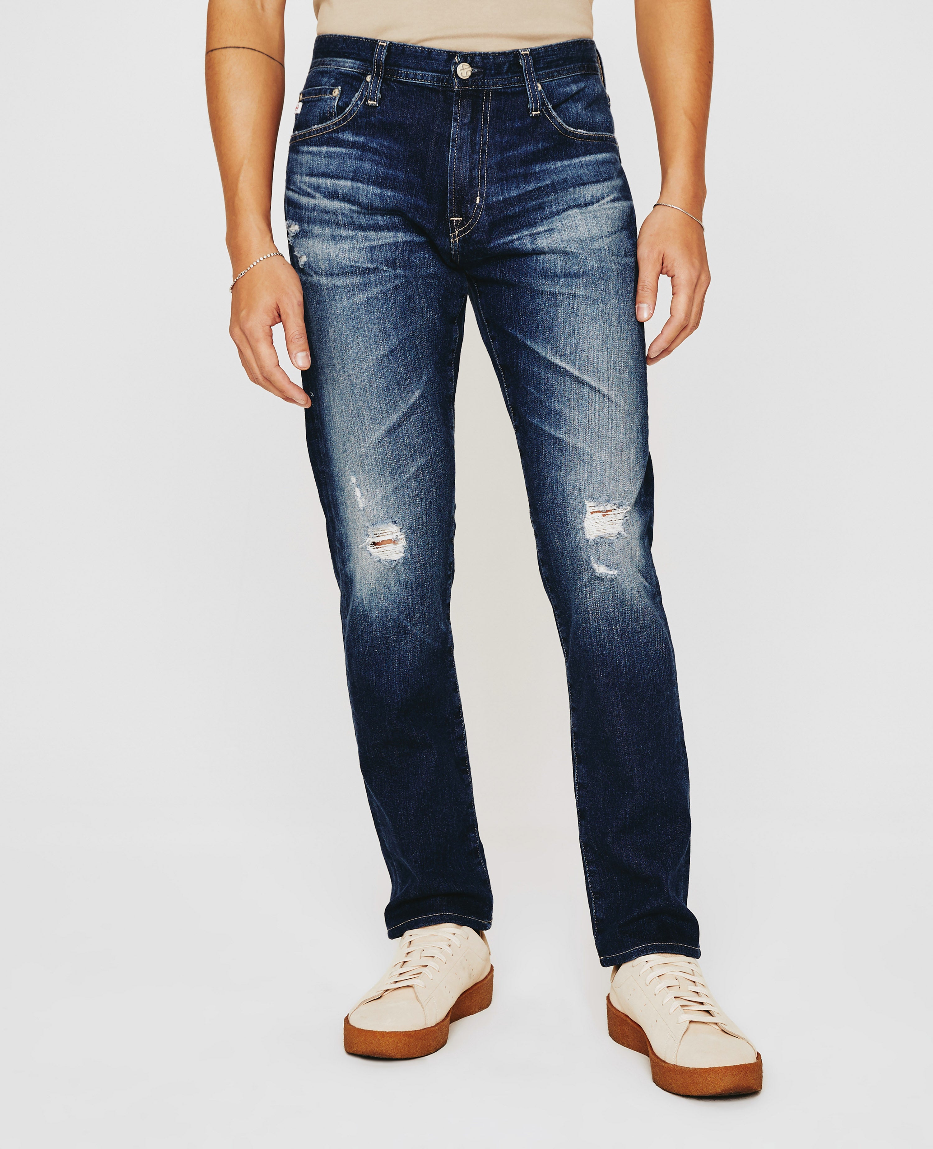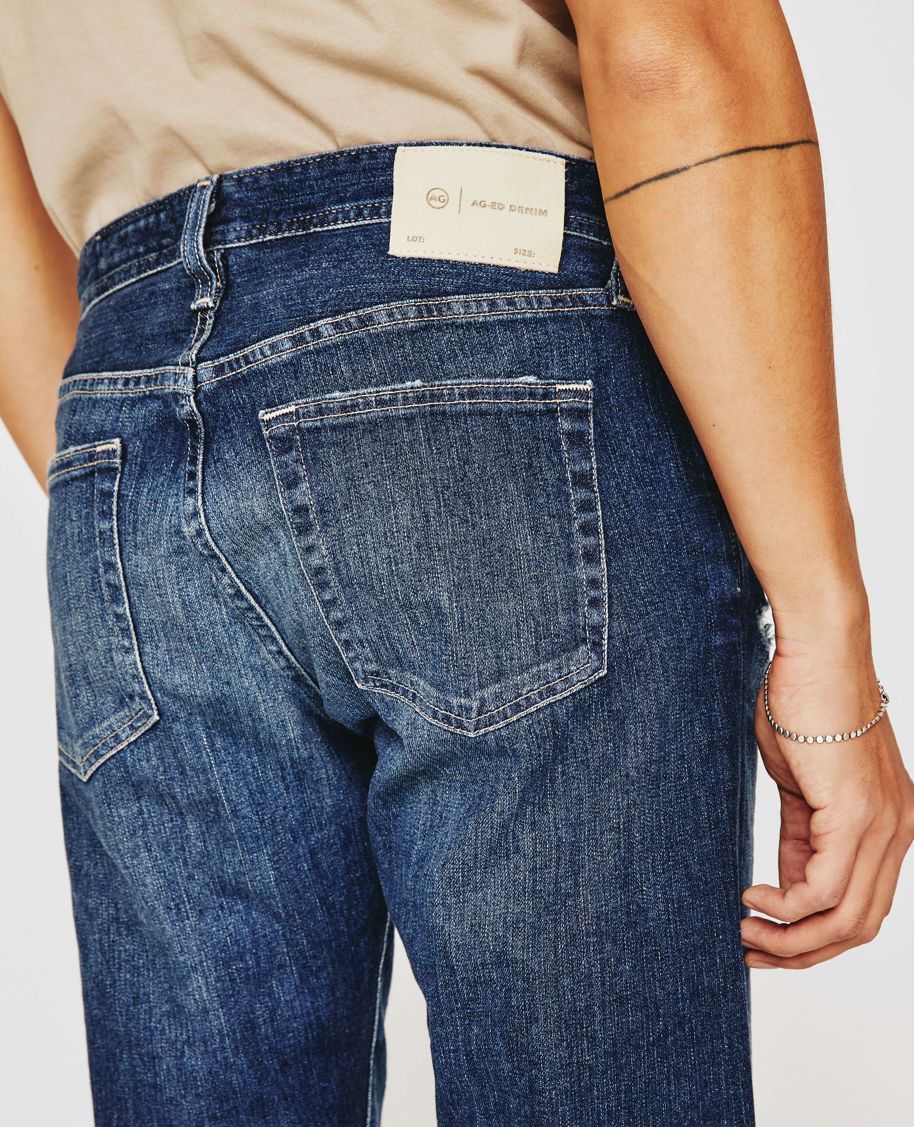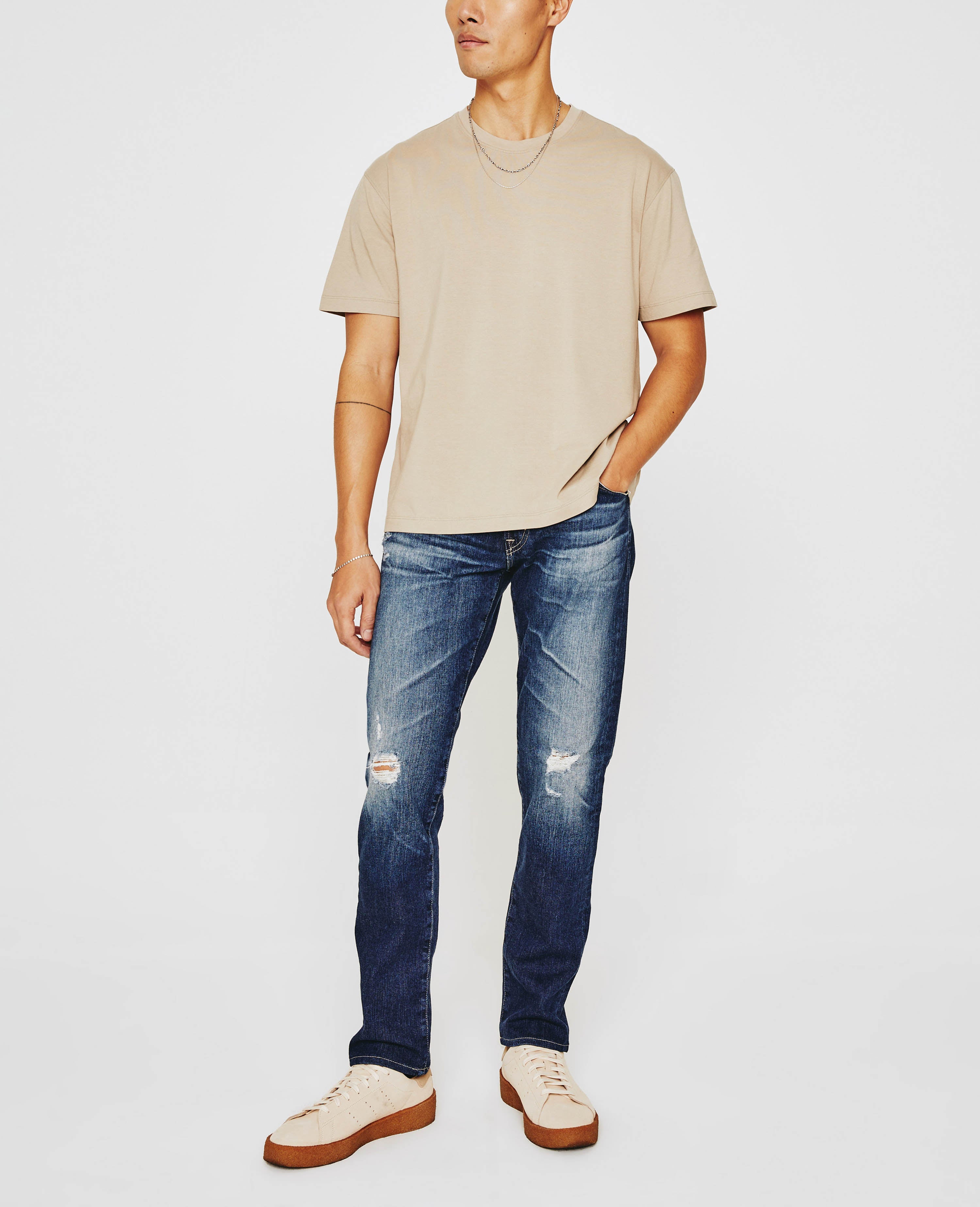 Our Tellis Modern Slim Jean for men features a dark indigo wash with heavy fading and distressing to mimic an authentic AG-ed™ look. Cut with a fitted upper block and tapered leg opening, this five-pocket men's jean is designed in 11 oz. Lead Denim featuring comfort stretch for ease of wear.