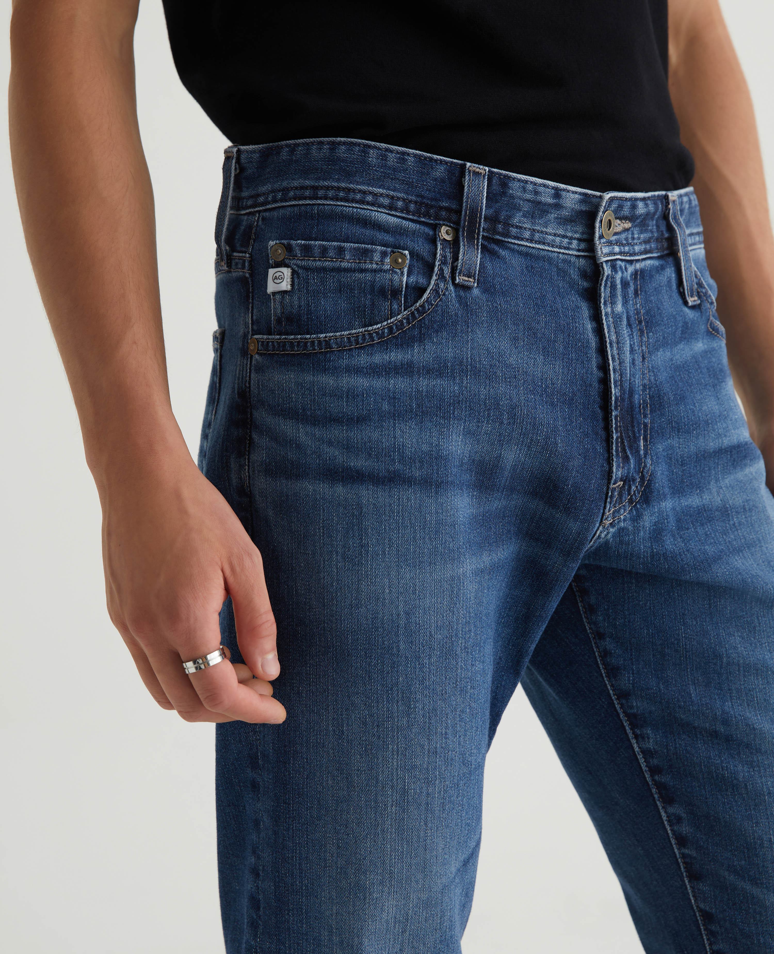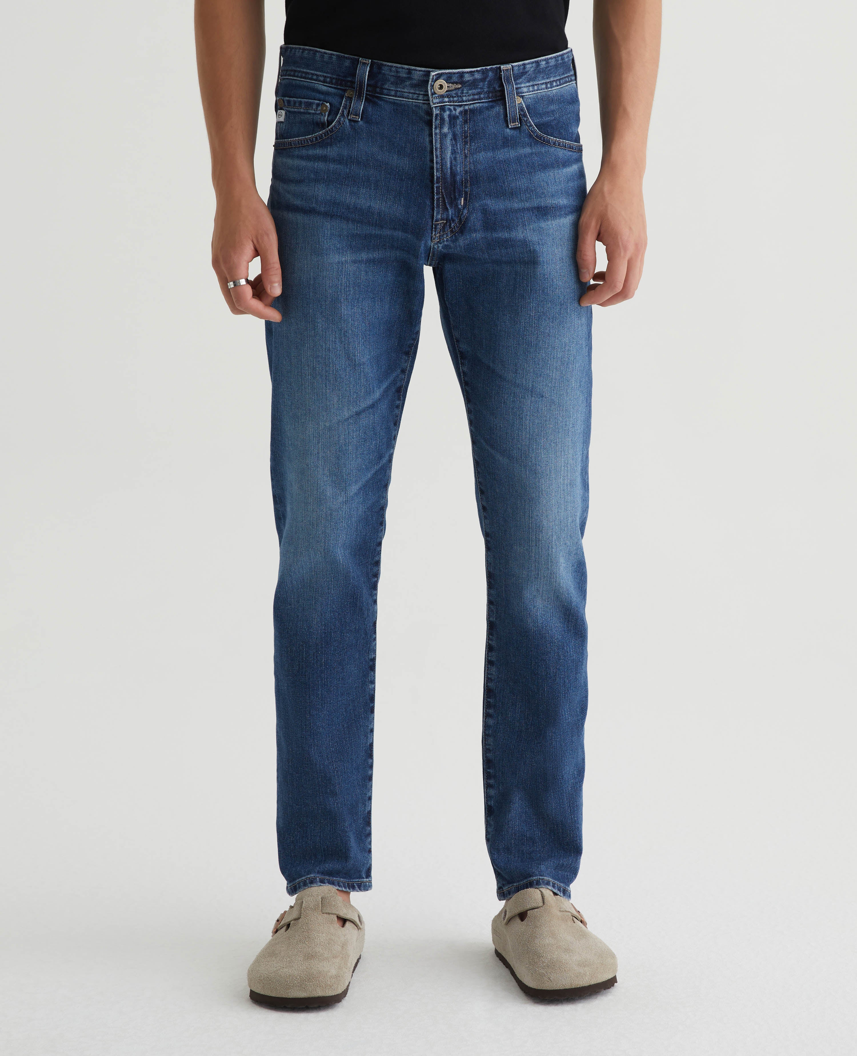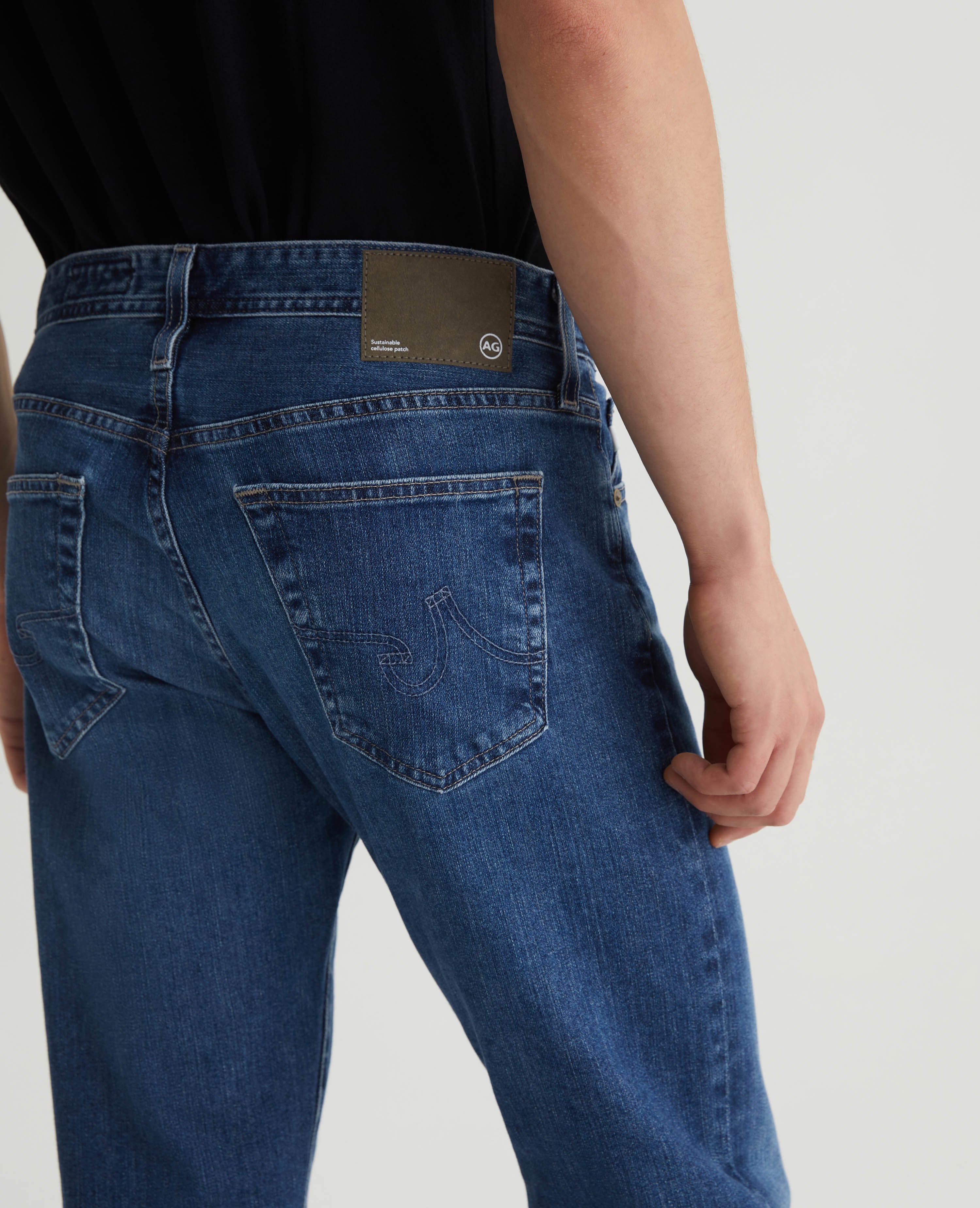 Tellis is our modern slim fit, featured in a dark indigo wash that's been subtly AG-ed™ and whiskered for a broken-in effect. Cut with a fitted upper block and tapered leg opening, this five-pocket men's jean is designed in 11 oz. Lead Denim with comfort stretch. Marigold topstitching accents the classic five-pocket design.