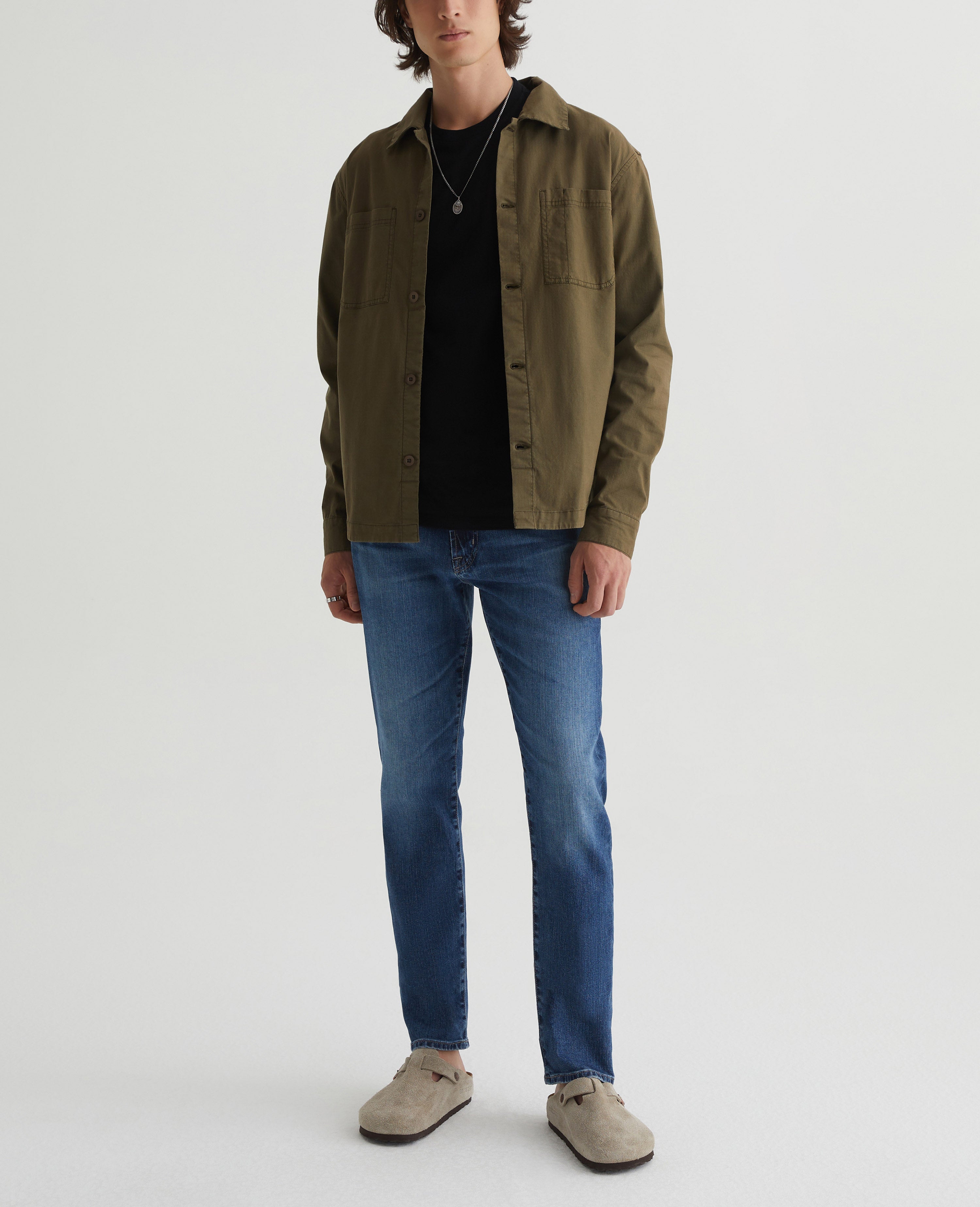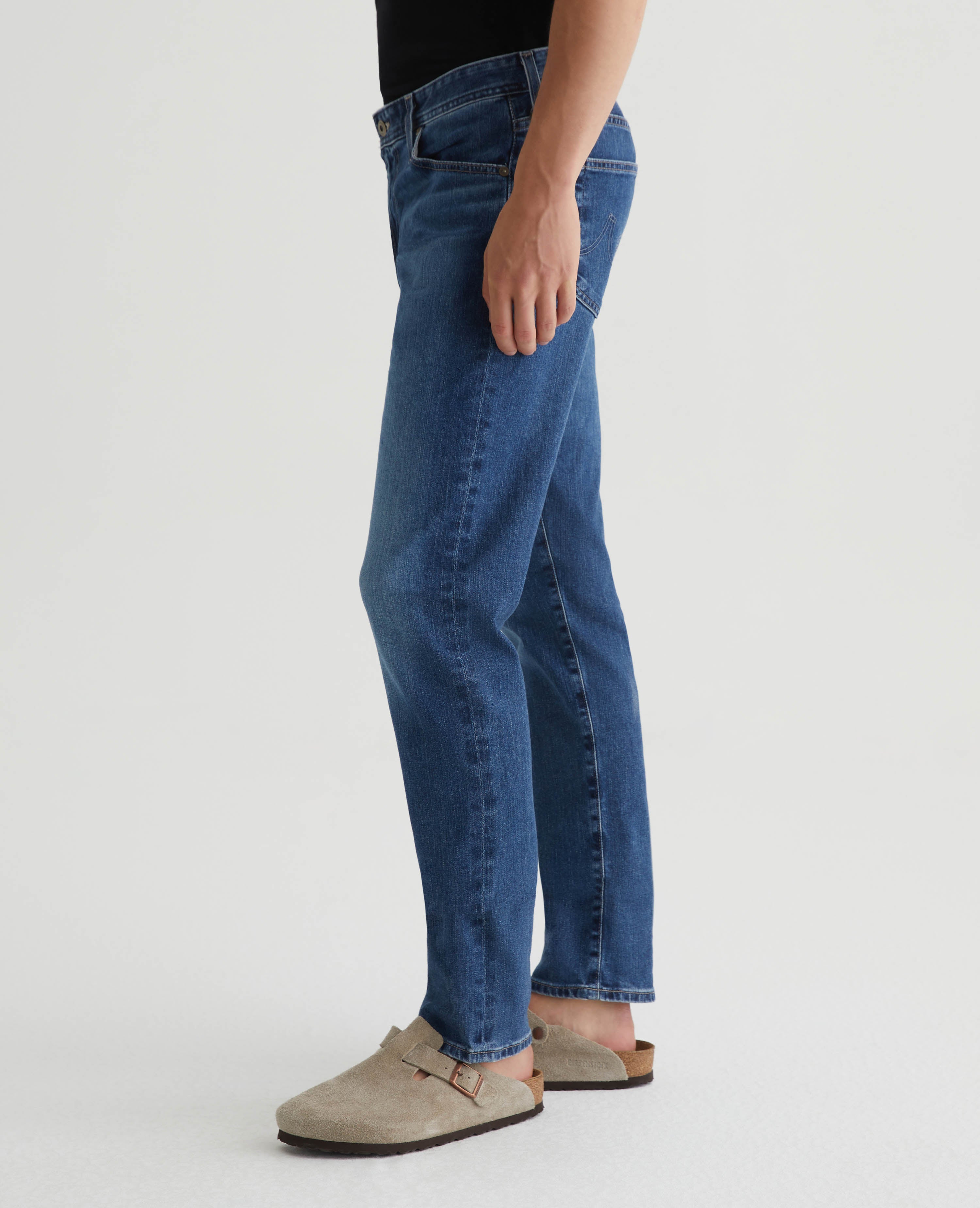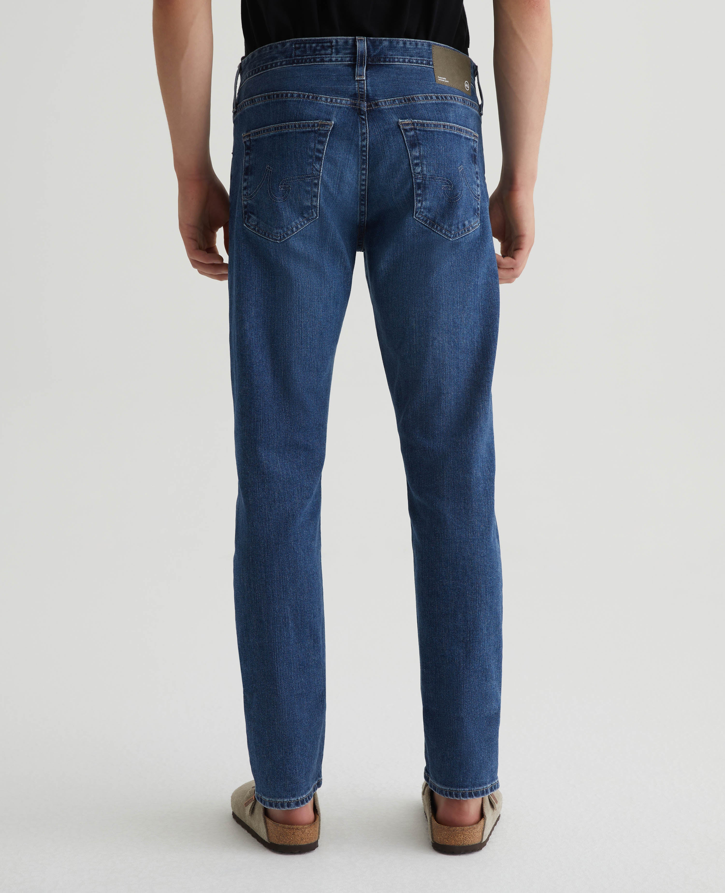 Tellis is our modern slim fit, featured in a dark indigo wash that's been subtly AG-ed™ and whiskered for a broken-in effect. Cut with a fitted upper block and tapered leg opening, this five-pocket men's jean is designed in 11 oz. Lead Denim with comfort stretch. Marigold topstitching accents the classic five-pocket design.