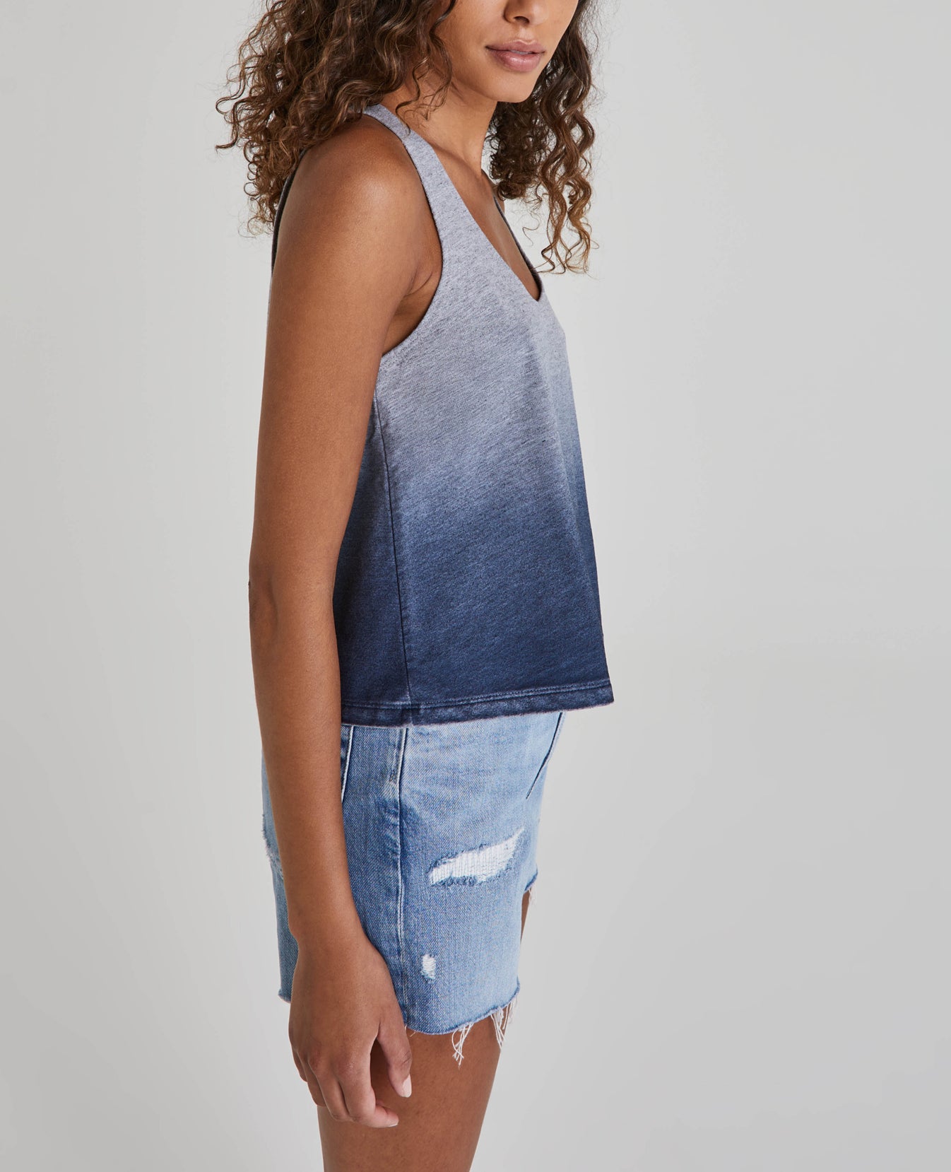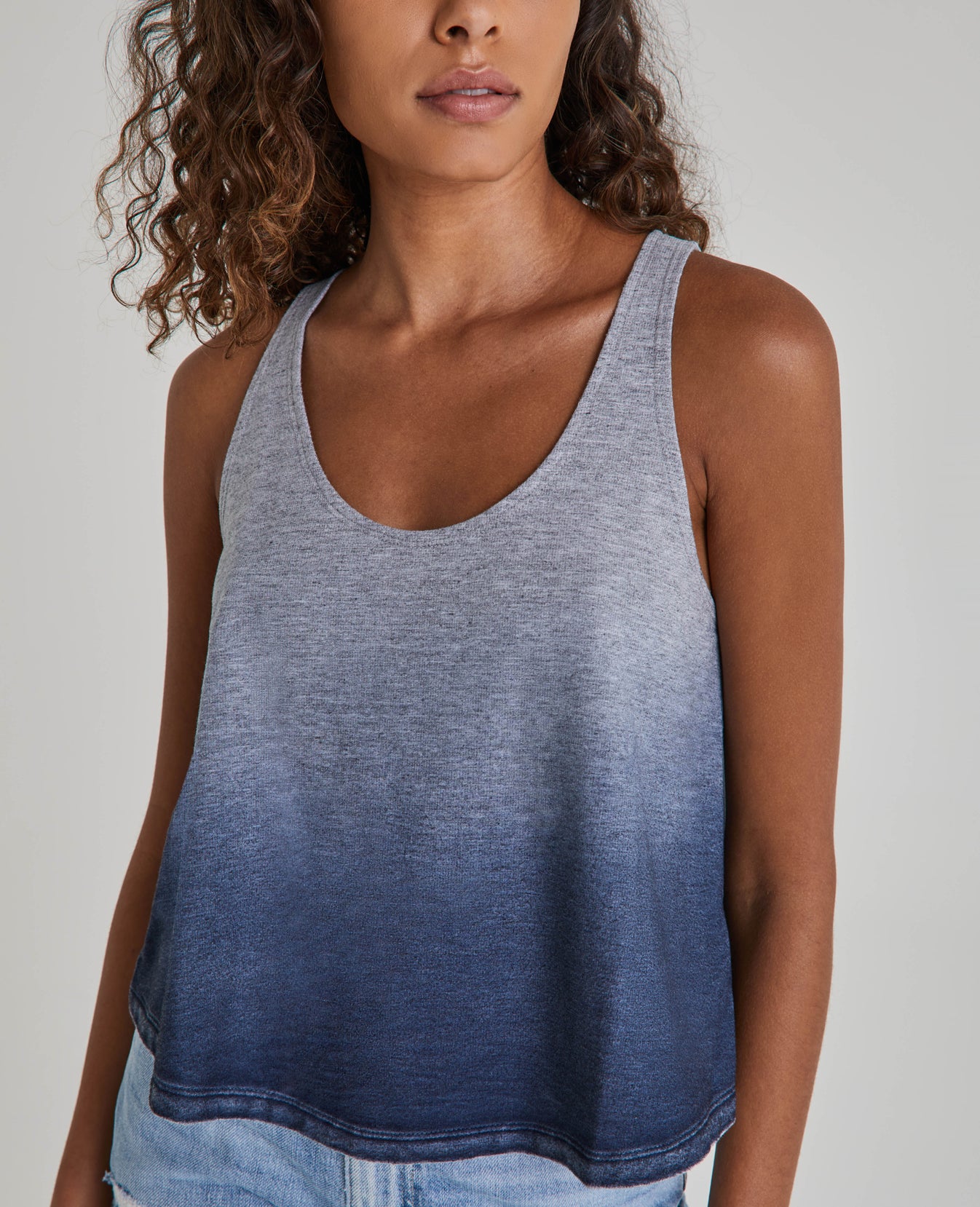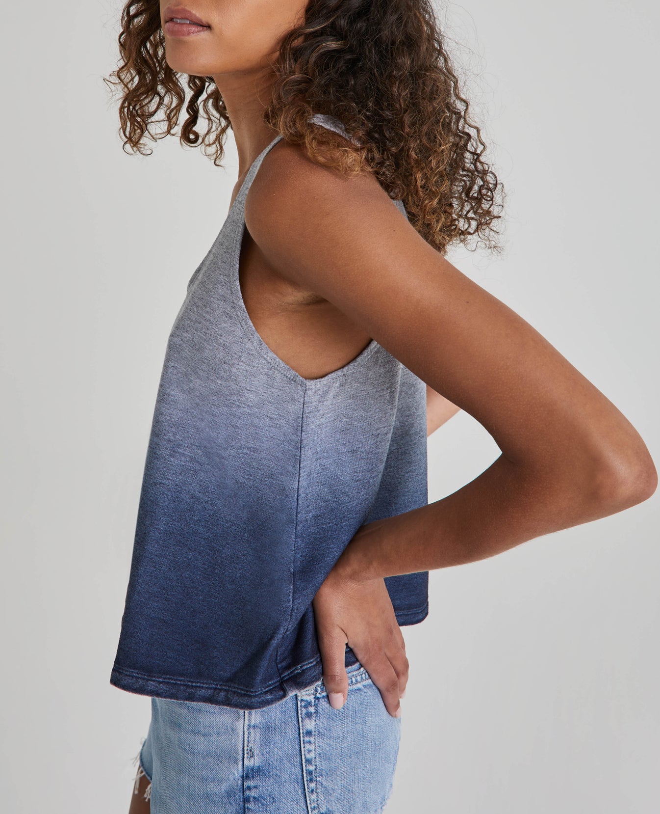 The Tia Tank is a crop top for women featuring a hand-sprayed aerosol ombre created with heather grey and navy blue hues., effortless swing top silhouette, round scoop neck, and sleeveless construction. This women’s cropped tank top is designed in an ulta-soft baby french terry with beautiful draping, perfect for pairing back withThe high waisted bottoms ofThe season.