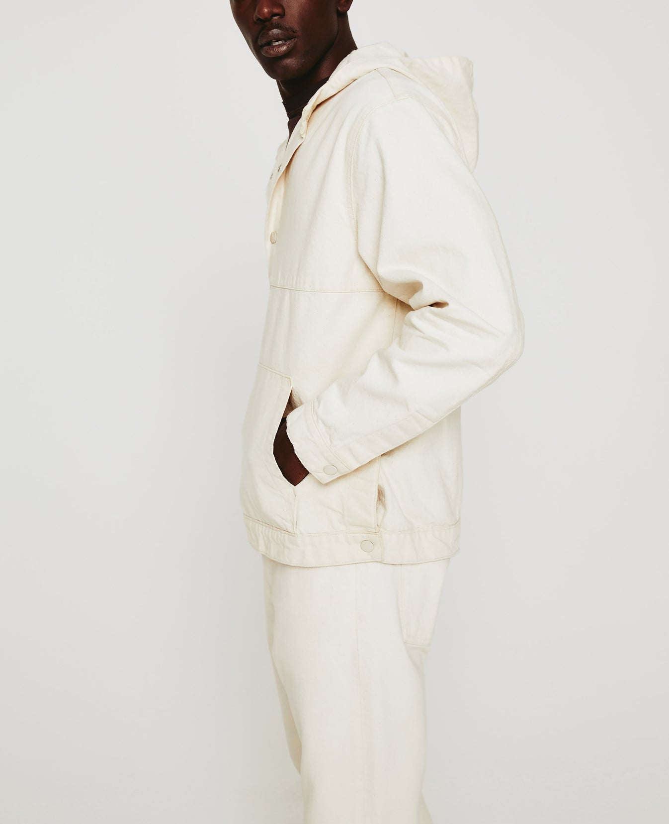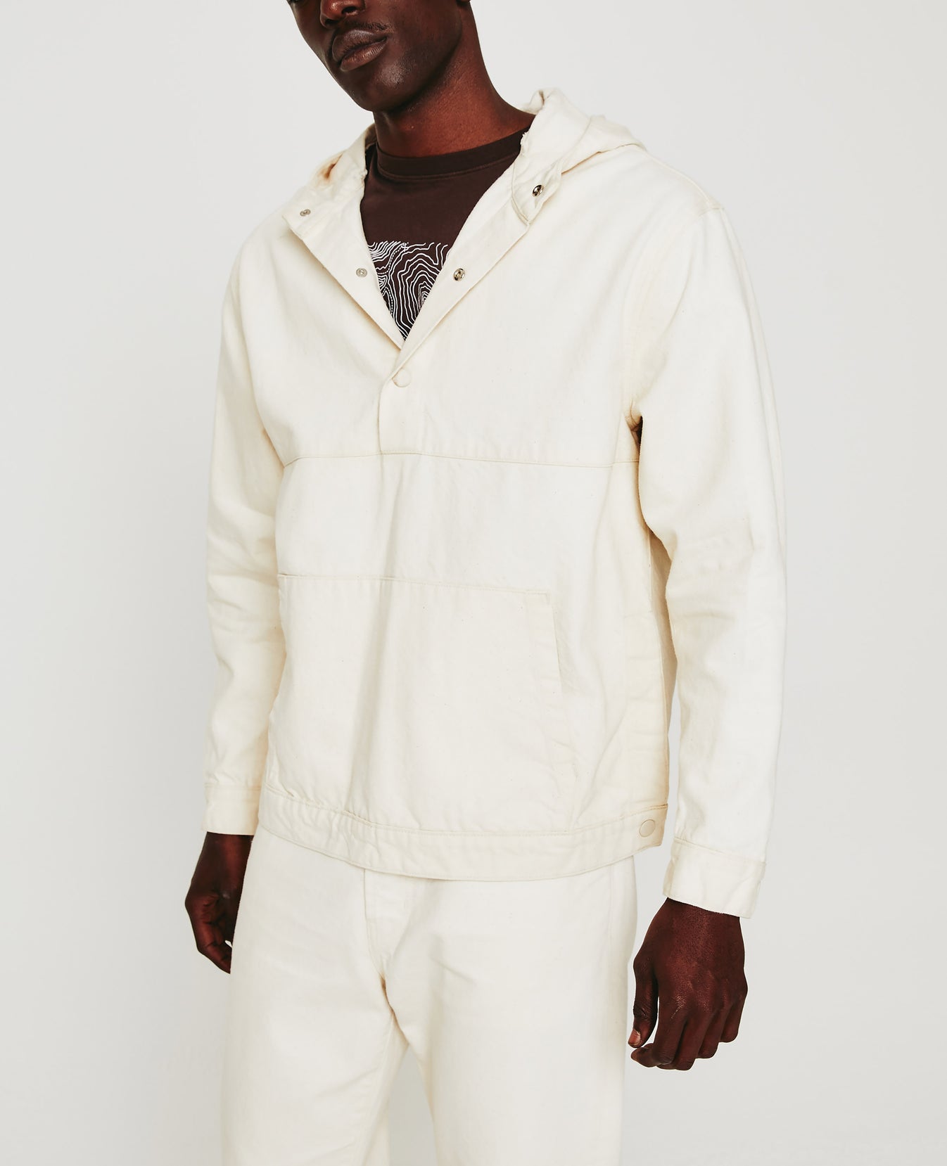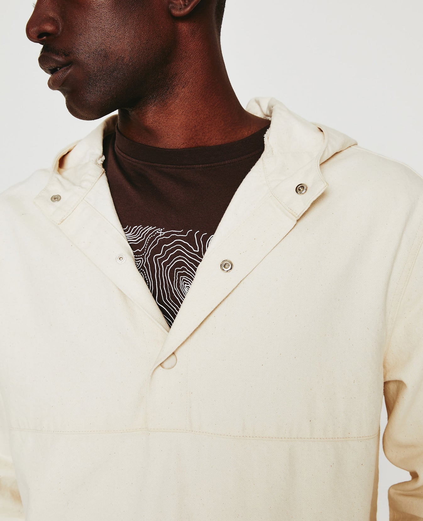 The Valen is our new pullover anorak, updated with a modern monochrome look. Made from 100% cotton Natural Bull Denim in a warm off-white shade, this men's jacket has a roomy hood, a half-placket with soft-touch snap closures, and a pouch pocket at the front.
