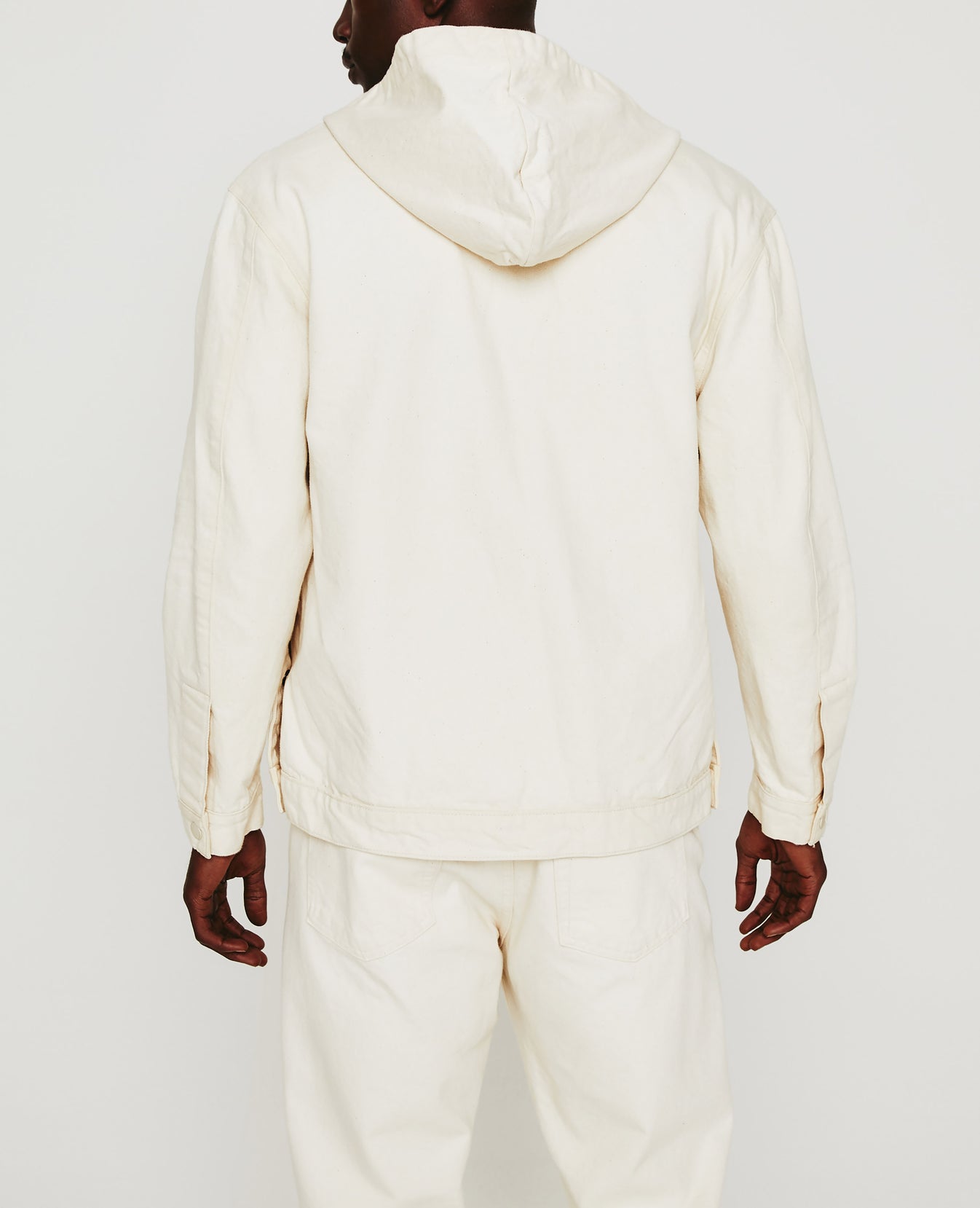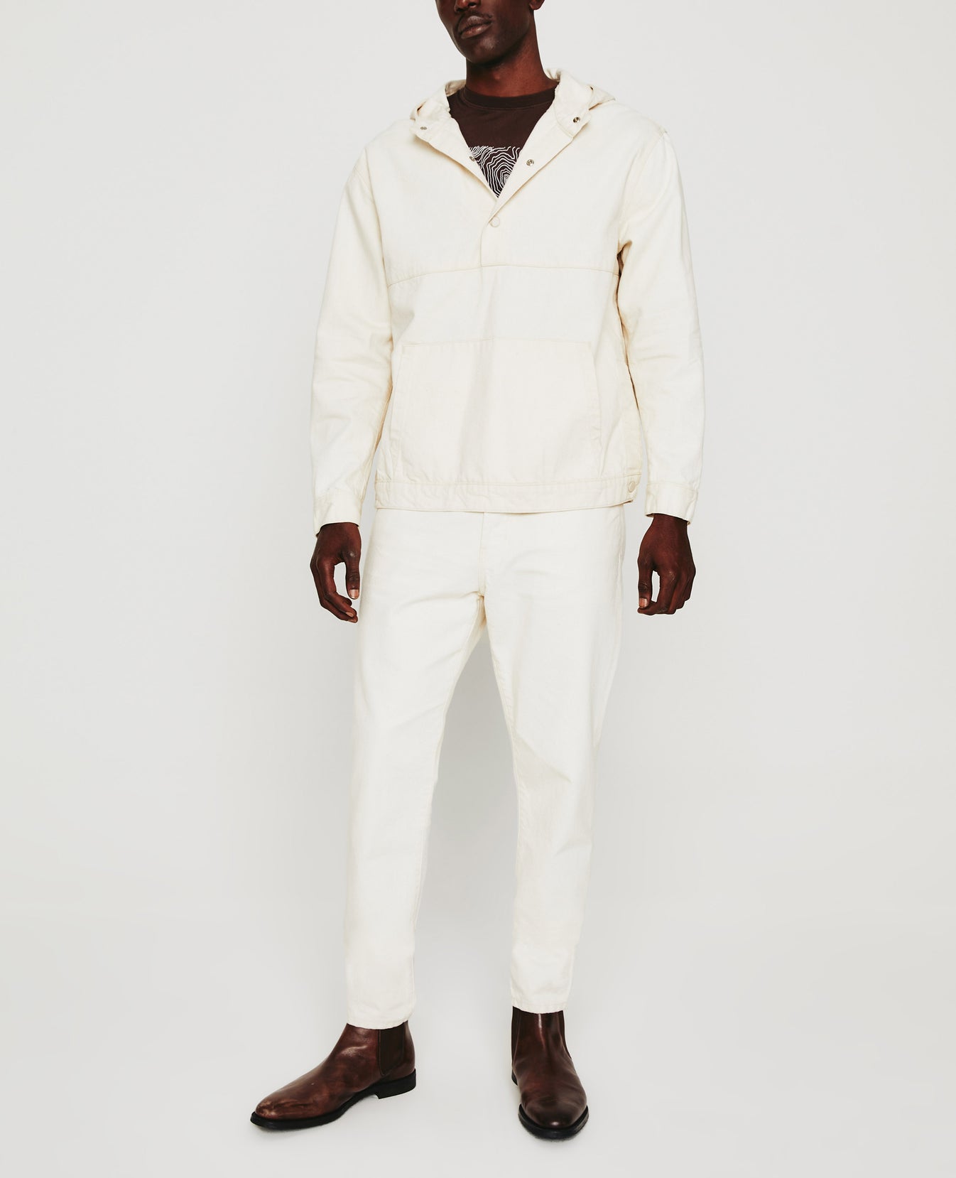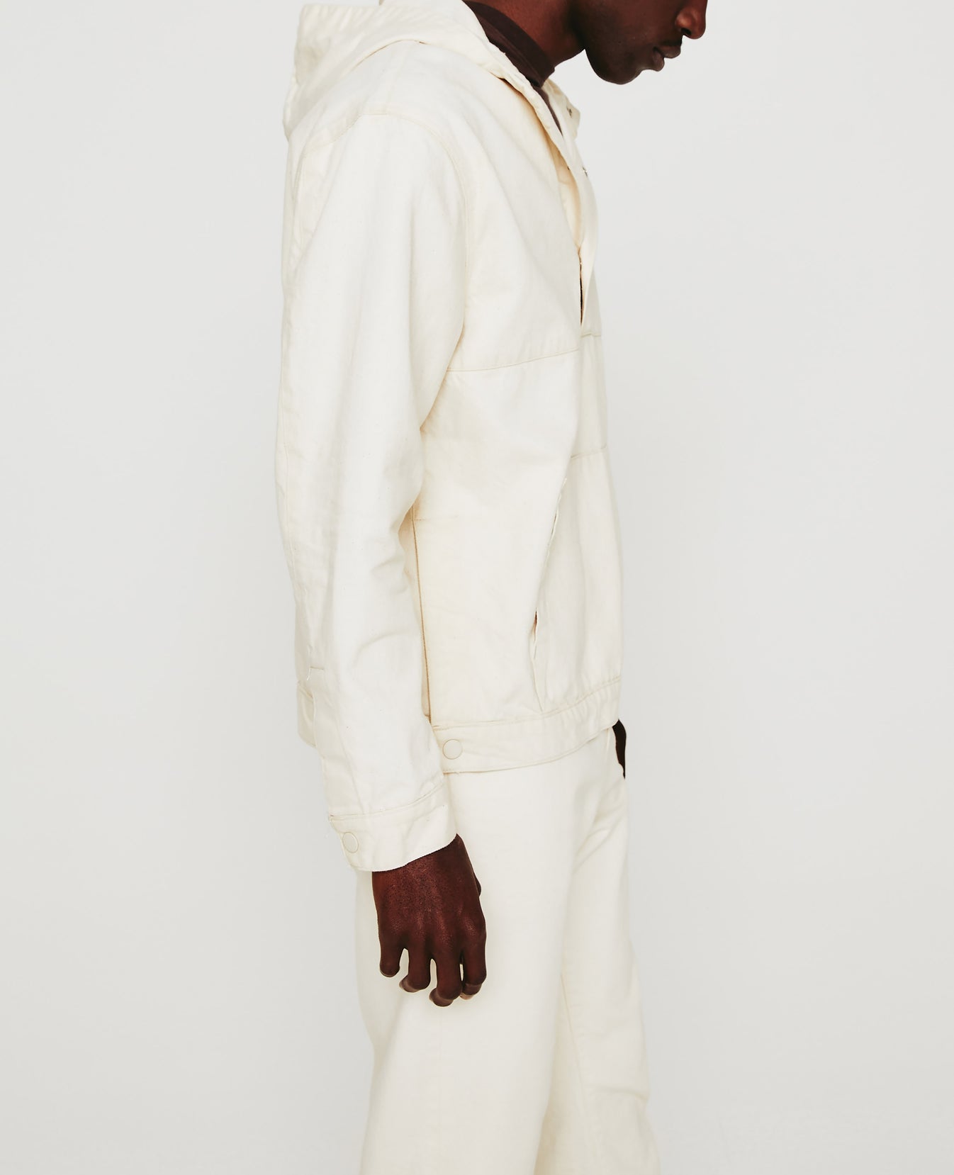 The Valen is our new pullover anorak, updated with a modern monochrome look. Made from 100% cotton Natural Bull Denim in a warm off-white shade, this men's jacket has a roomy hood, a half-placket with soft-touch snap closures, and a pouch pocket at the front.