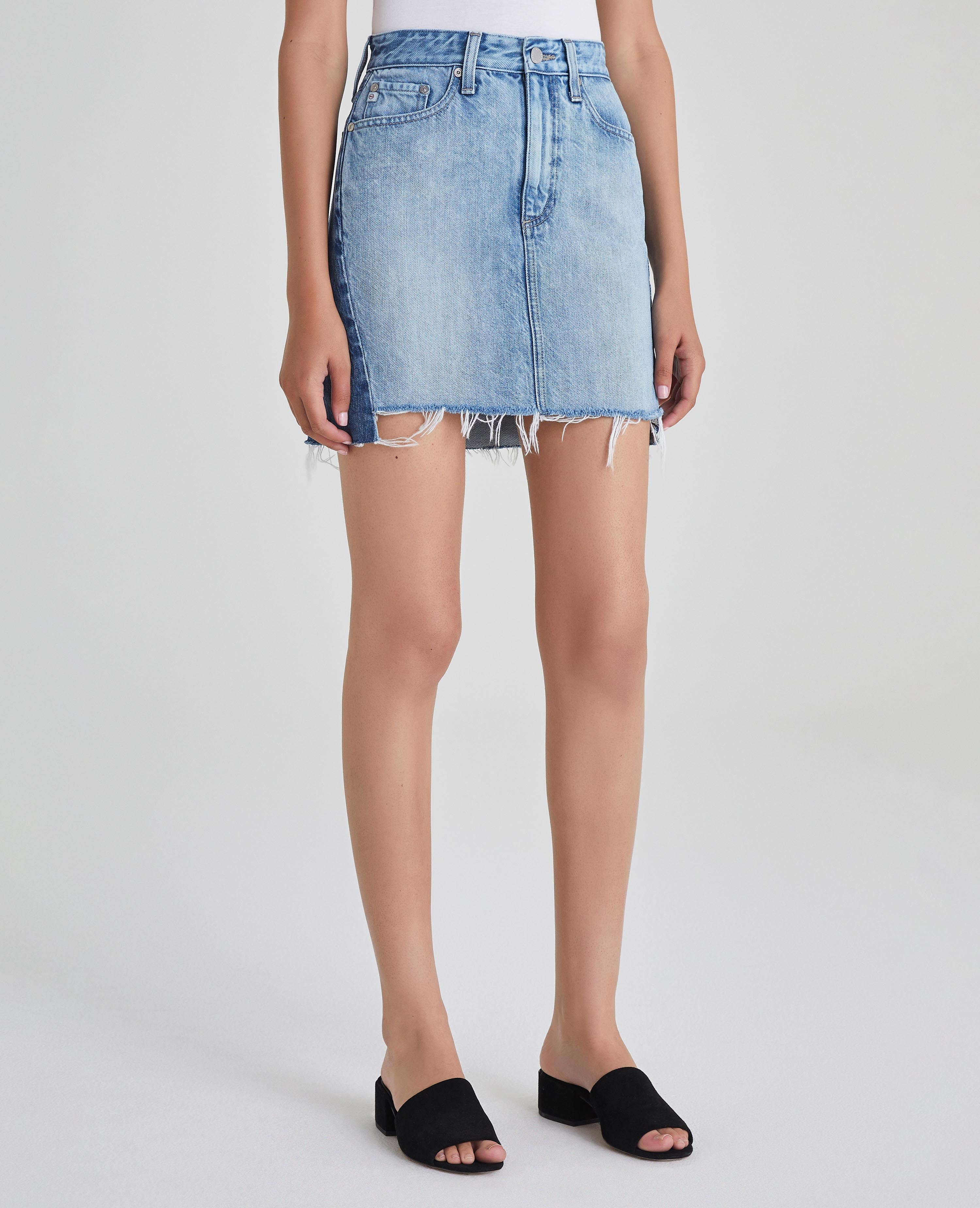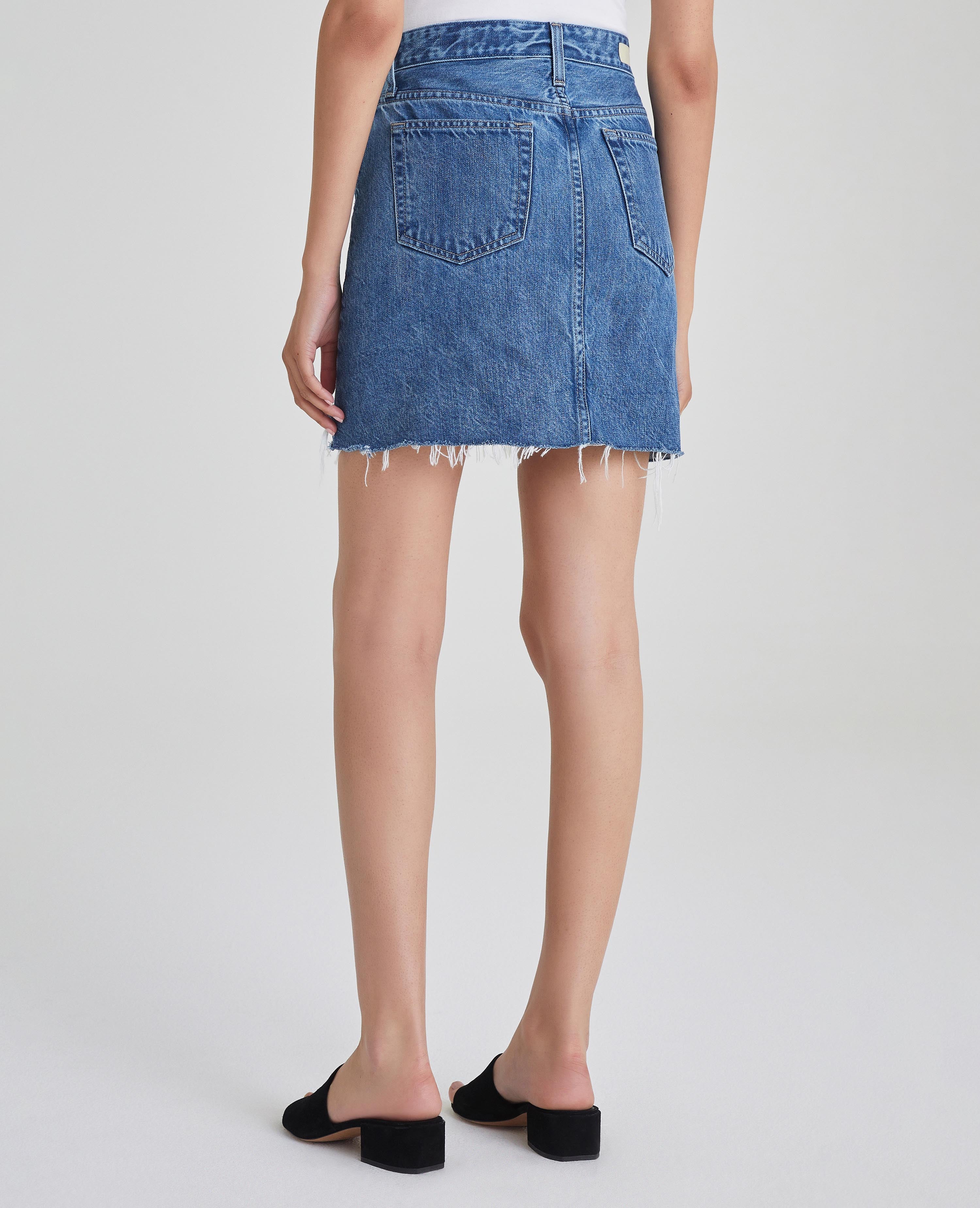 Vera Skirt is a denim mini skirt for women featuring an light-medium denim wash that’s been uniquely worn-in to mimic a pair of genuine vintage jeans. Vera offers raw hem in a slight A line silhouette. This women’s jean skirt is designed in an exclusive, AG non-stretch denim fabricated from 50% pima cotton for an ultra-soft touch and auntic slub character that only ages better with wear.