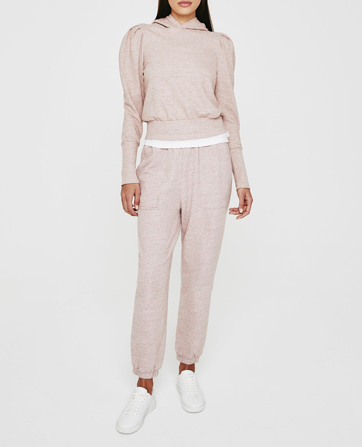 The Walker Sweatshirt for women in heather grey features a relaxed silhouette with a shortened waistband in elastic ribbing, and a sporty hood juxtaposed with feminine puff sleeves. This women’s sweatshirt is designed in exclusive 9 oz. Soft Heather Terry—and features an ultra-chic, unbelievably soft, and color-rich finish.