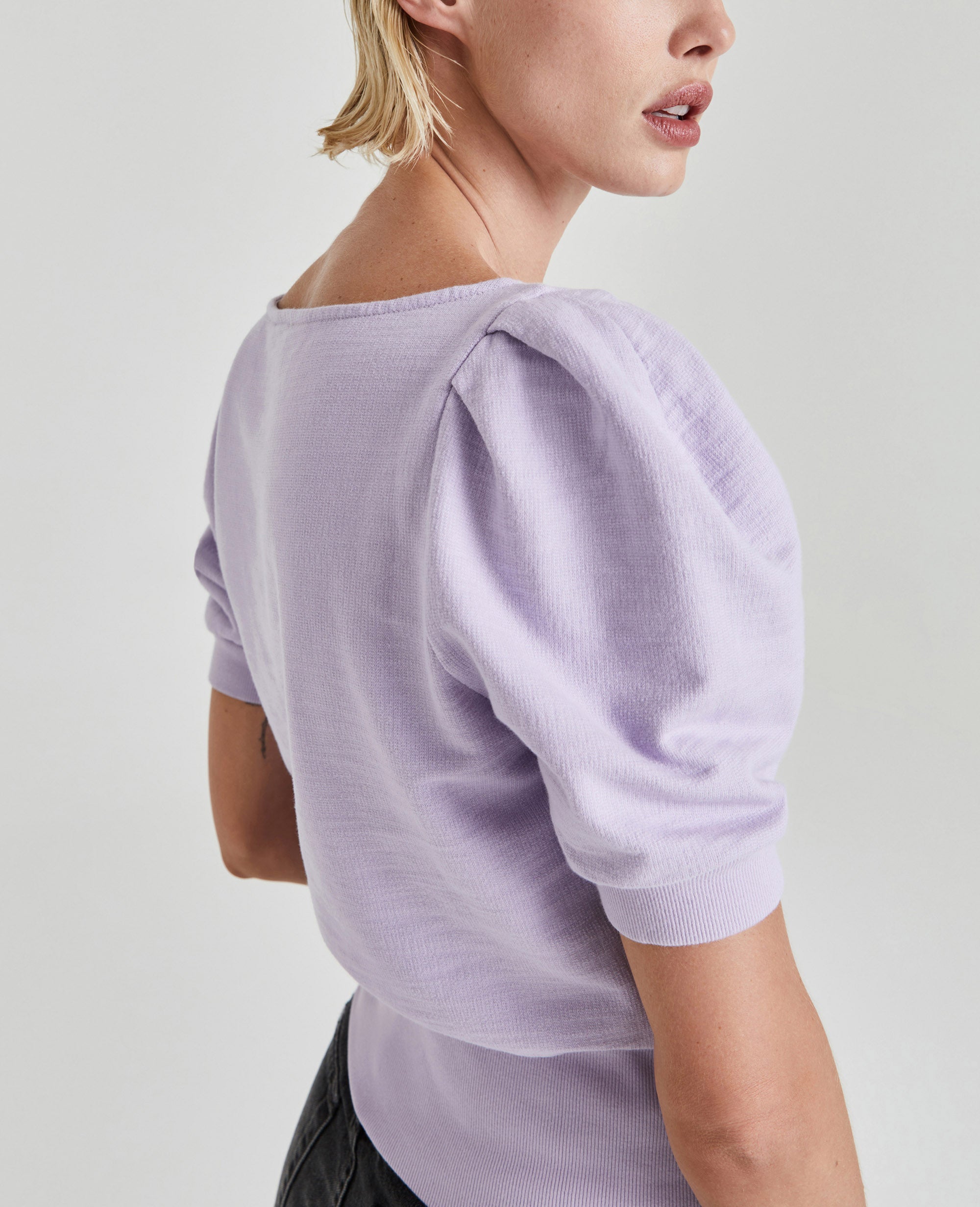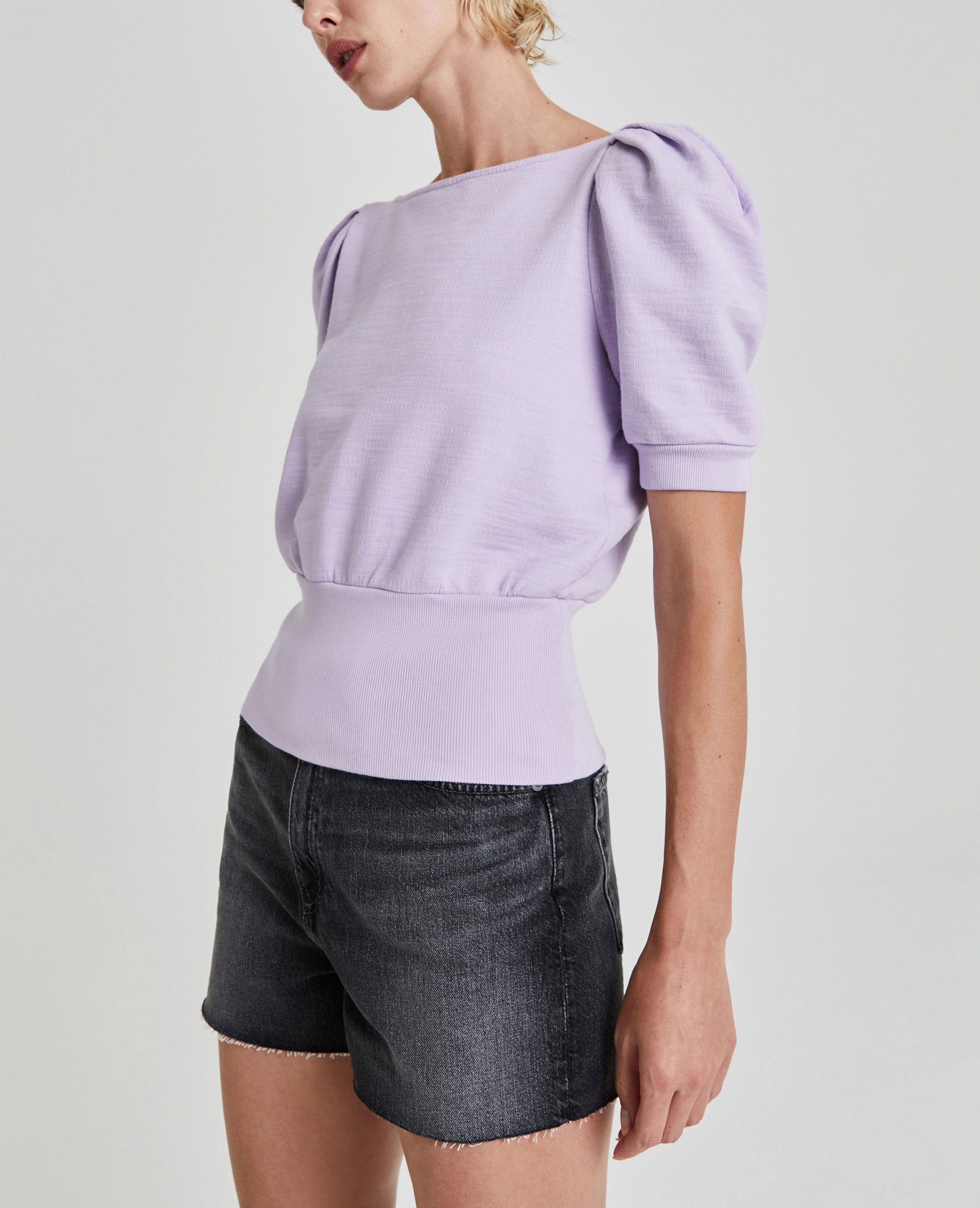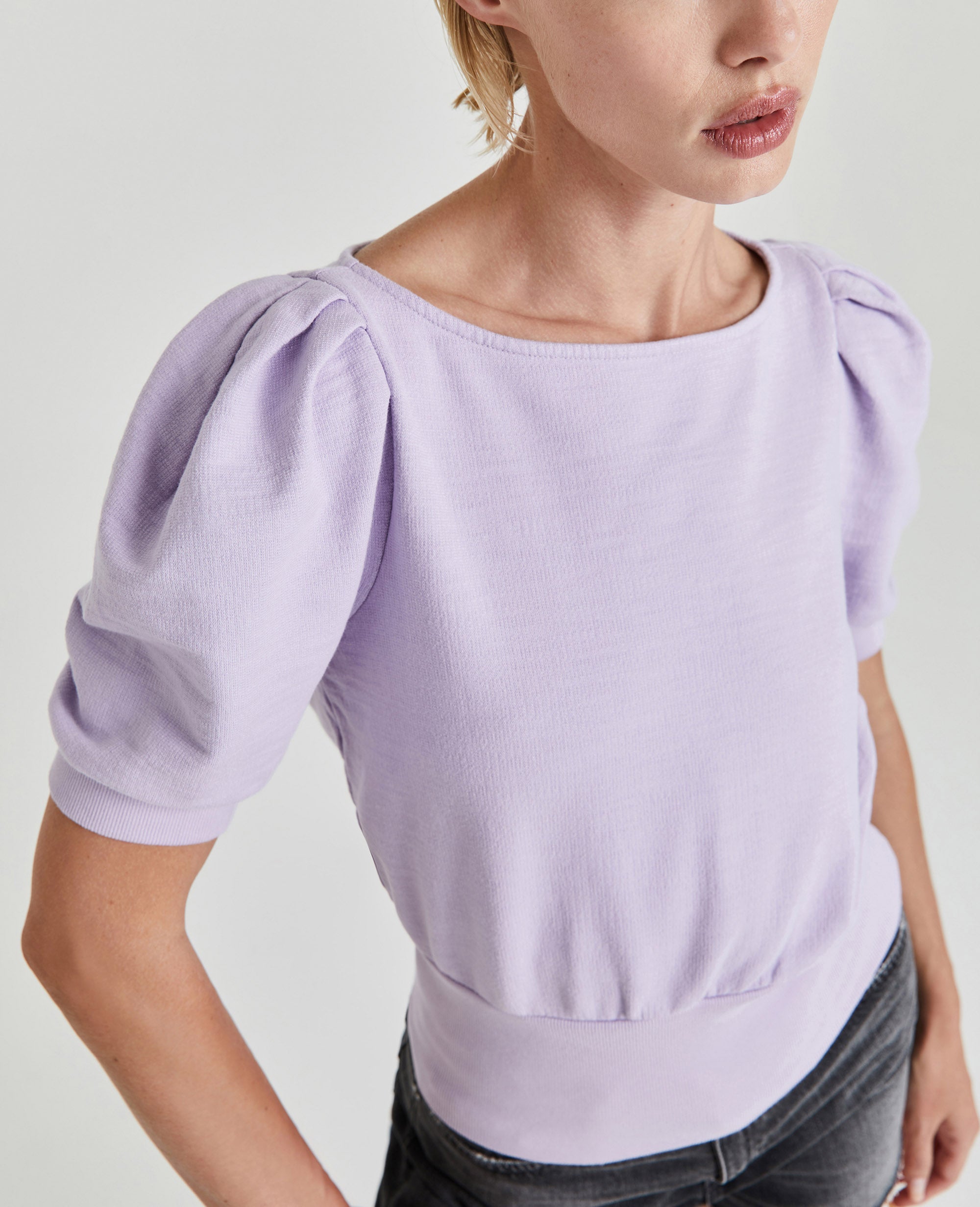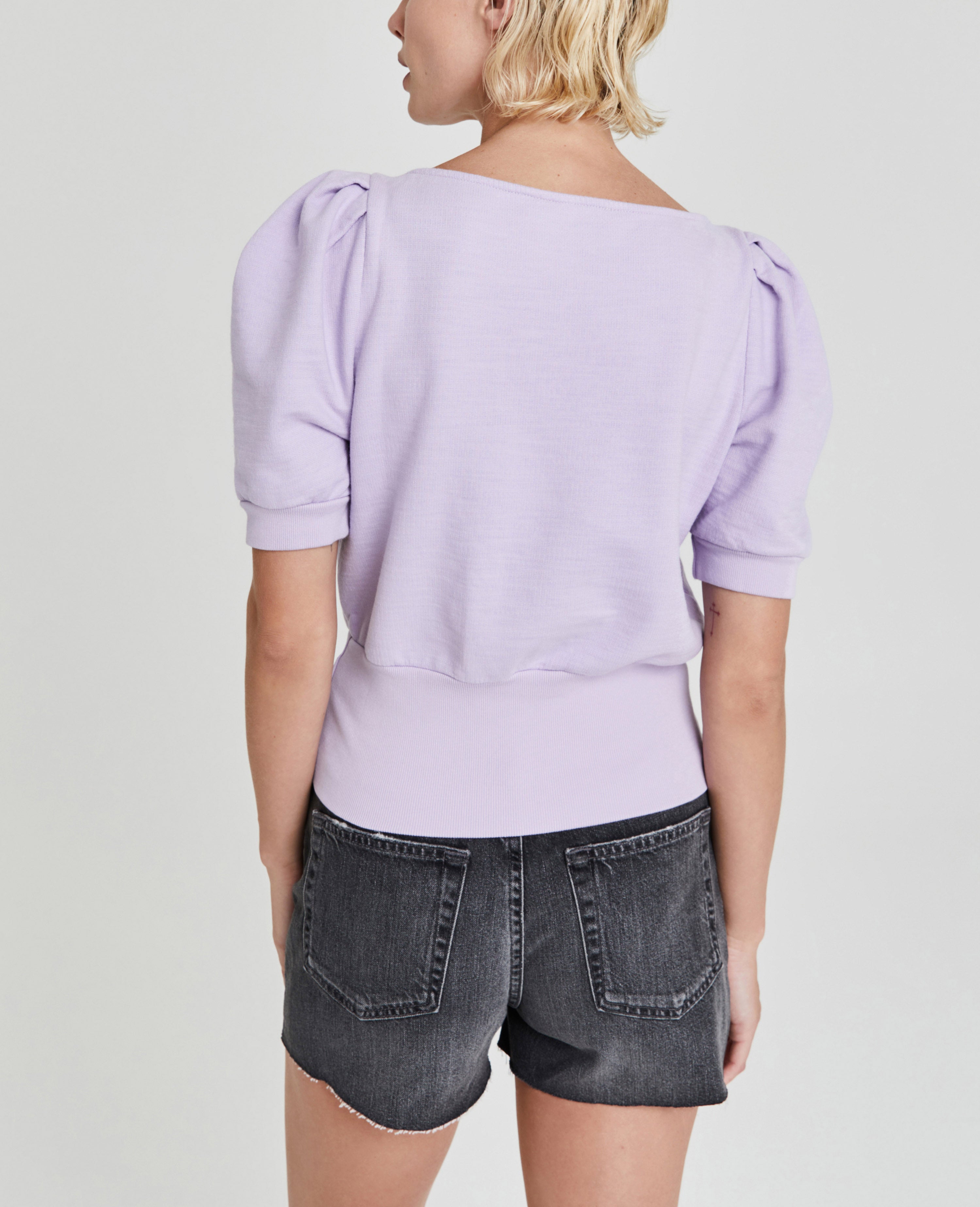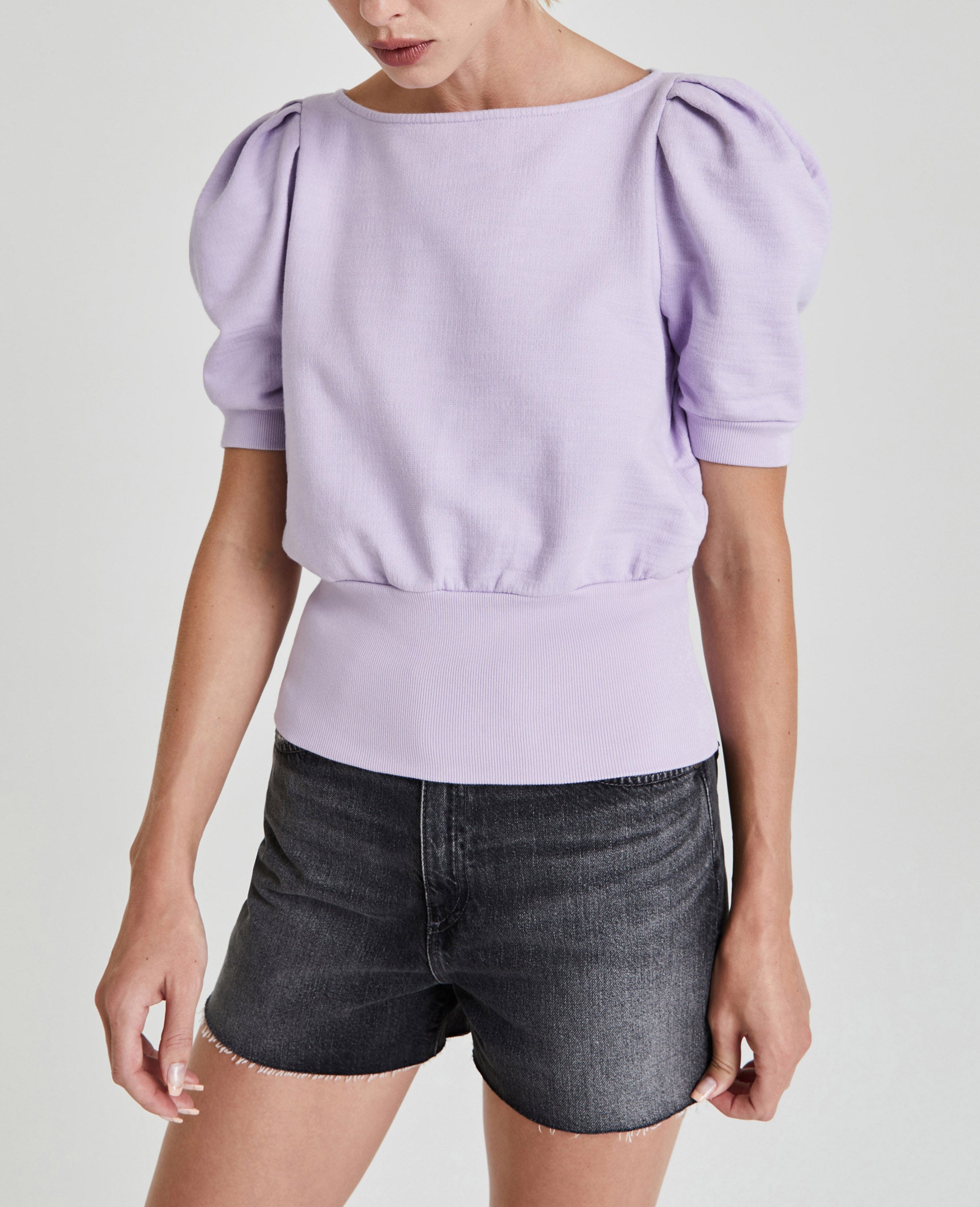 The Walker Short Sleeve for women in pastel lilac features a relaxed silhouette with a feminine boat neck, puff sleeves, and a wide waistband in elastic ribbing. This women’s tee is designed in exclusive AG-made French terry—and features an ultra-chic, unbelievably soft, and color-rich finish.