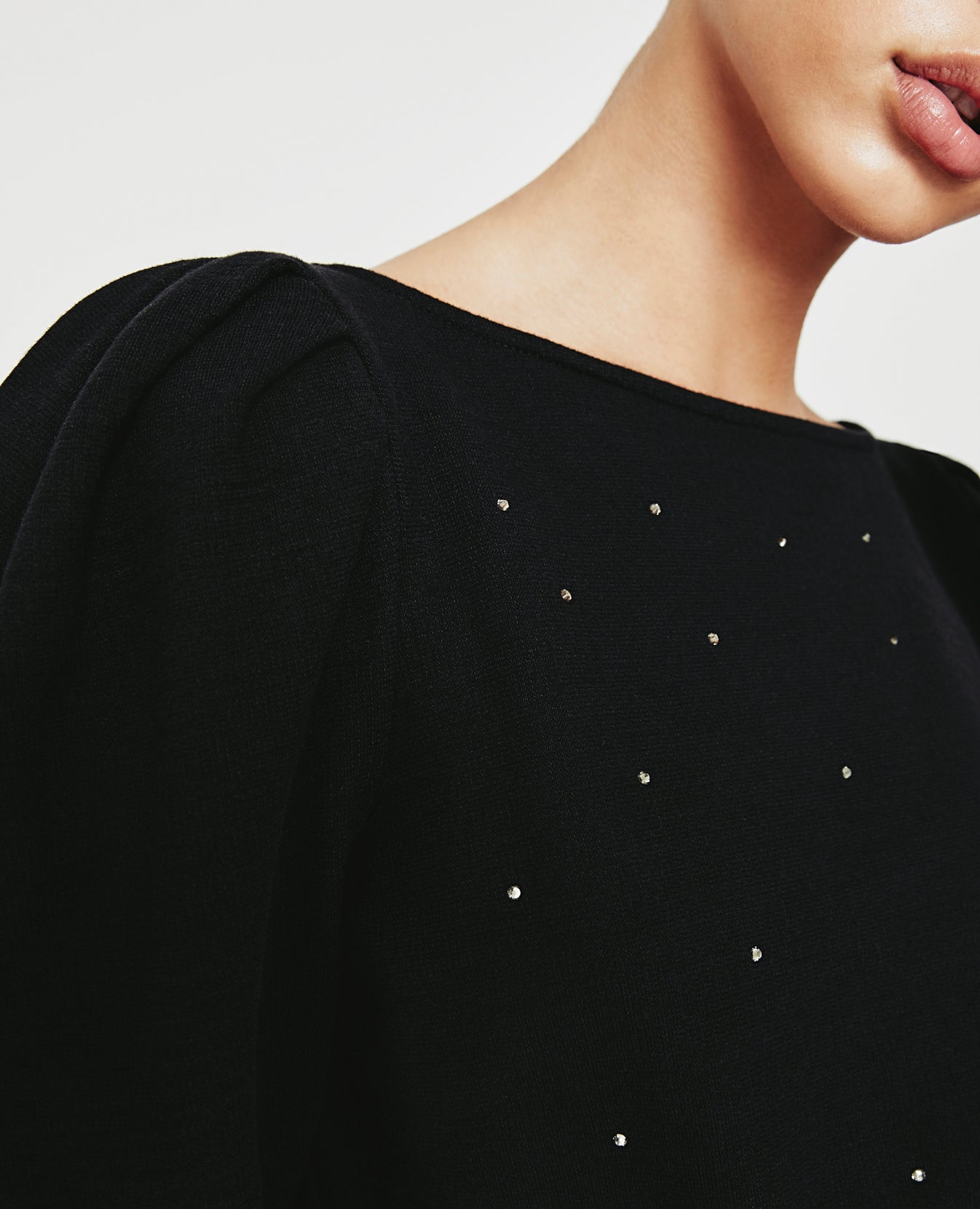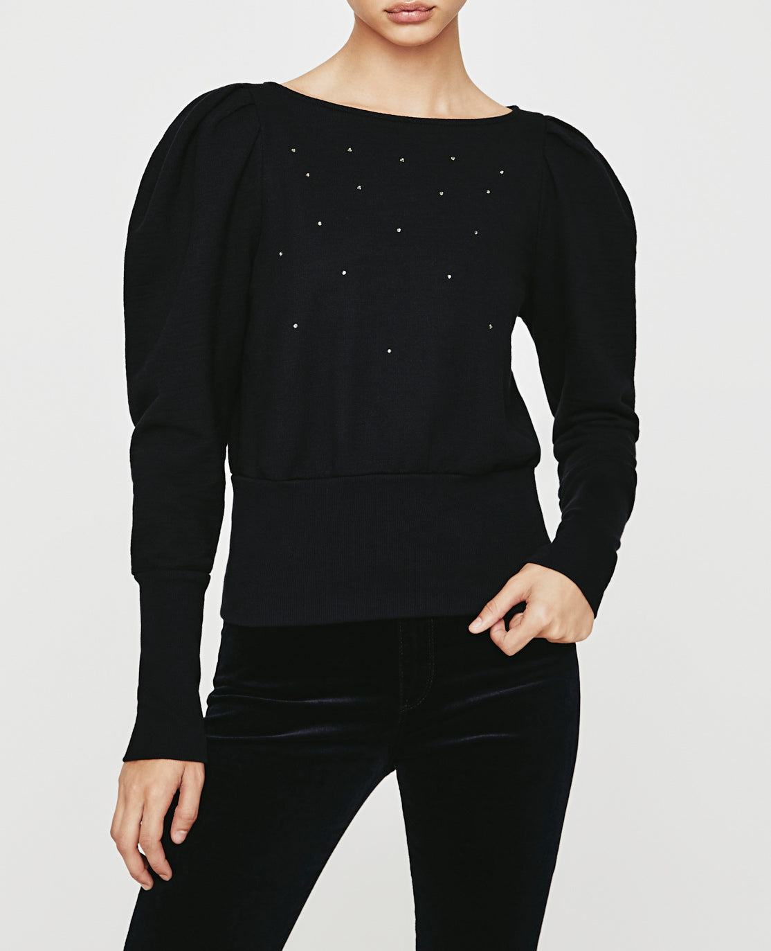 The Walker Sweatshirt for women in true black features rhinestone embellishment on a relaxed silhouette with a feminine boat neck, puff sleeves, and a wide waistband in elastic ribbing. This women’s sweatshirt is designed in exclusive AG-made terry—and features an ultra-chic, unbelievably soft, and color-rich finish.