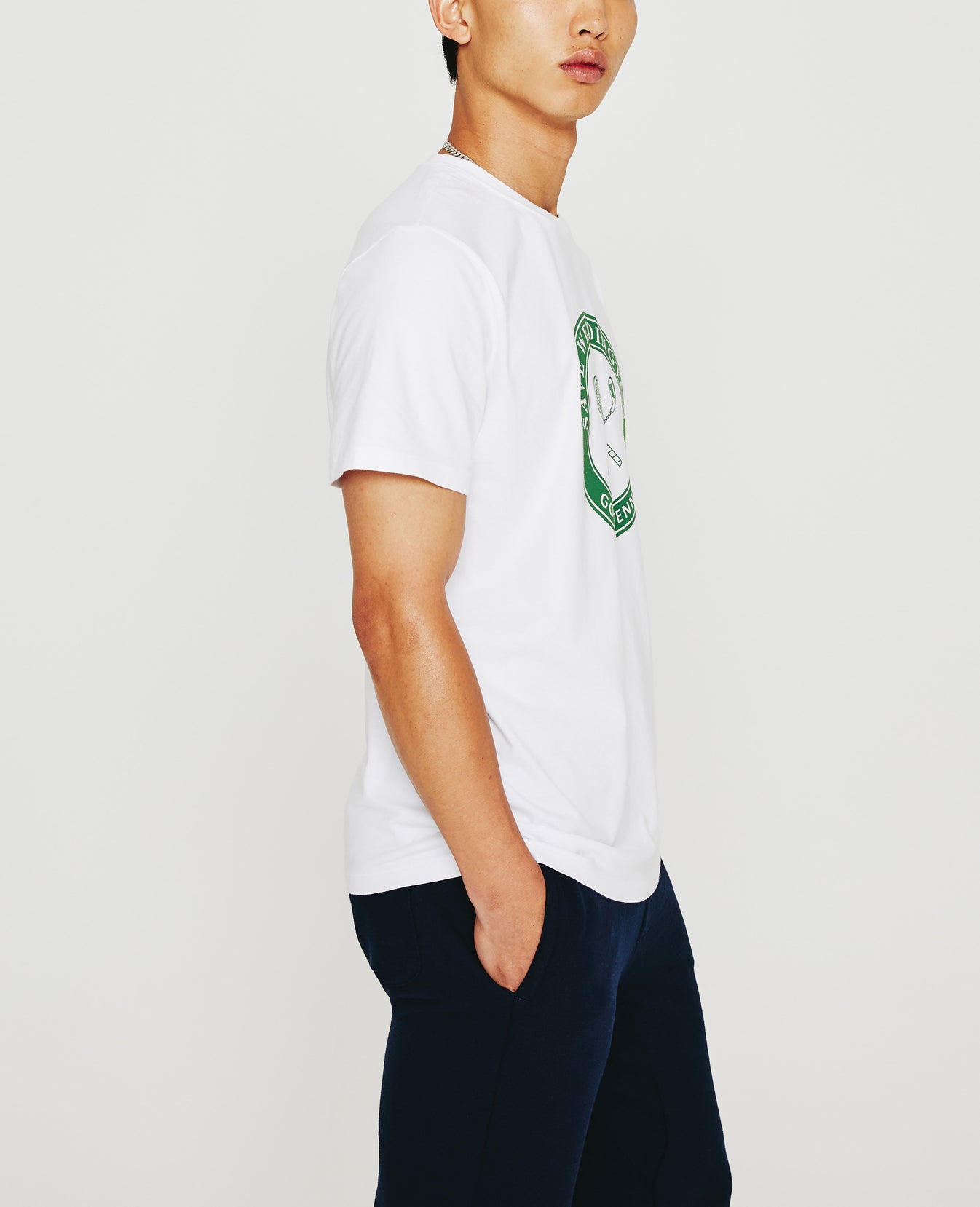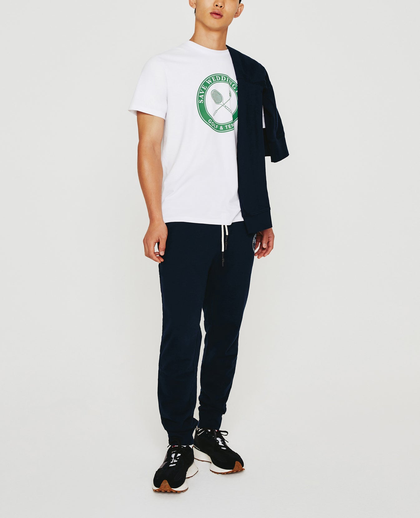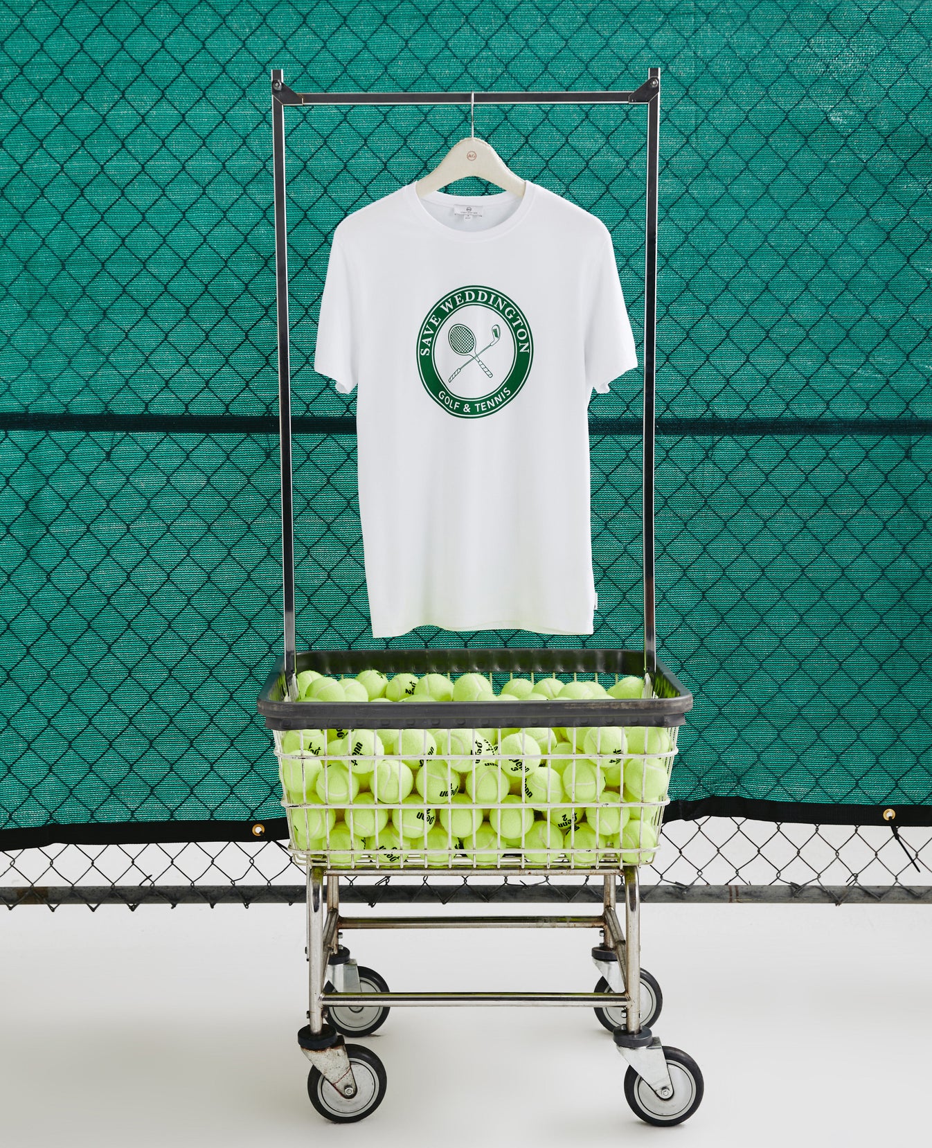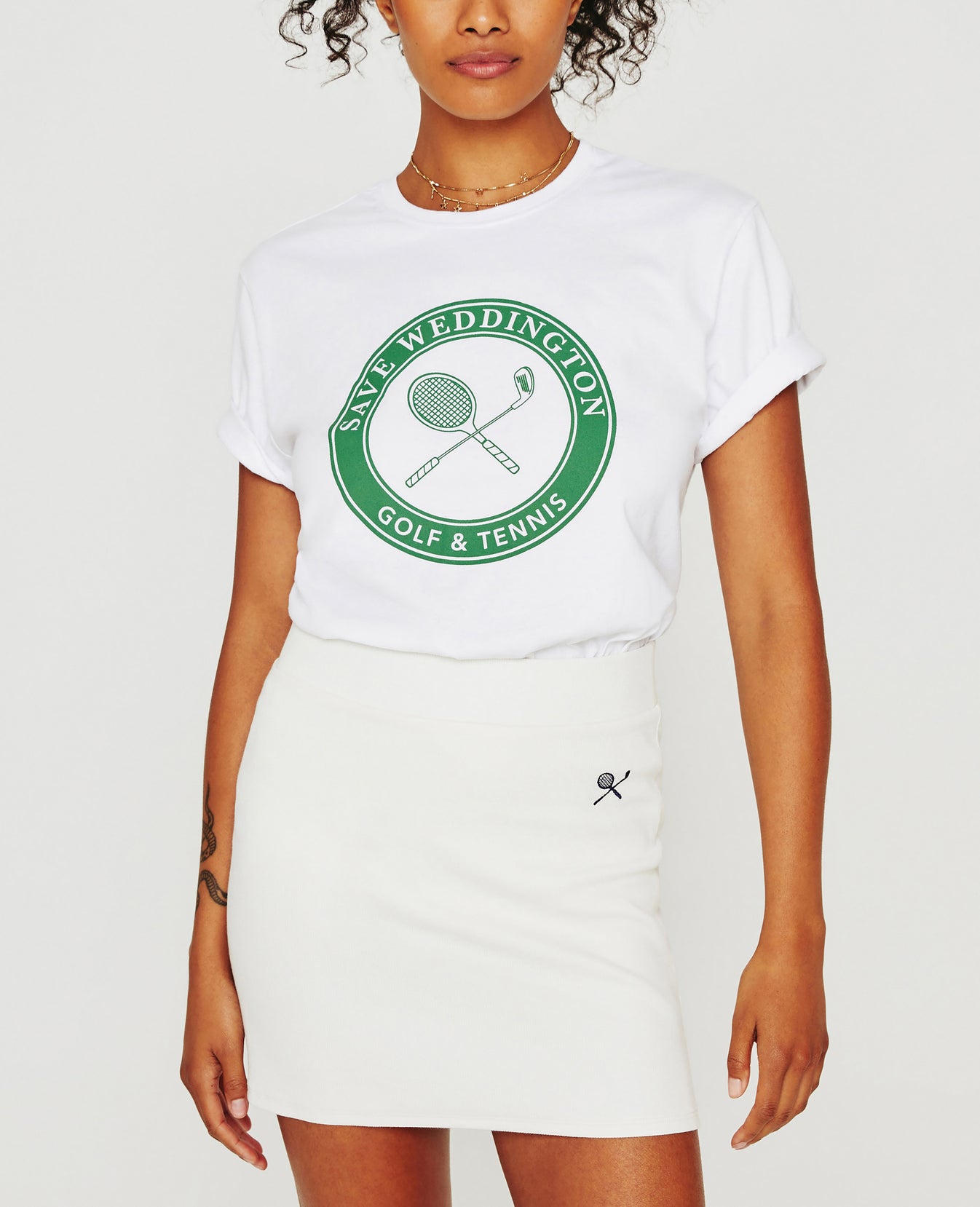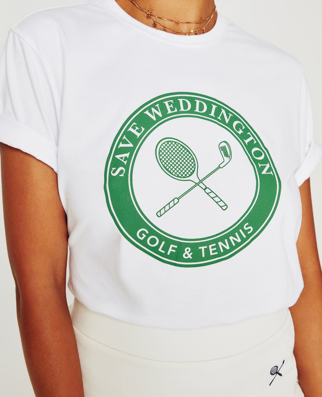Help keep our green spaces green. The Weddington Crew is a classic short-sleeve T-shirt in white cotton-blend jersey with 'Save Weddington Golf & Tennis' printed at the front. Designed in partnership with the Save Weddington Organization, a portion of proceeds goes toward protecting one of Los Angeles' beloved green spaces, currently under threat of development.