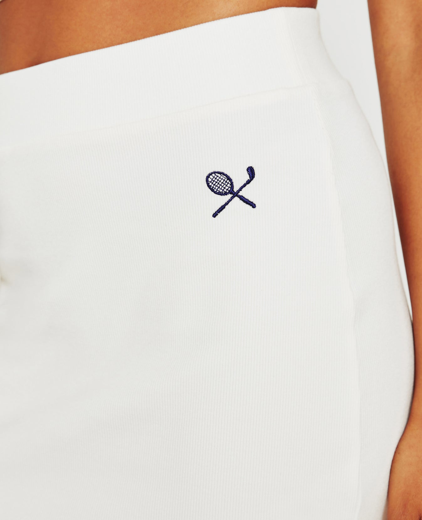 Help keep our green spaces green. The Weddington Skirt has a clingy, formfitting silhouette in a comfortable heavy rib knit with an elasticized waist. It's a comfortable pull-on mini in fresh white with a navy-blue tennis racket and golf club embroidered at the left hip. Designed in partnership with the Save Weddington Organization, a portion of proceeds goes toward protecting one of Los Angeles' beloved green spaces, currently under threat of development.