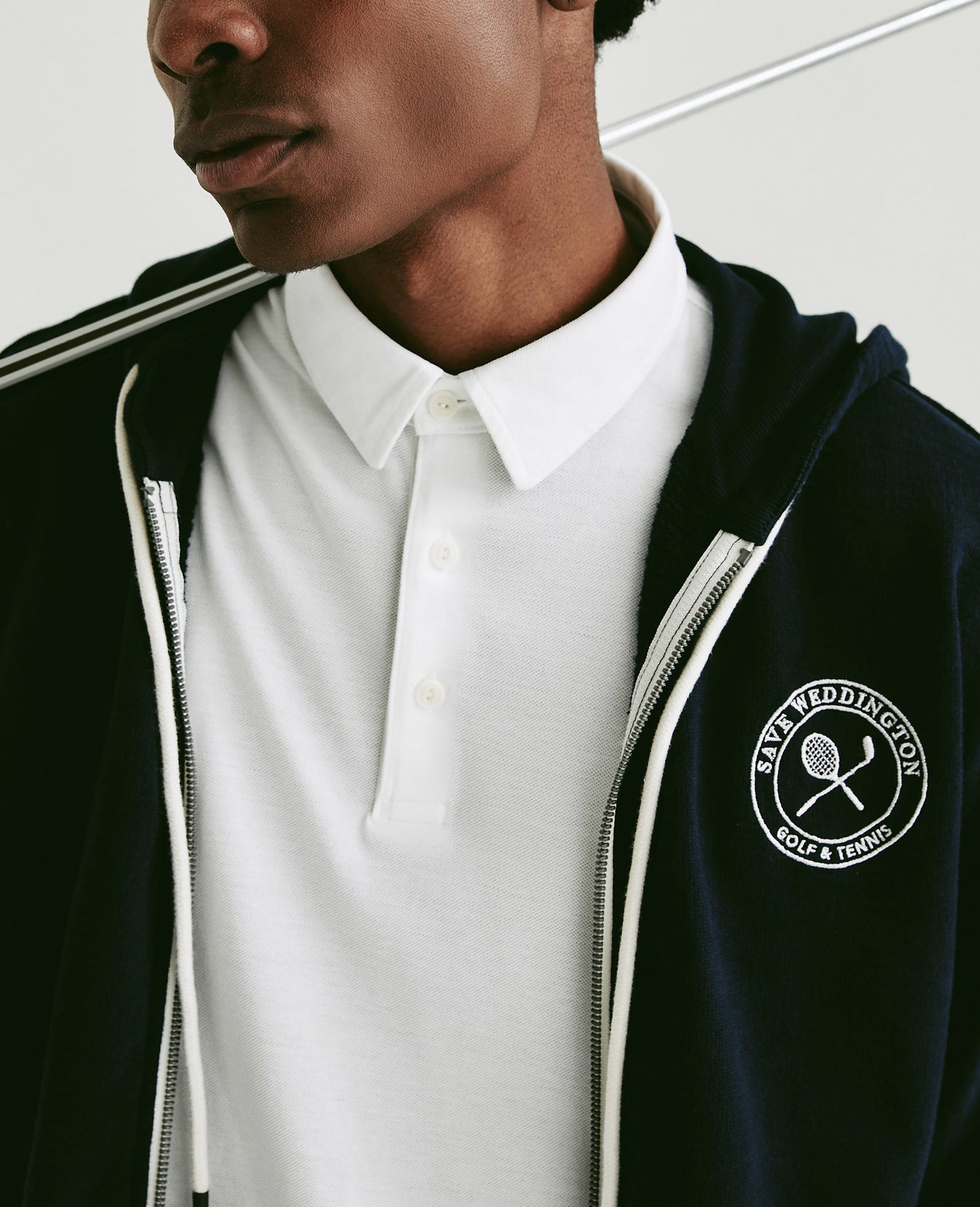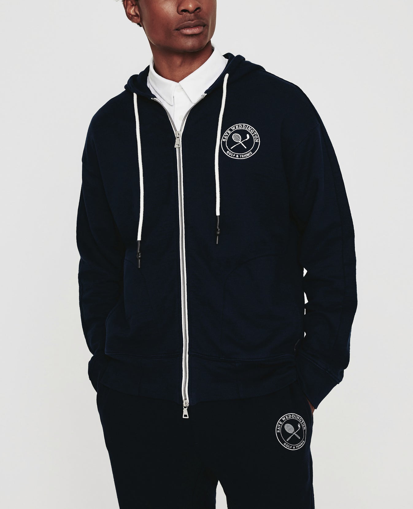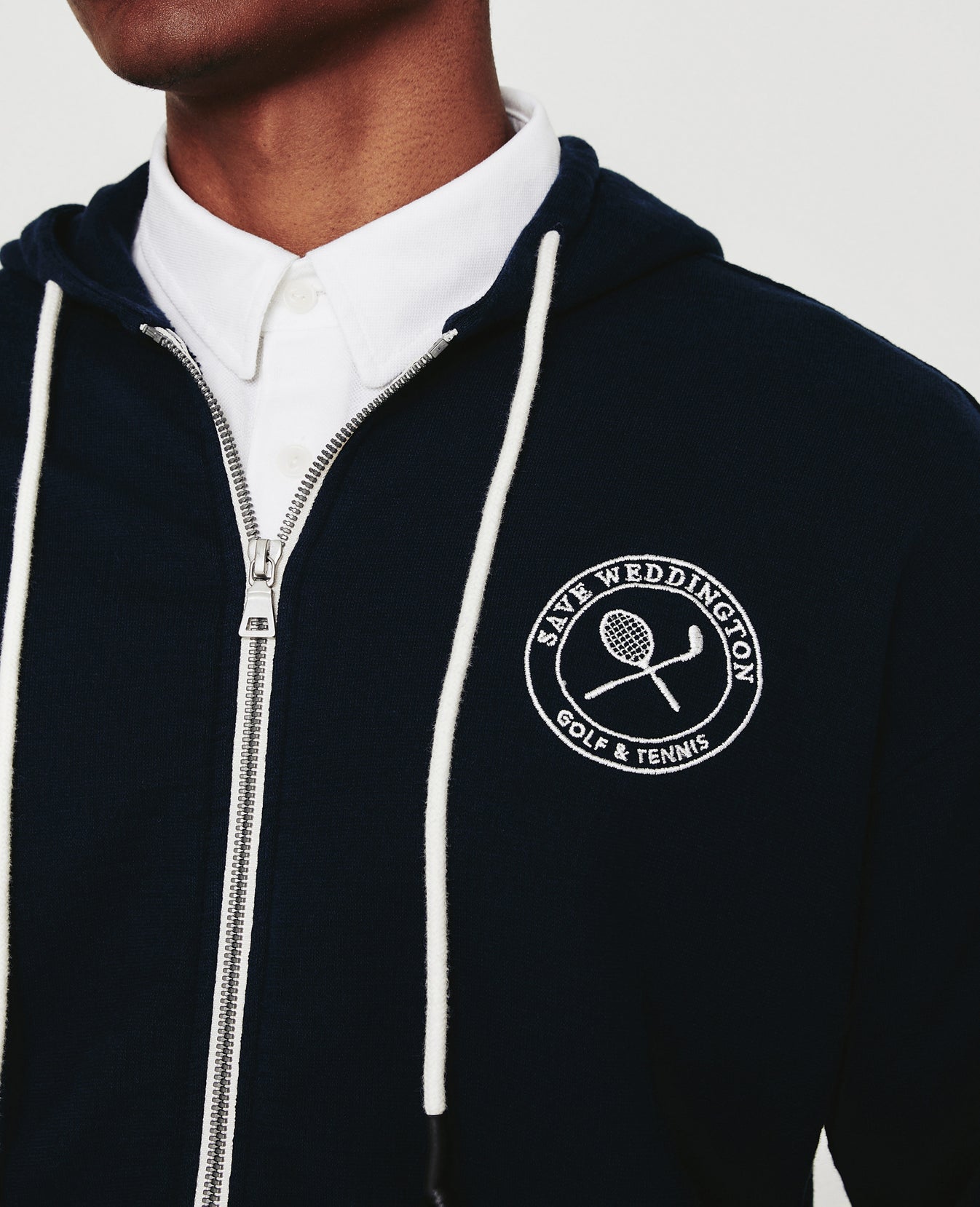 Help keep our green spaces green. The Weddington Zip Hoodie is cut from 100% cotton slub loopback terry in navy and features a white 'Save Weddington Golf & Tennis' crest printed at the chest. This comfortable layering piece has concealed pockets, rib trim, and an adjustable hood with a contrast drawstring. Designed in partnership with the Save Weddington Organization, a portion of proceeds goes toward protecting one of Los Angeles' beloved green spaces, currently under threat of development.