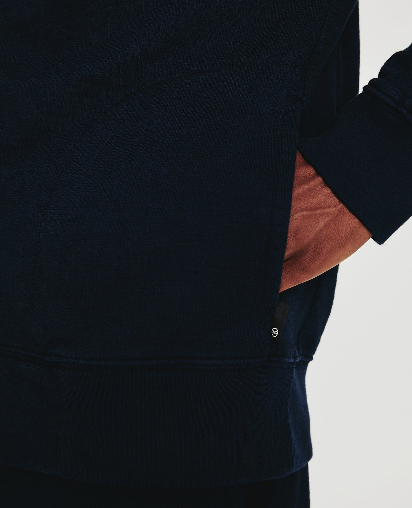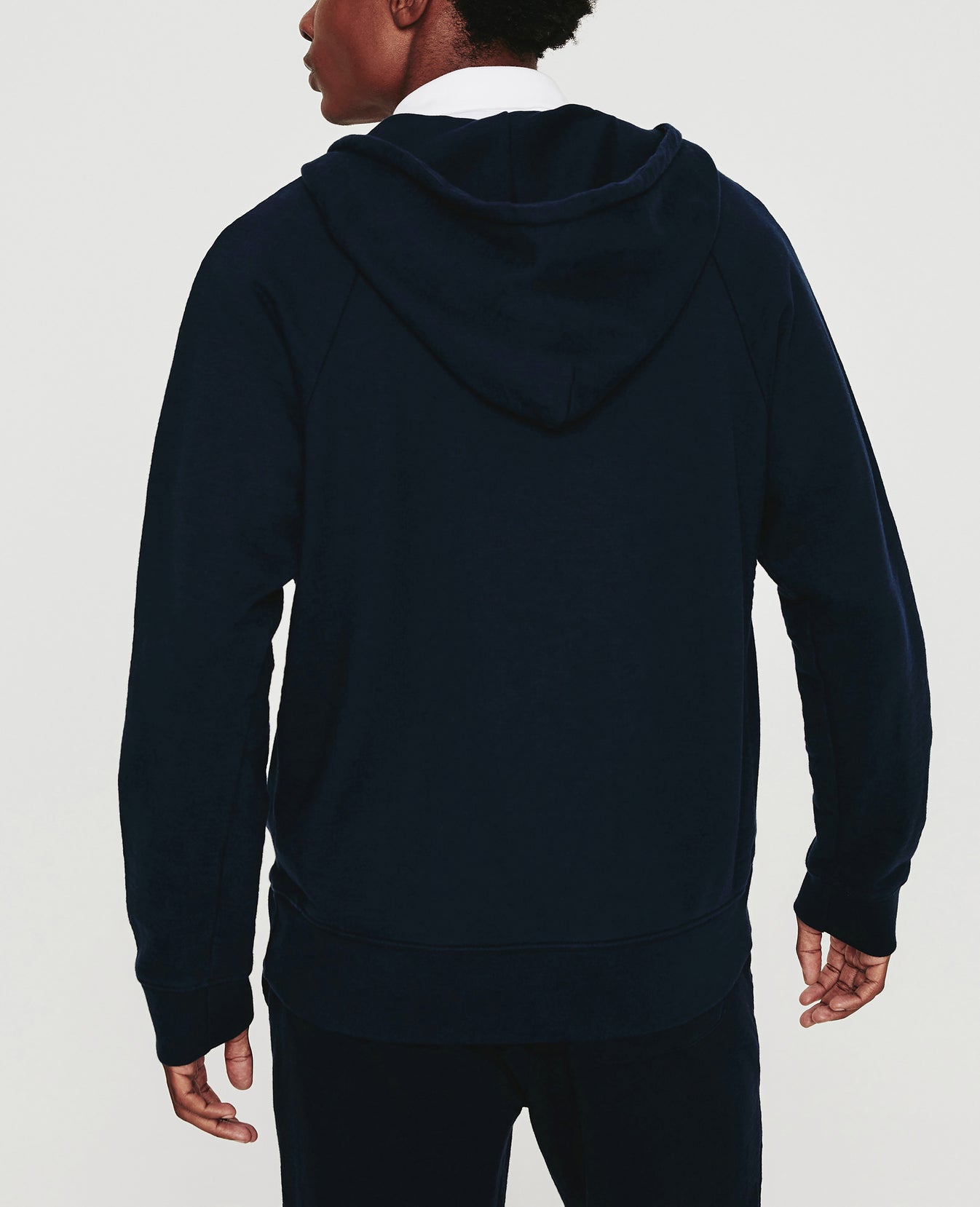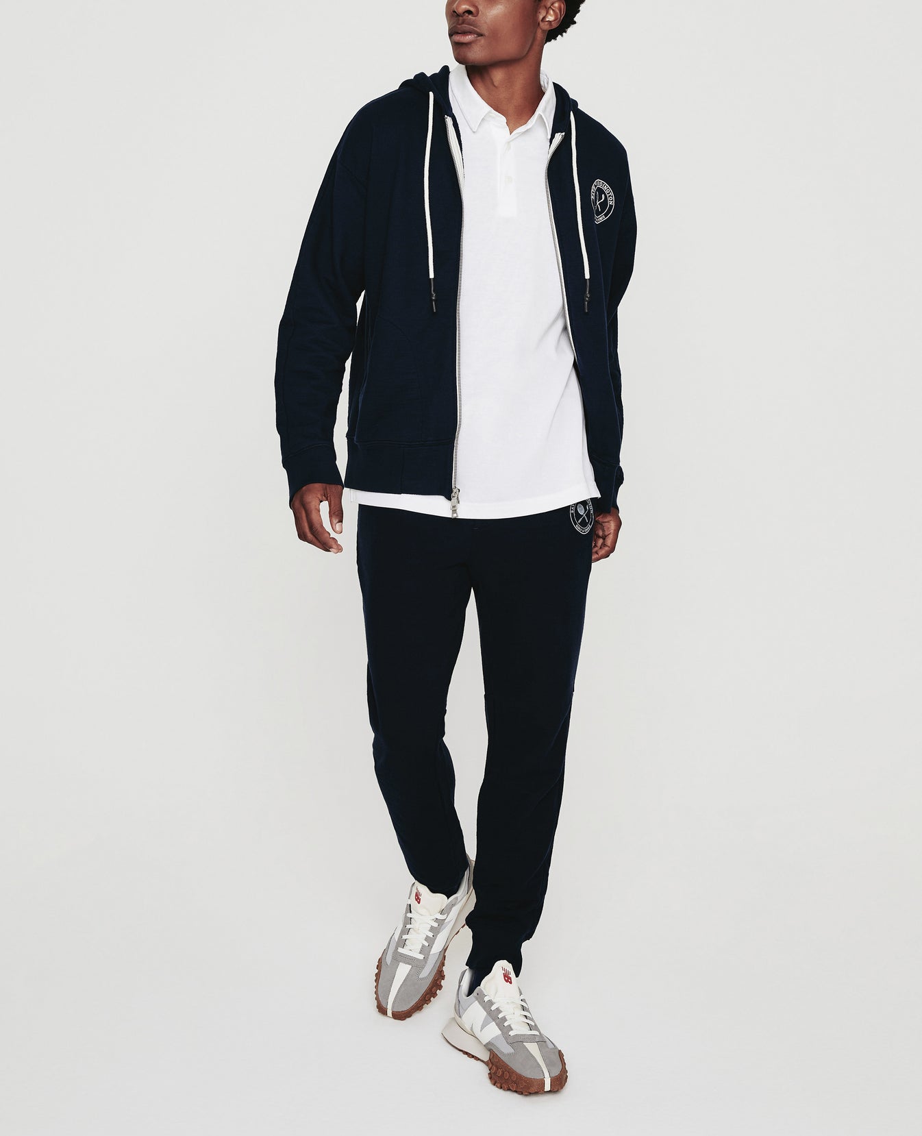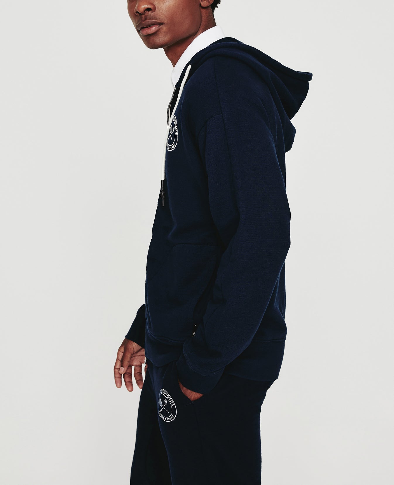 Help keep our green spaces green. The Weddington Zip Hoodie is cut from 100% cotton slub loopback terry in navy and features a white 'Save Weddington Golf & Tennis' crest printed at the chest. This comfortable layering piece has concealed pockets, rib trim, and an adjustable hood with a contrast drawstring. Designed in partnership with the Save Weddington Organization, a portion of proceeds goes toward protecting one of Los Angeles' beloved green spaces, currently under threat of development.
