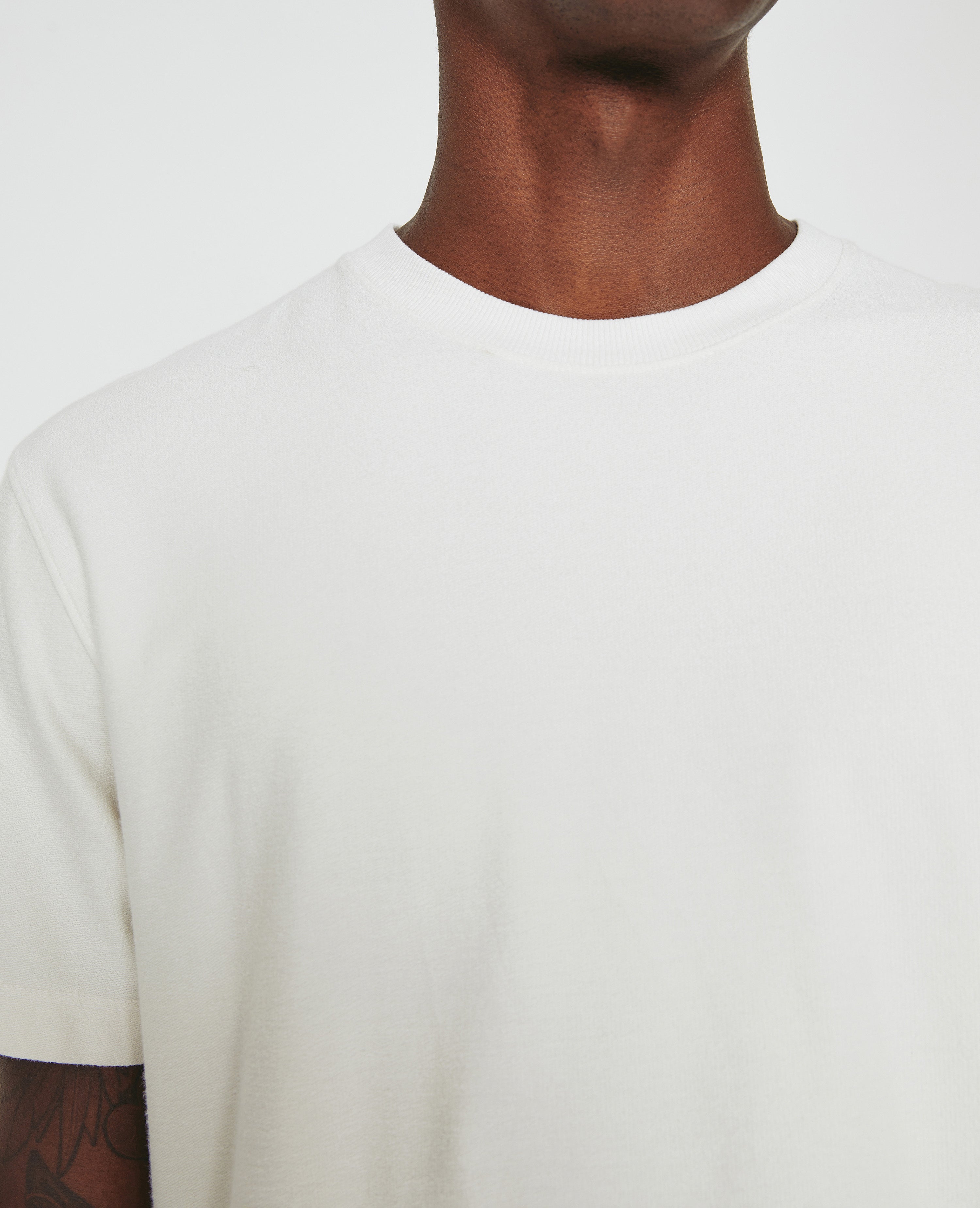 Our Wesley Crew is a relaxed short-sleeve men's tee with drop-shoulder detailing and a wider hem for a more fashion forward fit. Done here in ivory, this T-shirt features cotton-blend Comfort Lightweight Reverse Terry with a touch of stretch. The tiny loops bring natural dimension and softness to the classic short-sleeve tee.