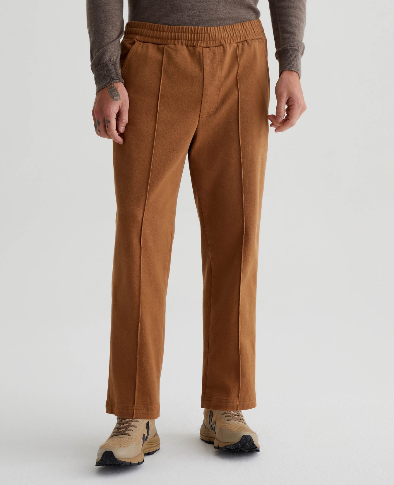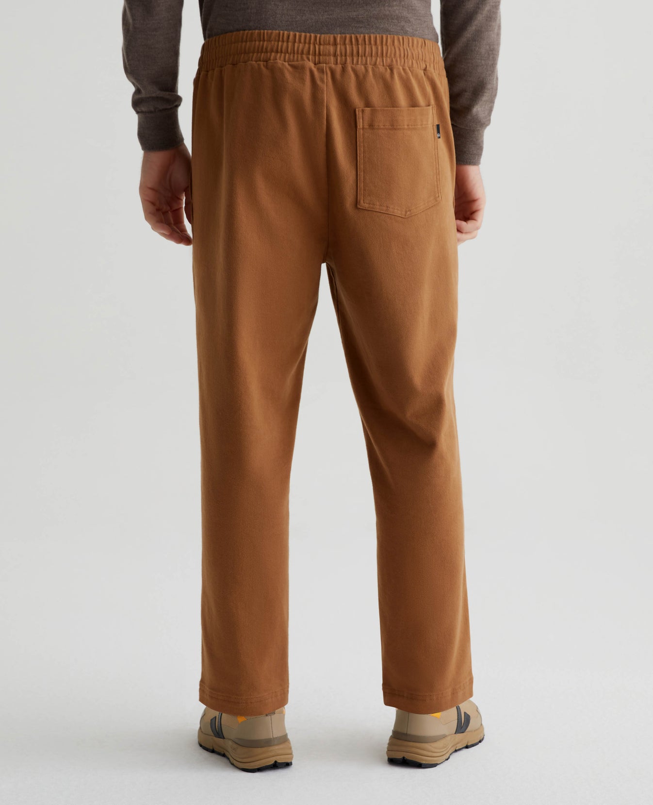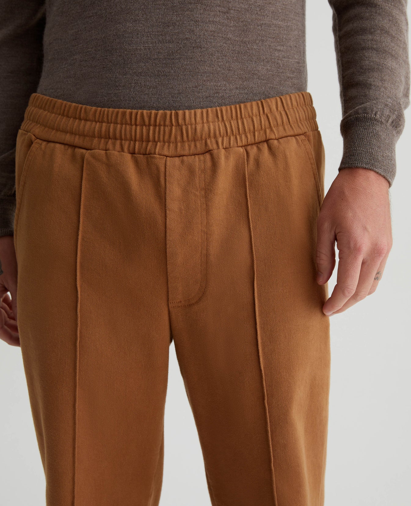 Our Wyatt Sweatpant is an updated men's jogger that nods at classic trouser styling. Designed in 8.7 oz. Hyper Soft Bull Denim from the AG Cloud Soft Denim™ collection, Wyatt has a slim fit featuring an elasticized waist, interior drawstring, and tapered legs with pintuck detailing. Slant front pockets, a clean hem finish, and a single back pocket complete the look. Done in a caramel brown shade, the fabric's special left-hand twill construction allows the yarns to gently relax and untwist for a supple feel that gets softer with every wear. Dual-elastic performance fibers offer premium stretch and recovery.