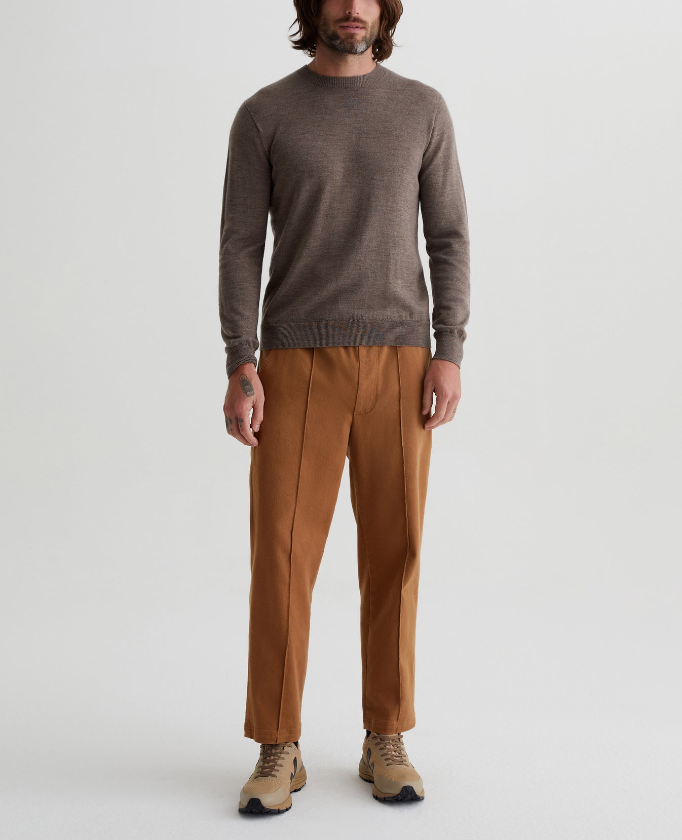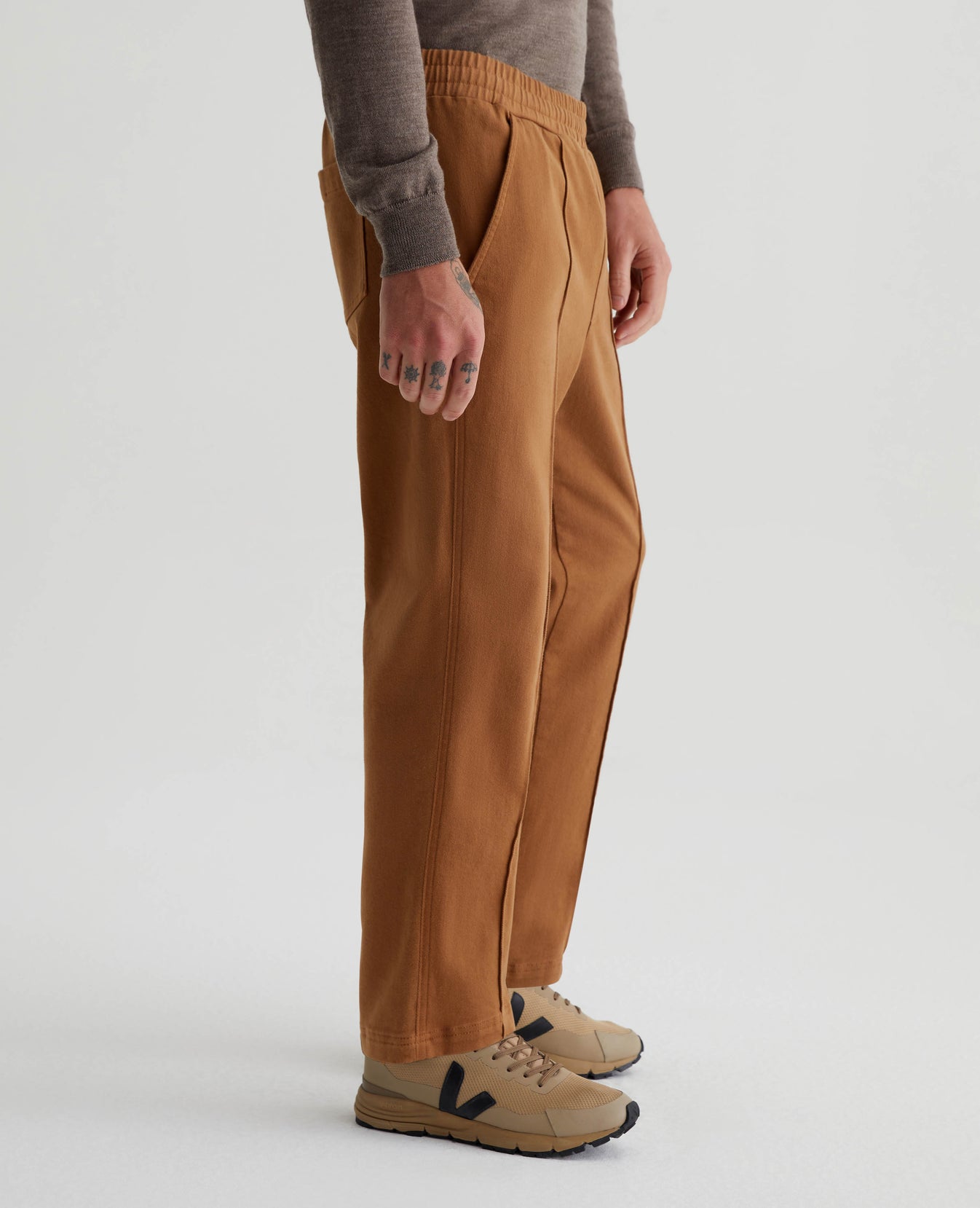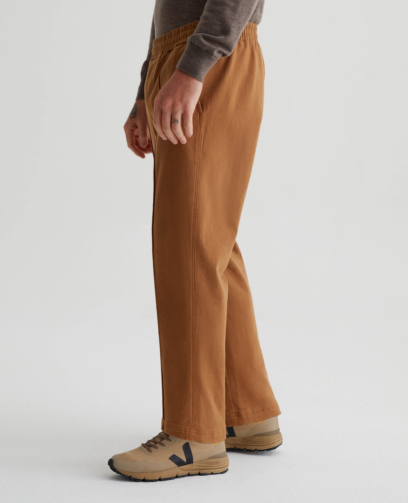 Our Wyatt Sweatpant is an updated men's jogger that nods at classic trouser styling. Designed in 8.7 oz. Hyper Soft Bull Denim from the AG Cloud Soft Denim™ collection, Wyatt has a slim fit featuring an elasticized waist, interior drawstring, and tapered legs with pintuck detailing. Slant front pockets, a clean hem finish, and a single back pocket complete the look. Done in a caramel brown shade, the fabric's special left-hand twill construction allows the yarns to gently relax and untwist for a supple feel that gets softer with every wear. Dual-elastic performance fibers offer premium stretch and recovery.