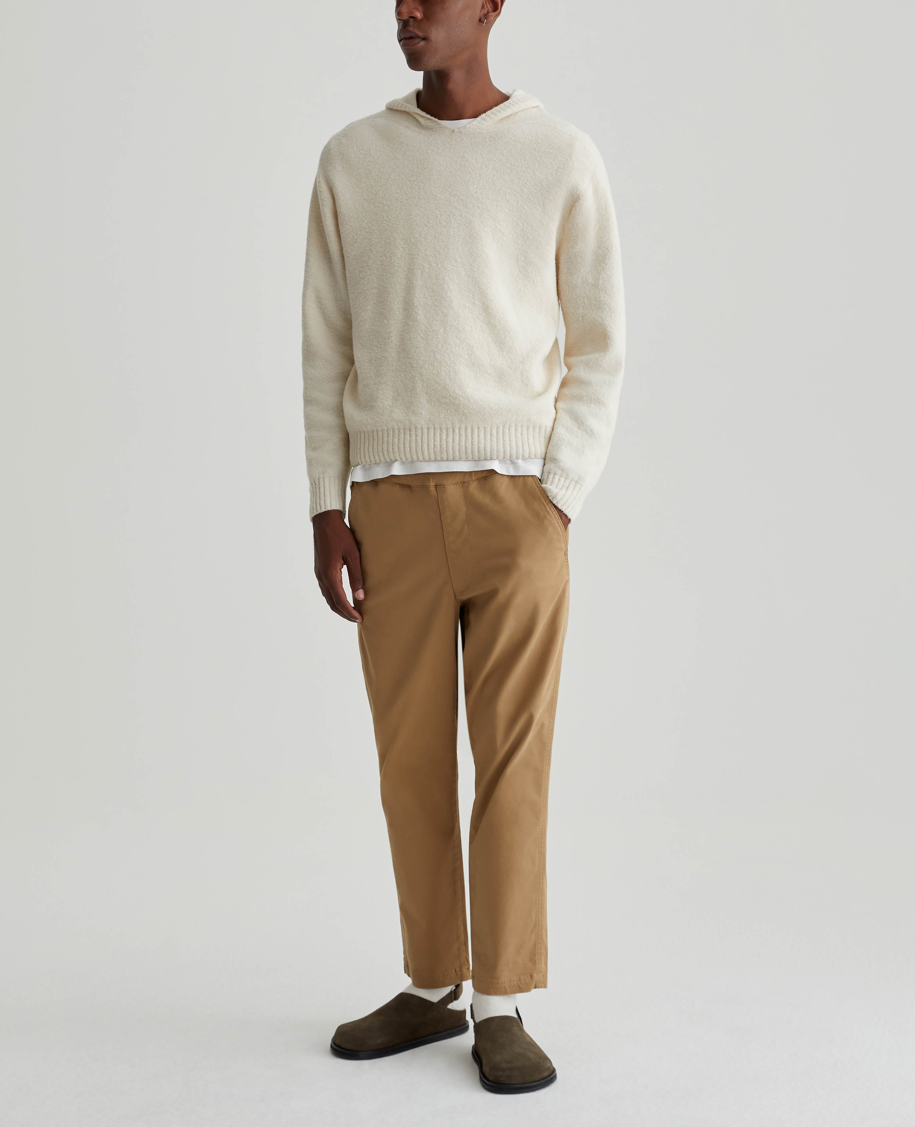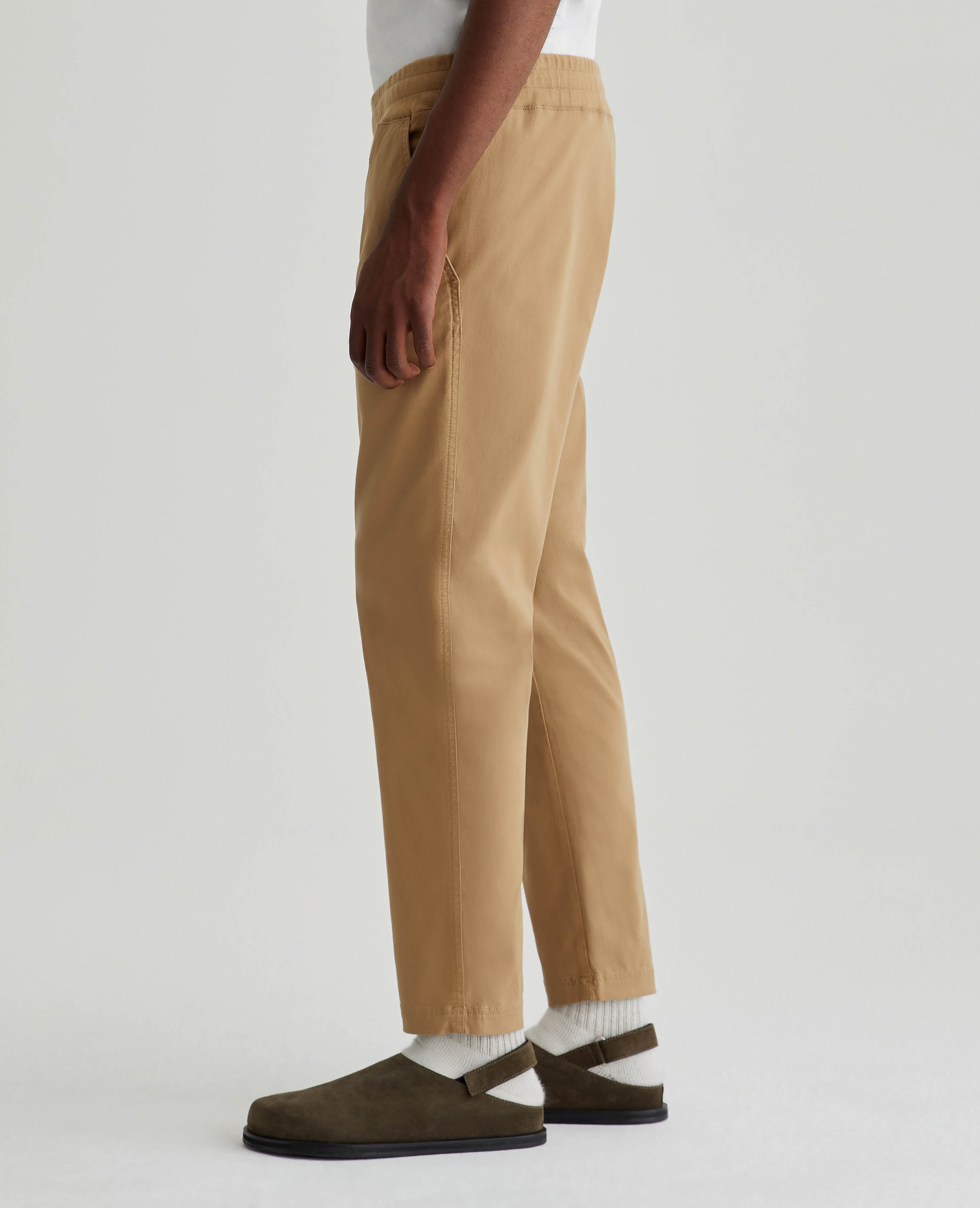 The Wyatt Sweatpant is a comfortable men's jogger updated in a Sorrento Stretch Twill from Italy. Soft and lightweight, these tan pants are relaxed yet slim with an elasticized waist, interior drawstring, and tapered legs.