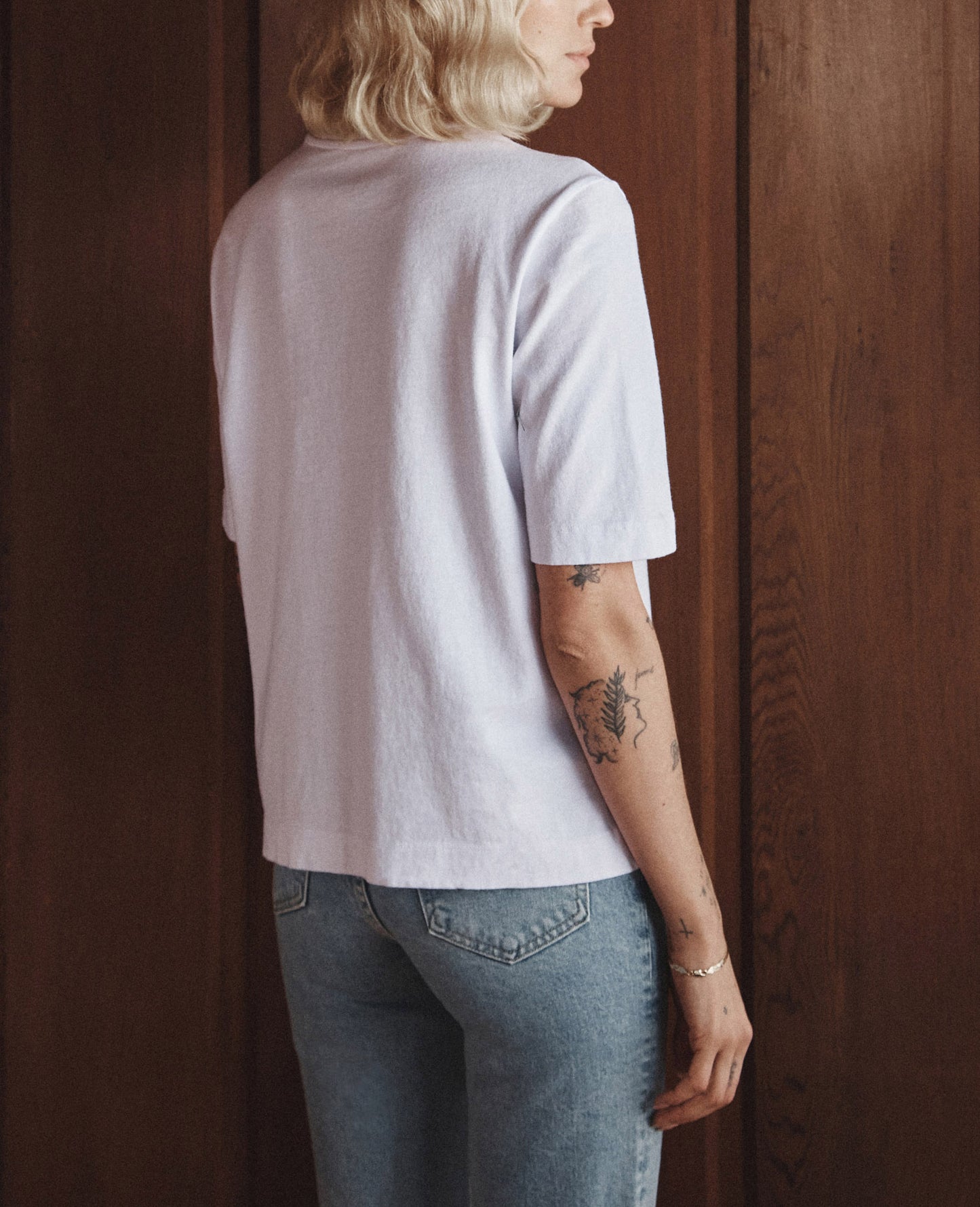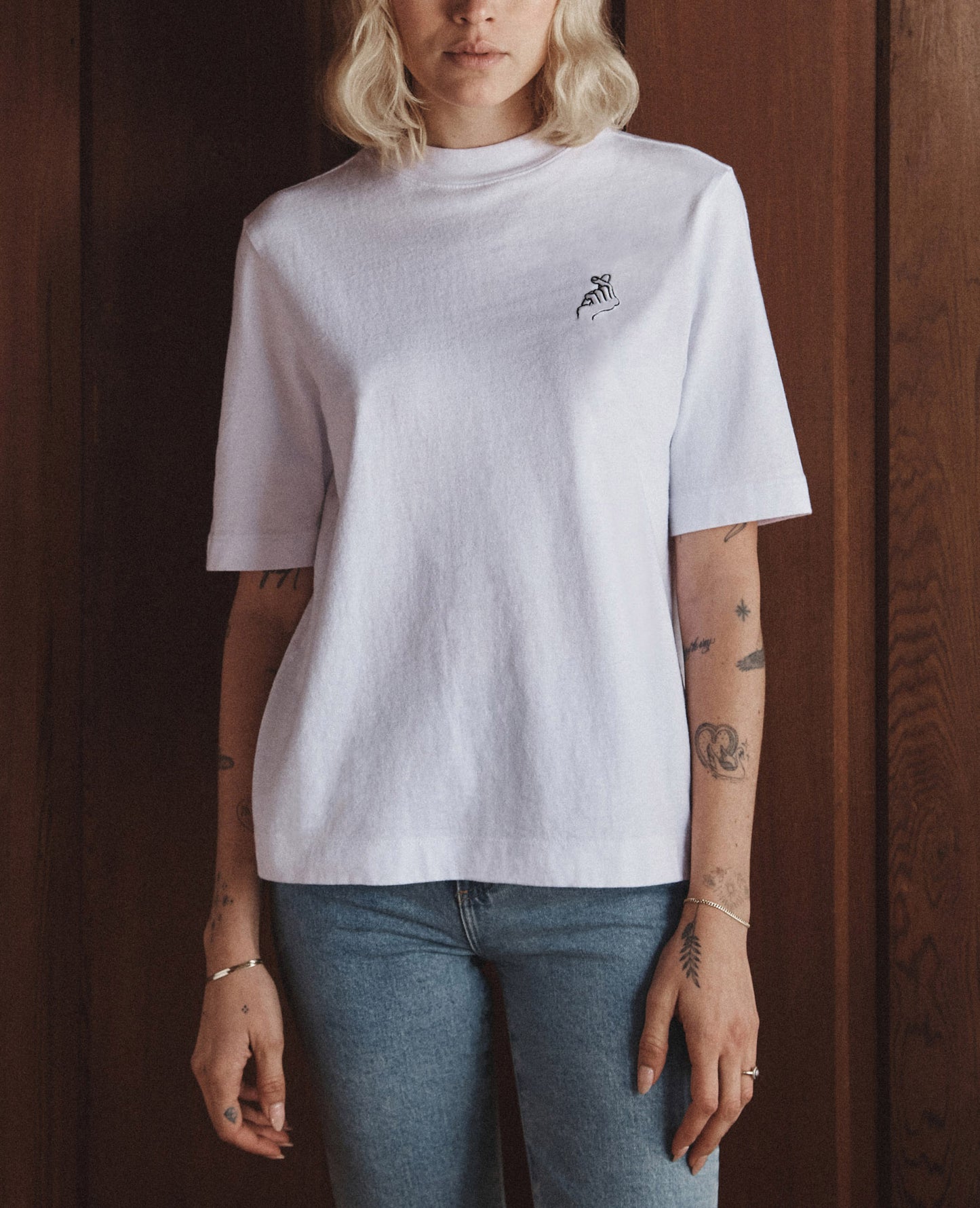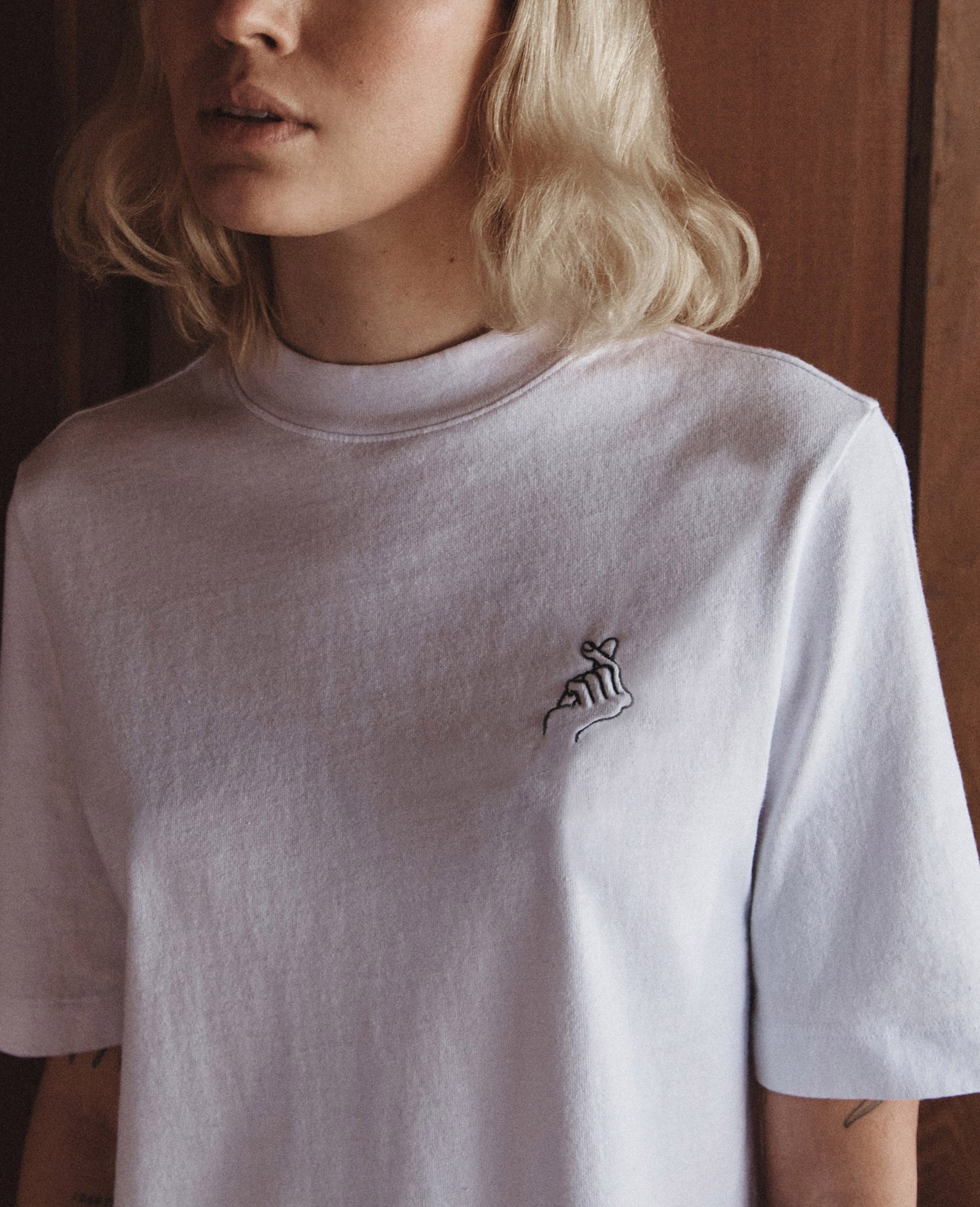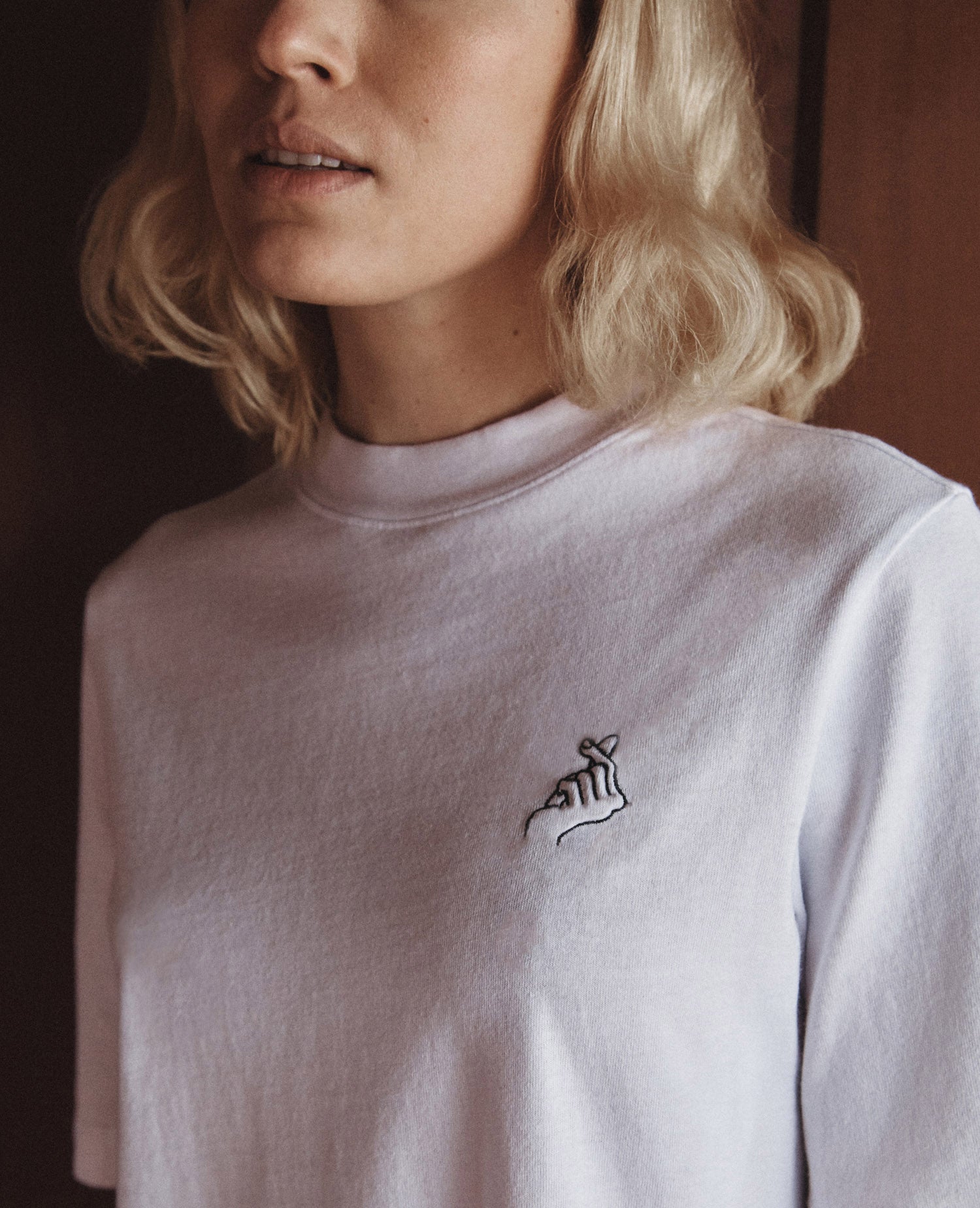 The Finger Heart Yoni Tee for women is an embroidered graphic t-shirt that celebrates the universal language of love. Featuring a crisp white hue, ribbed mock neck, extra long short sleeves, and a boxy silhouette, this women's tee is designed with an embroidered finger heart in a classic 100% cotton fabric for a vintage-inspired effect. With the help of this small but powerful finger heart gesture, we hope to create just one extra way we can all send our love.