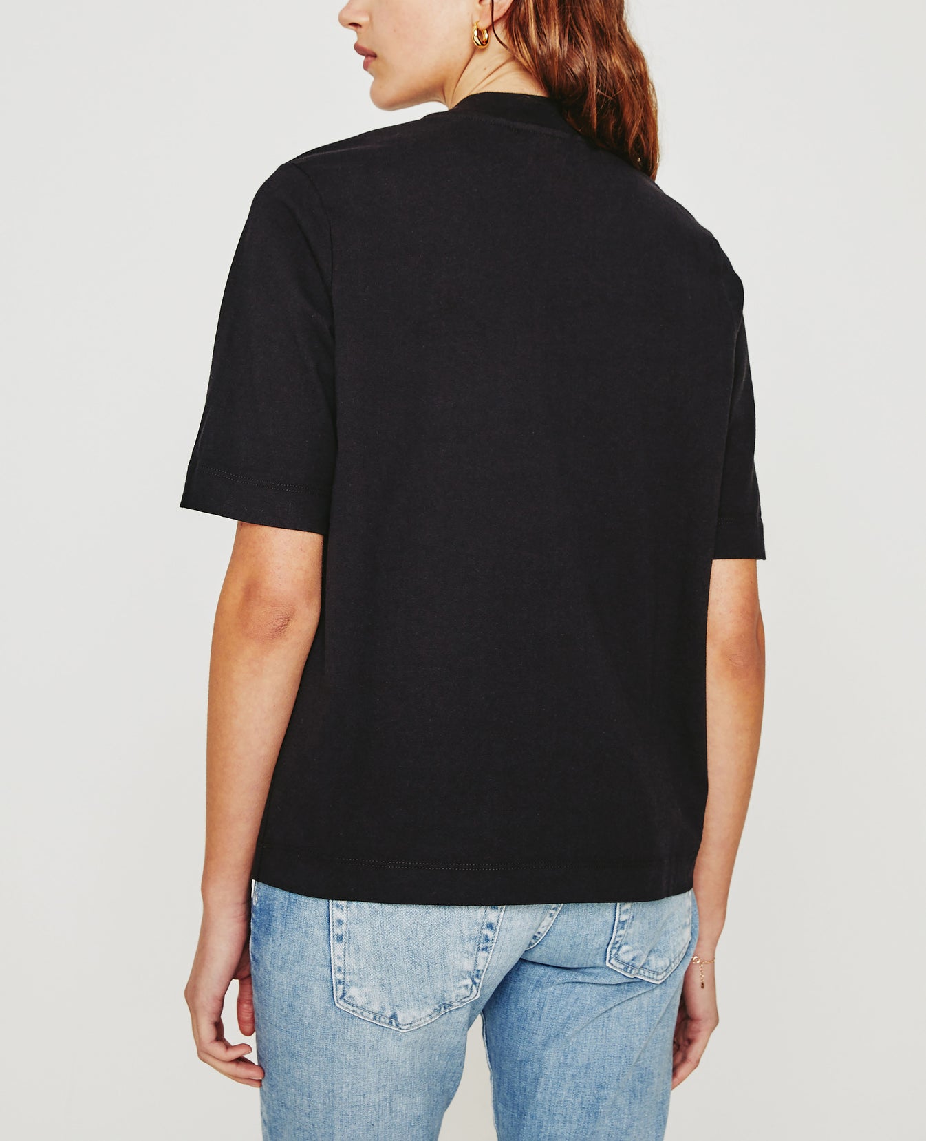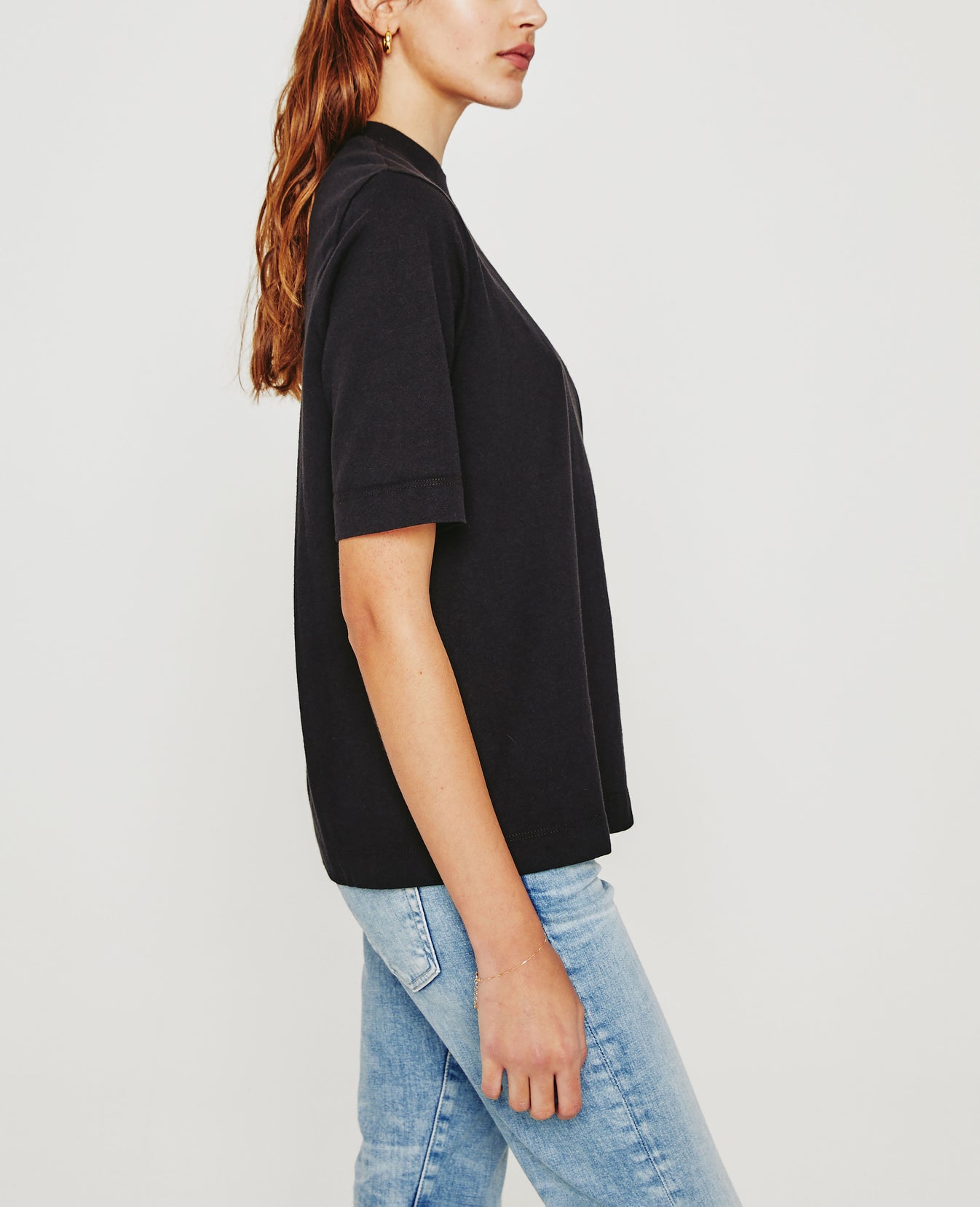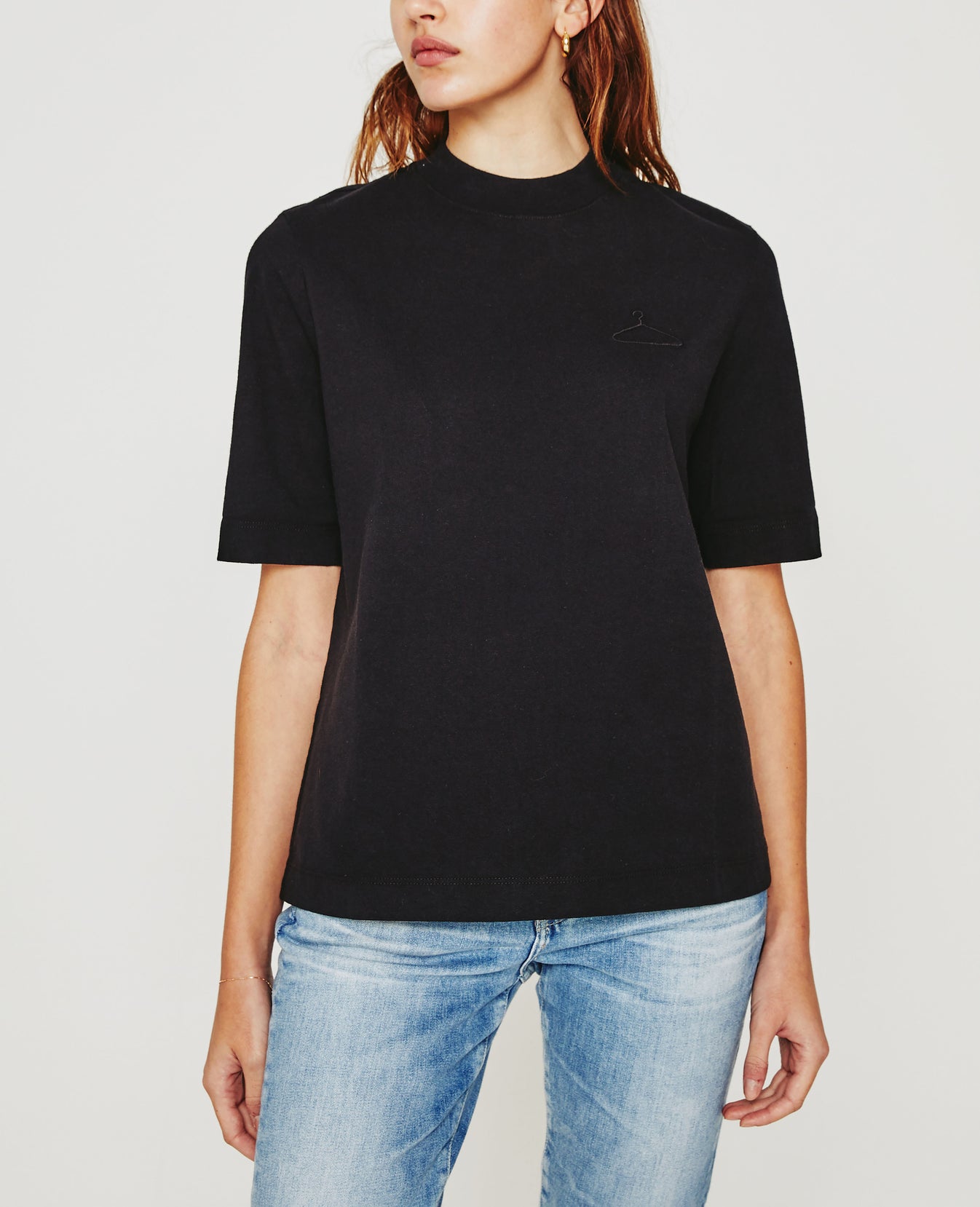The Yoni Tee for women is designed in a 100% cotton fabric featuring a black hue, ribbed mock neck, extra long short sleeves, and a boxy silhouette. This Yoni tee is part of our B-Type collection.