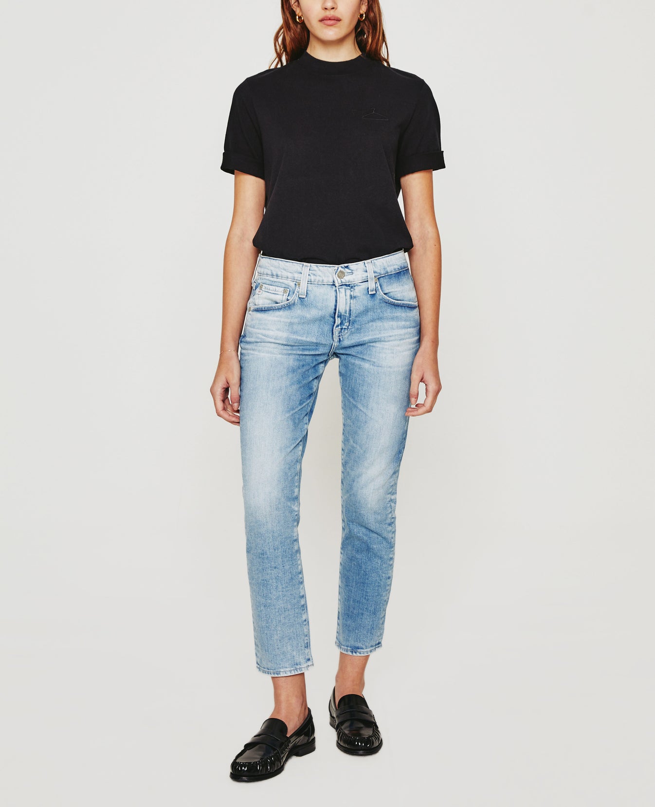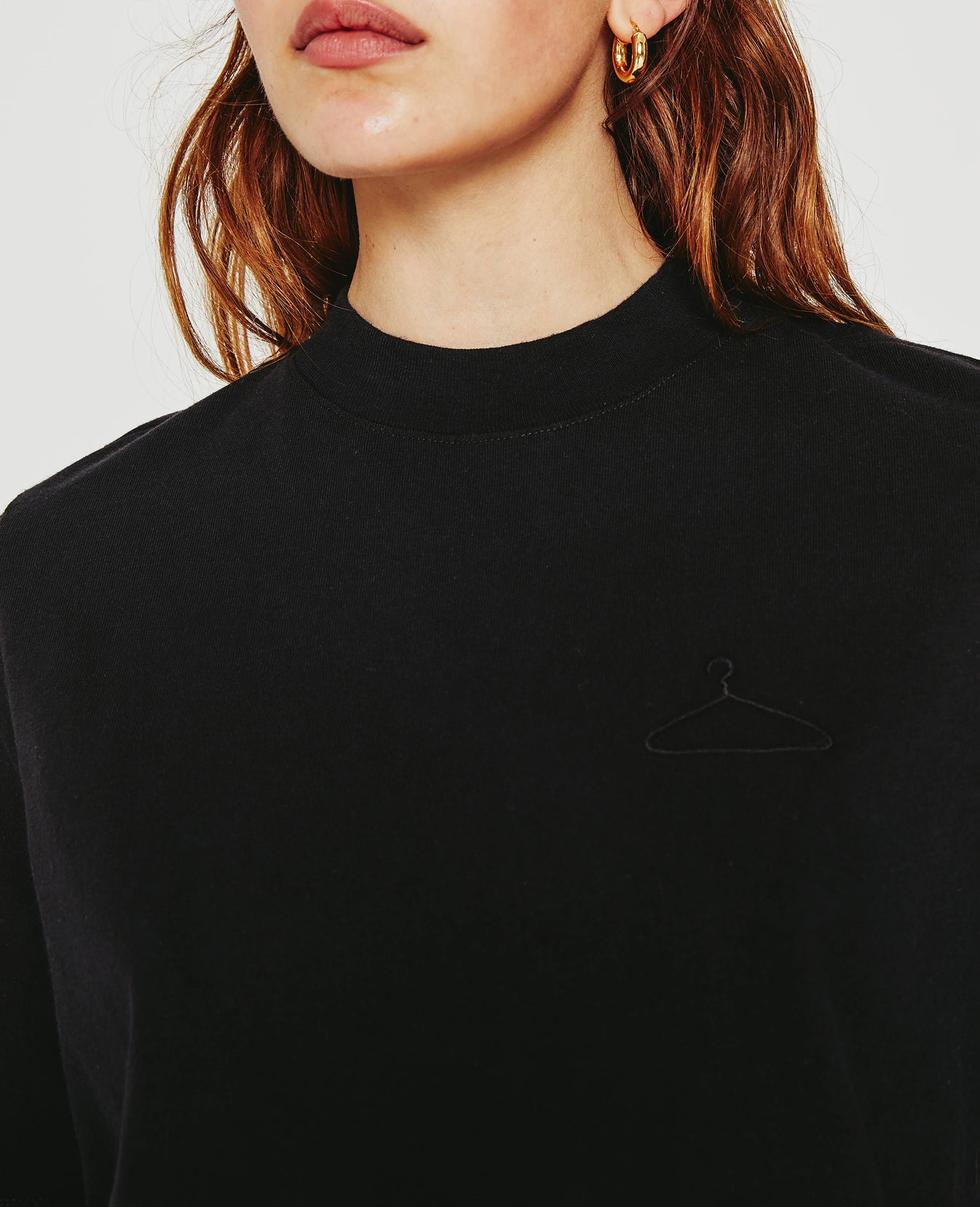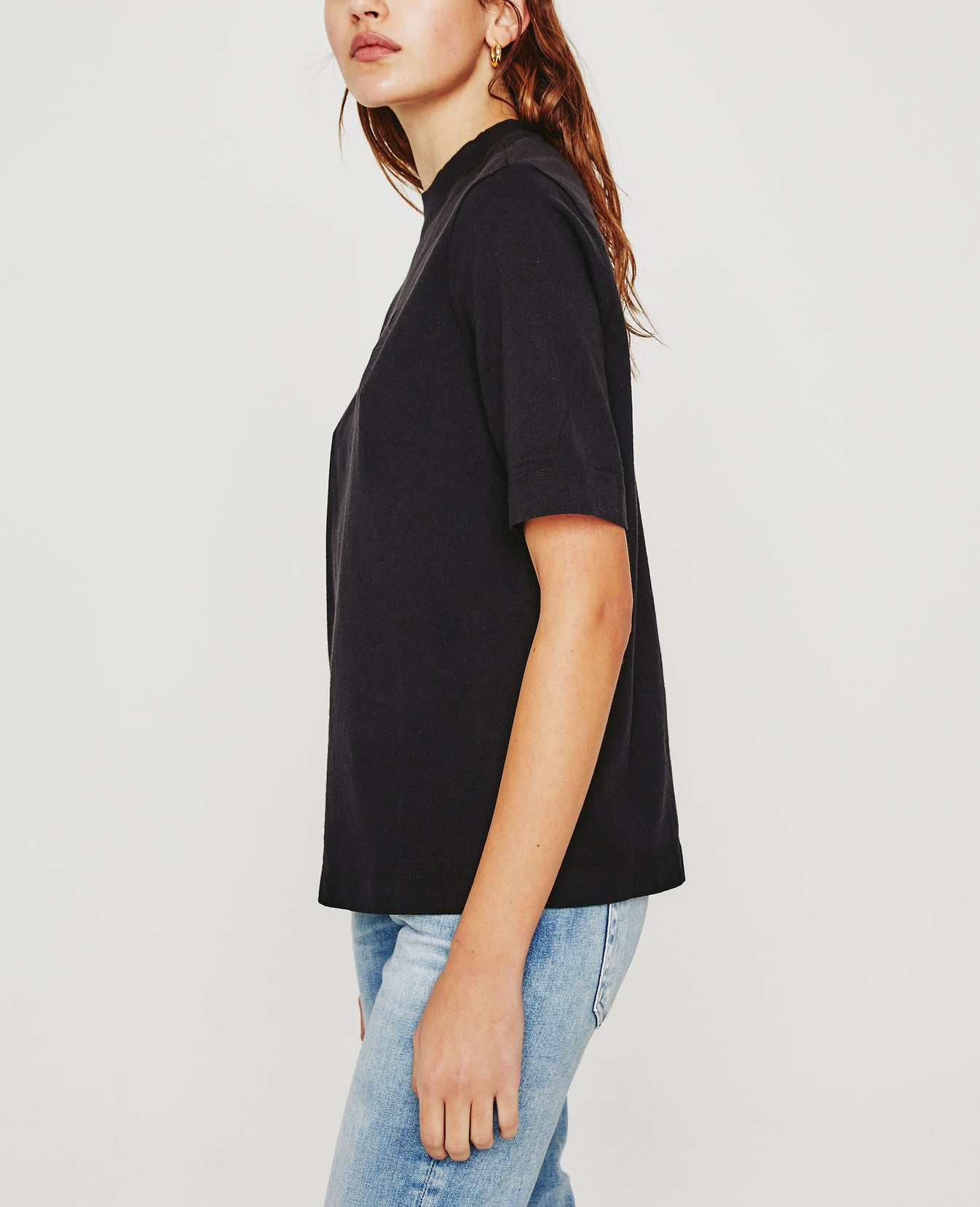 The Yoni Tee for women is designed in a 100% cotton fabric featuring a black hue, ribbed mock neck, extra long short sleeves, and a boxy silhouette. This Yoni tee is part of our B-Type collection.
