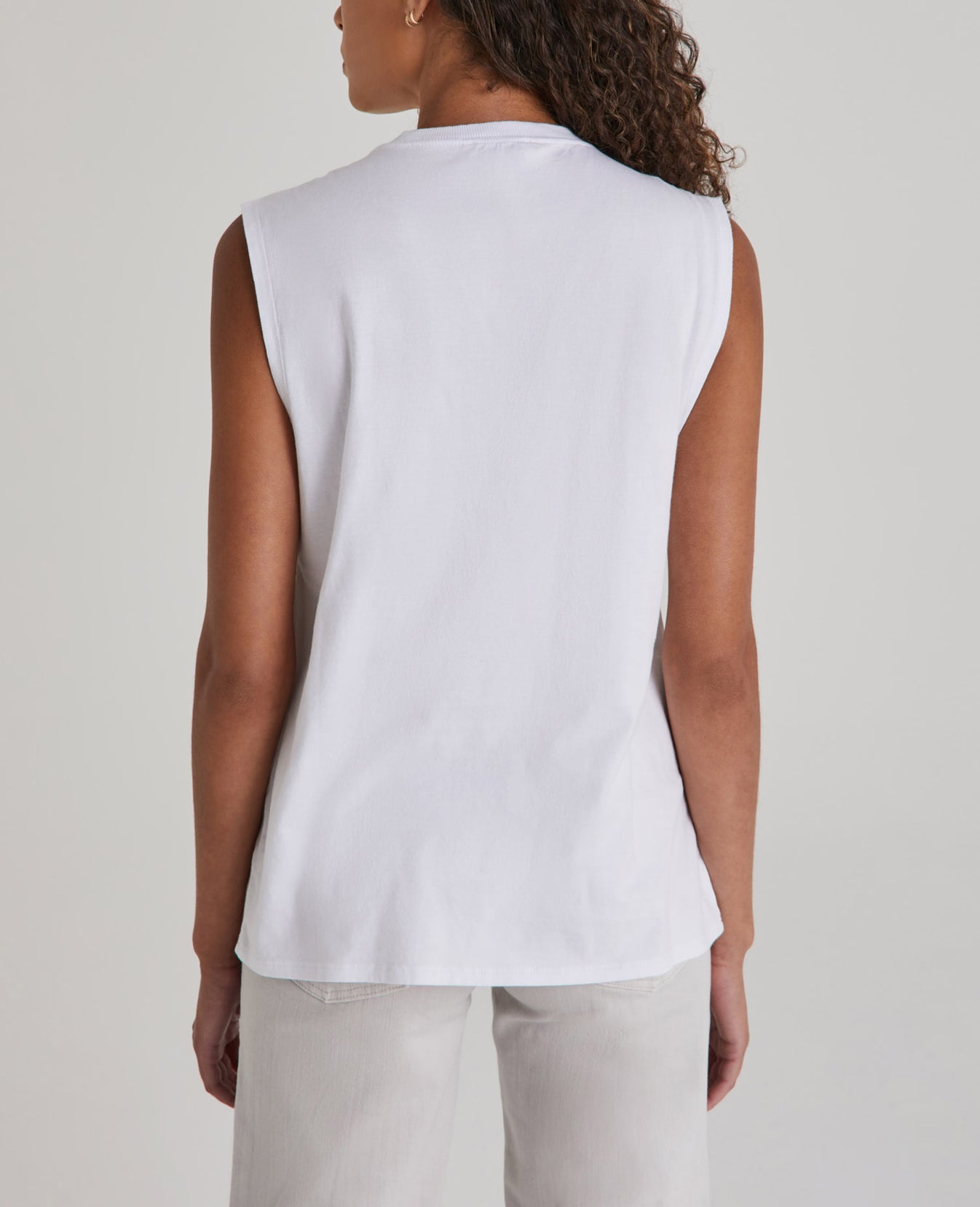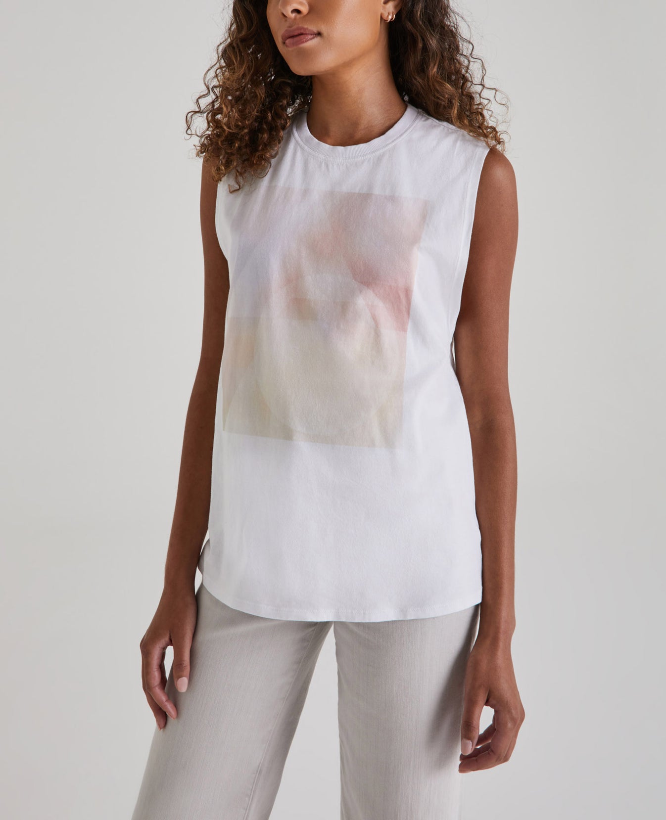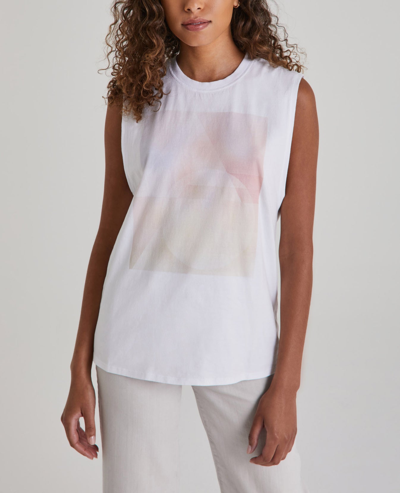 The Zoey Muscle Tank is a sleeveless top for women featuring a vintage white with subtle flecking and retro prism graphics at the front.The Zoey offers a classic crew neck line, extra wide arm openings, and double-tuck seam detailing at the back. This women’s tank top is designed in a lightweight fabric made from a pima cotton blend for a durable, ultra-smooth feel with wrinkle-resistant properties.